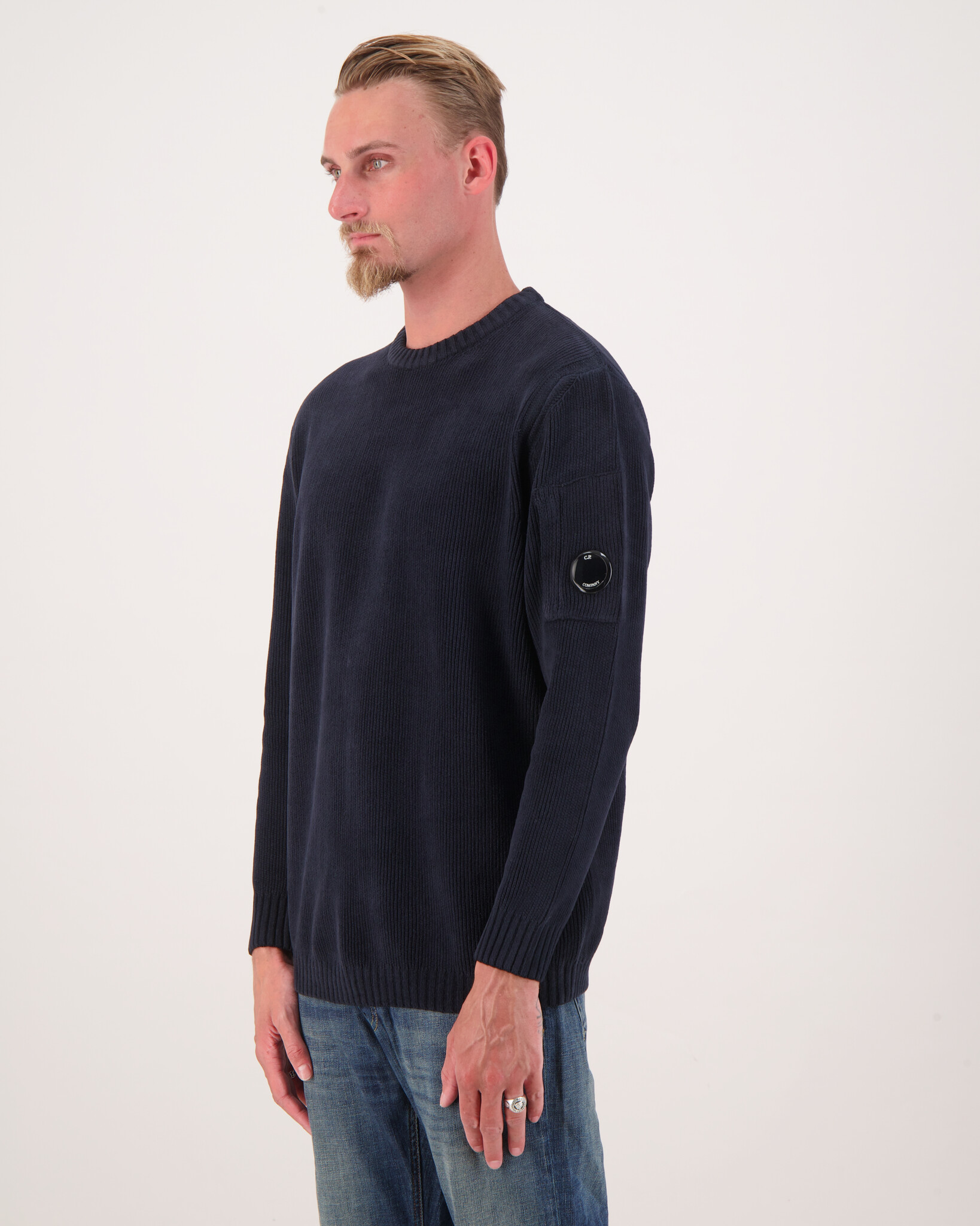 Blau Chenille Baumwolle Strickwaren von der Marke C.P. Company. Der Strickpullover hat eine Tasche mit dem bekannten C.P.-Goggle-Logo auf dem Ärmel.