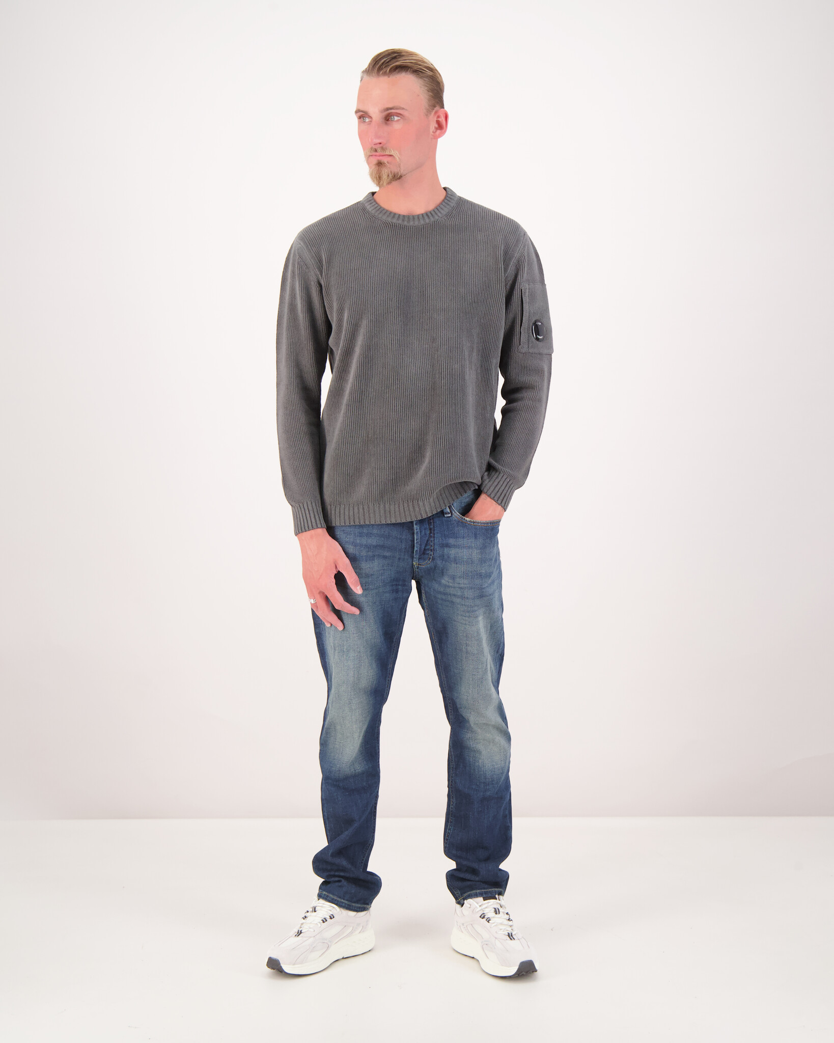 Dunkel grau Chenille Baumwolle Strickwaren von der Marke C.P. Company. Der Strickpullover hat eine Tasche mit dem bekannten C.P.-Goggle-Logo auf dem Ärmel.