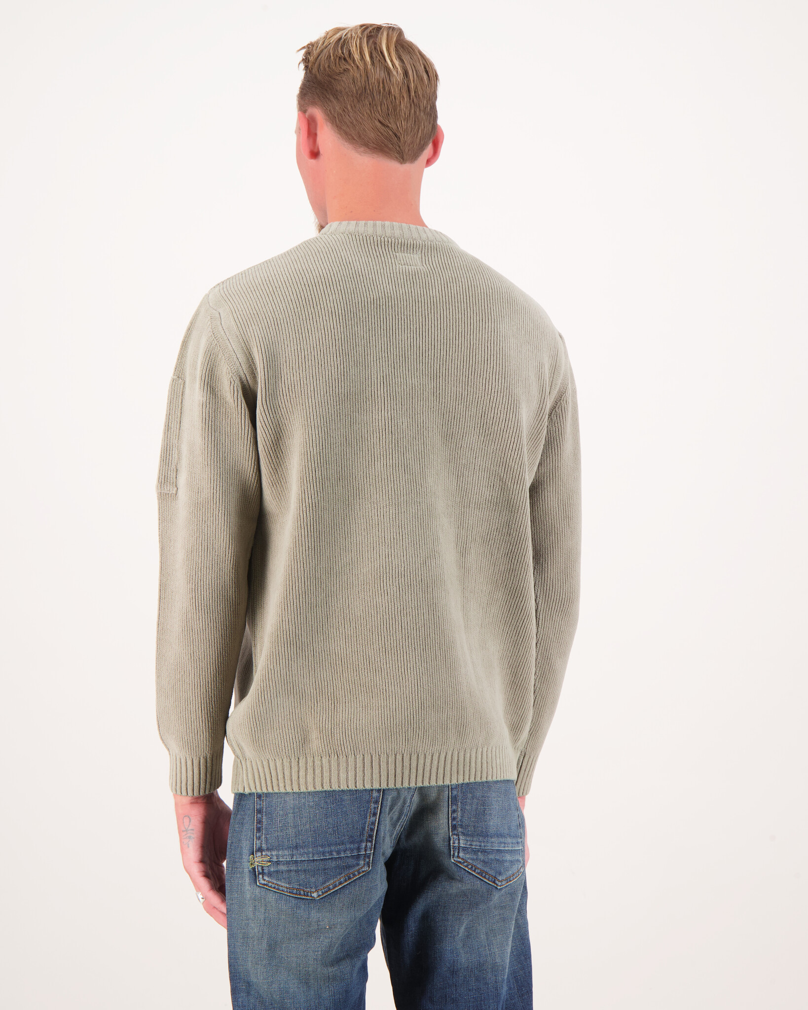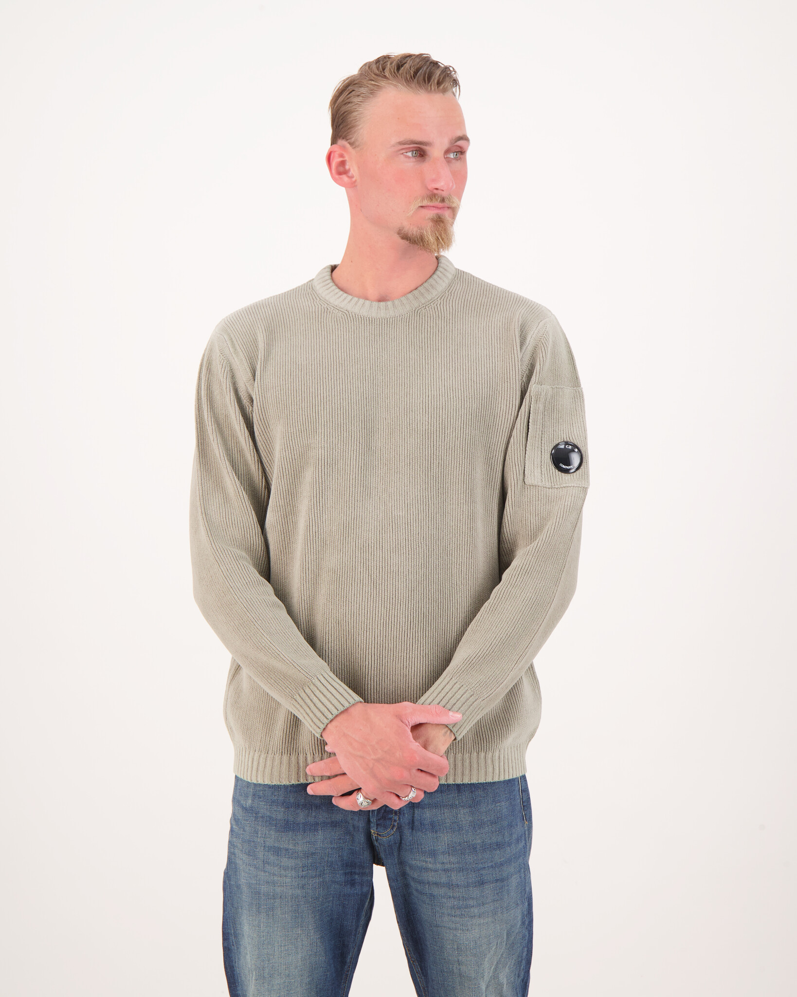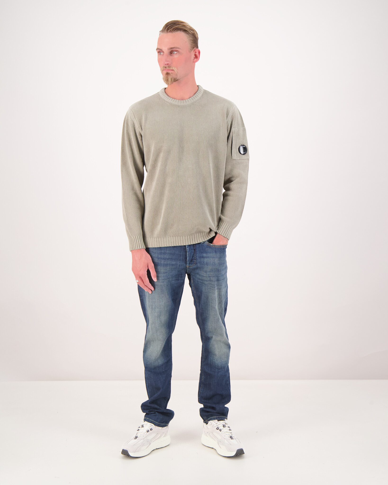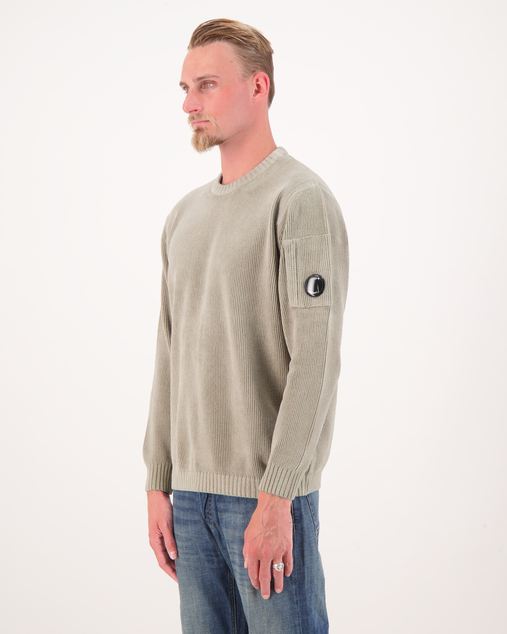 Grau Chenille Baumwolle Strickwaren von der Marke C.P. Company. Der Strickpullover hat eine Tasche mit dem bekannten C.P.-Goggle-Logo auf dem Ärmel.