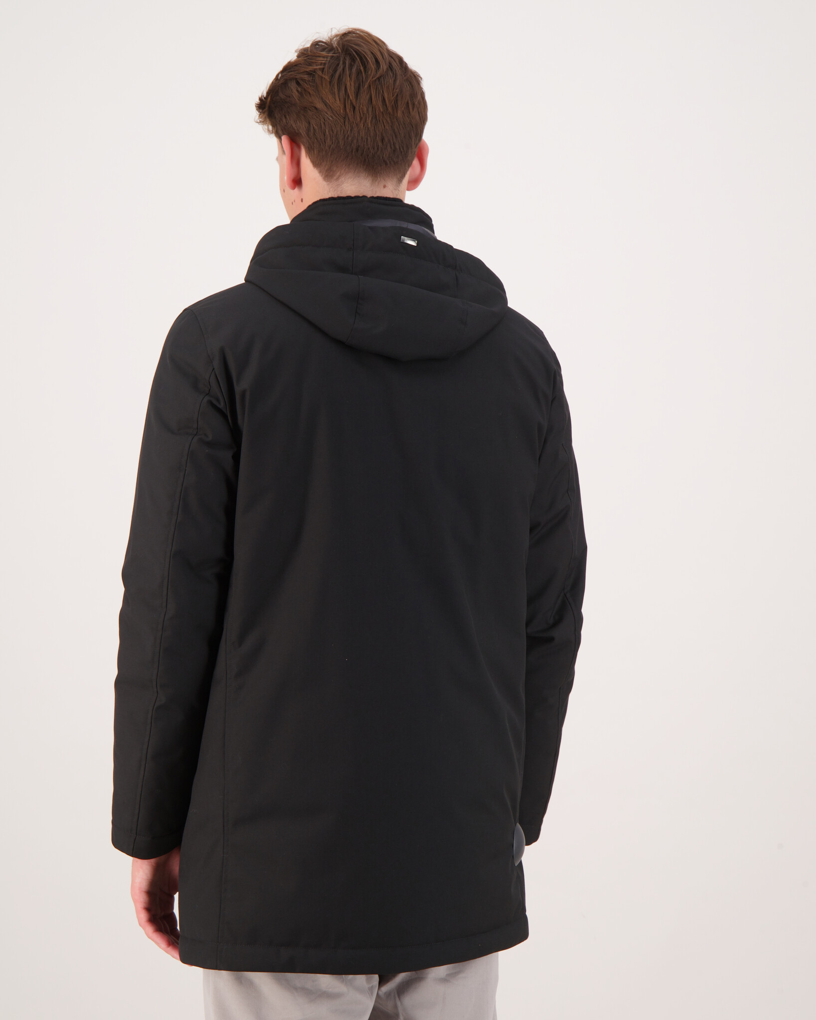 Das Model ist 1,90 m groß, wiegt 79 kg und trägt Größe 50.
