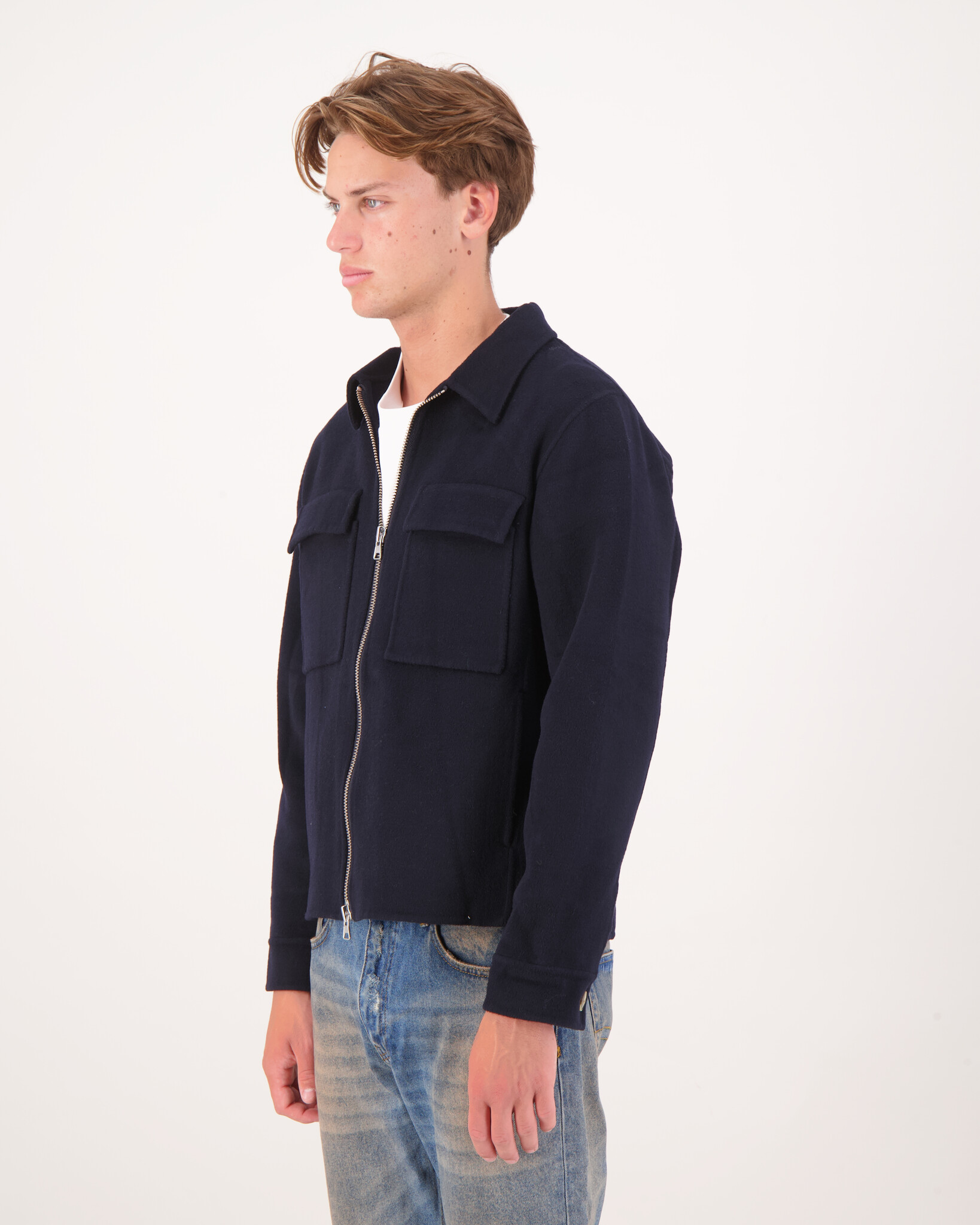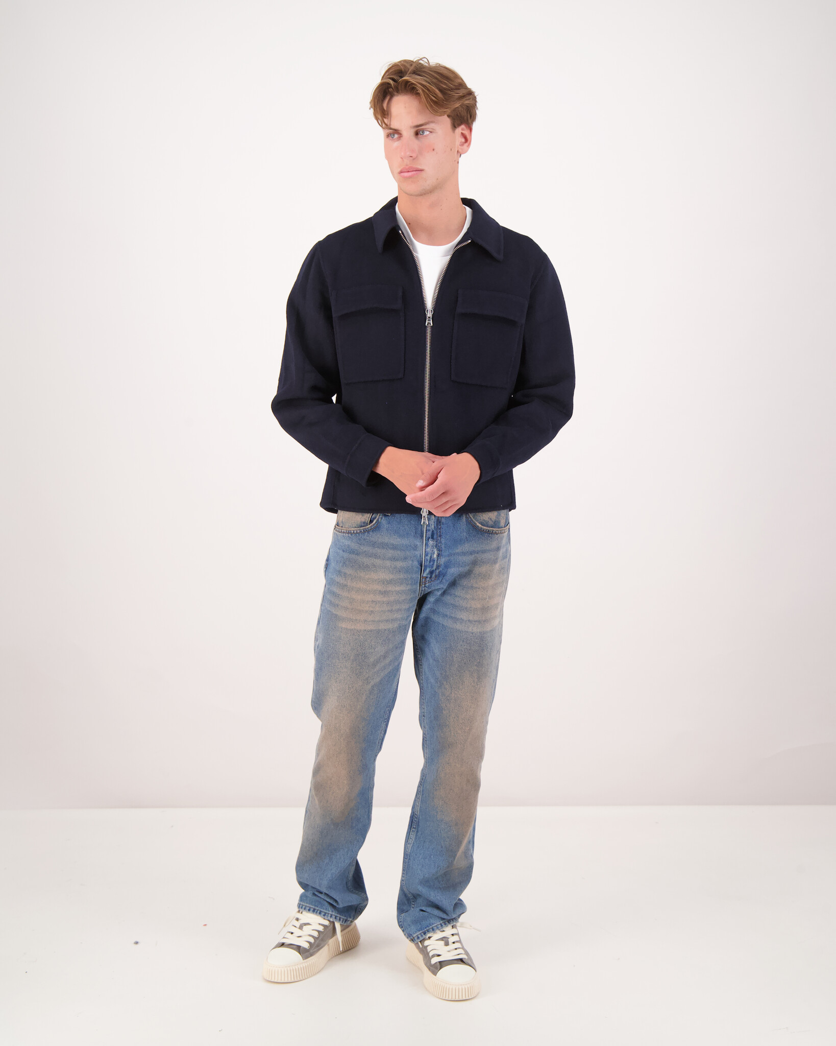 Das Model ist 1, 90m groß, wiegt 79kg und trägt Größe L.