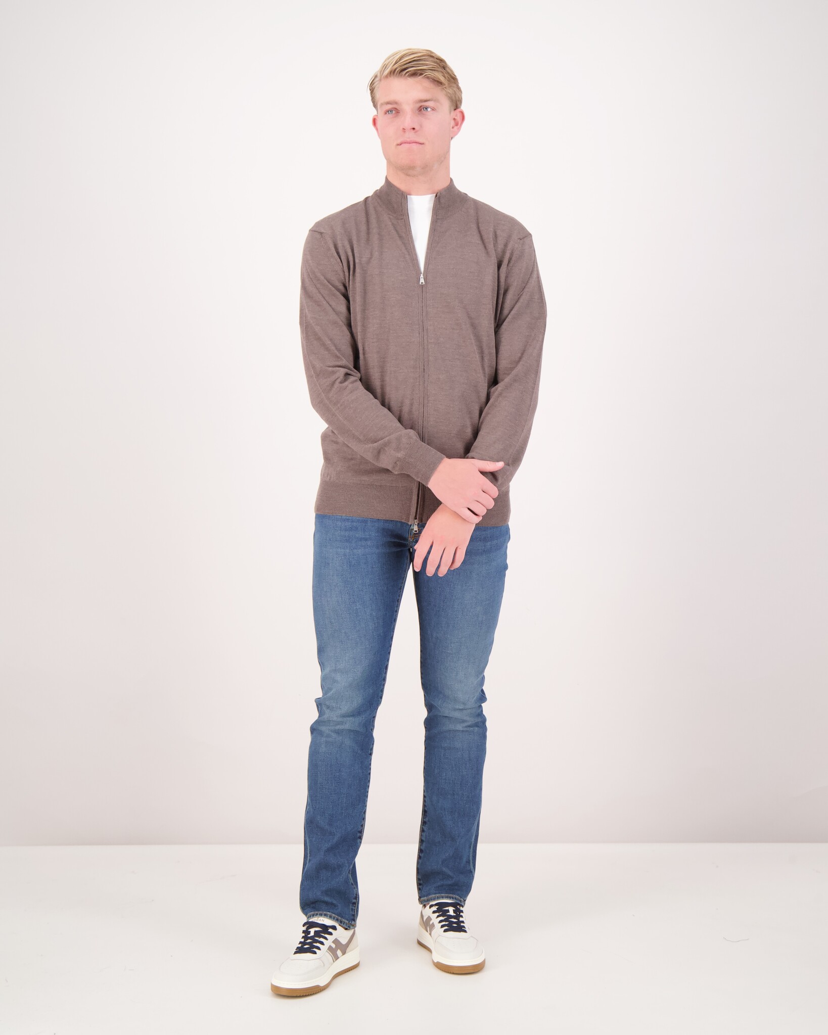 The model is 1.86 cm tall, weighs 82 kg, and is wearing a size W34.