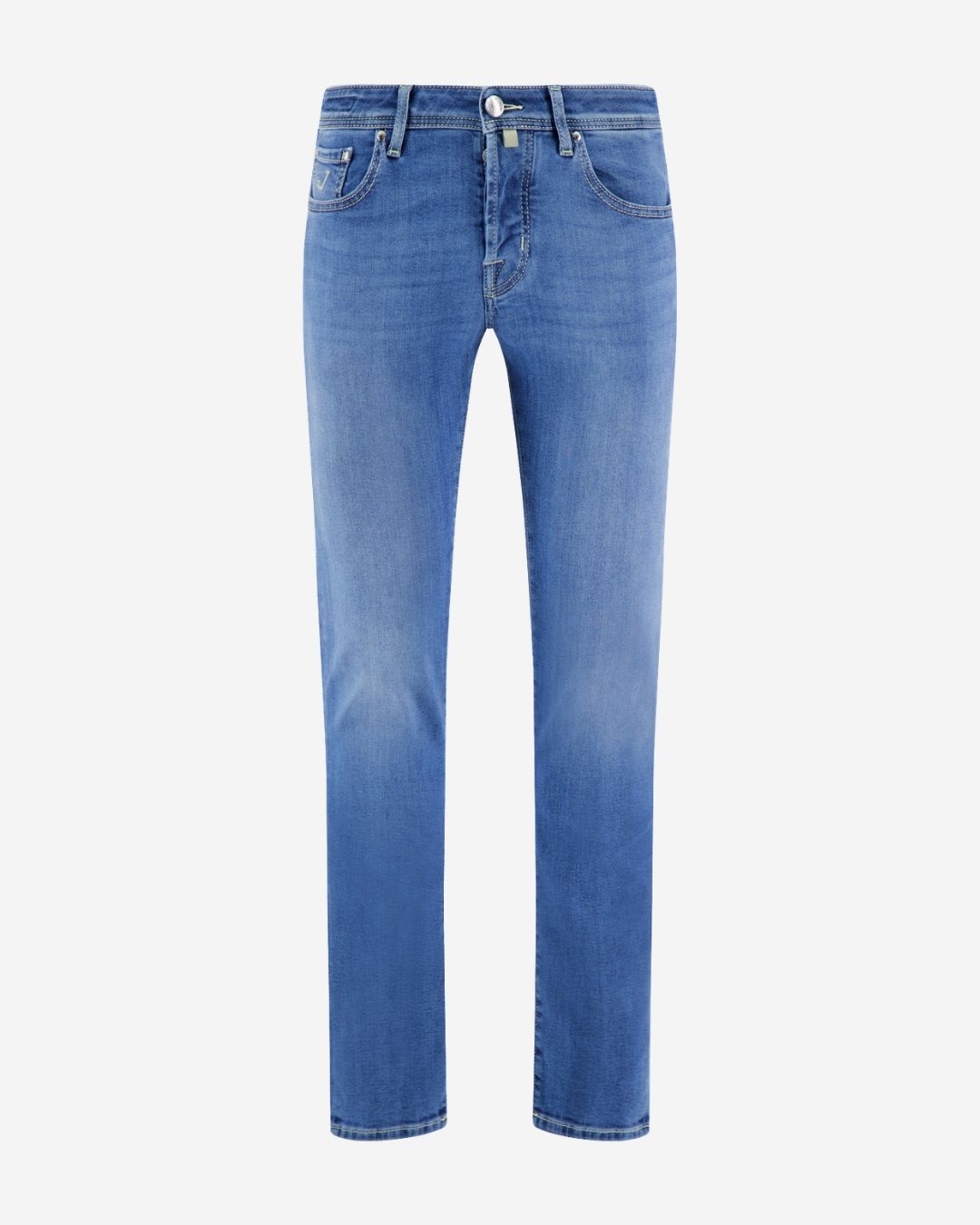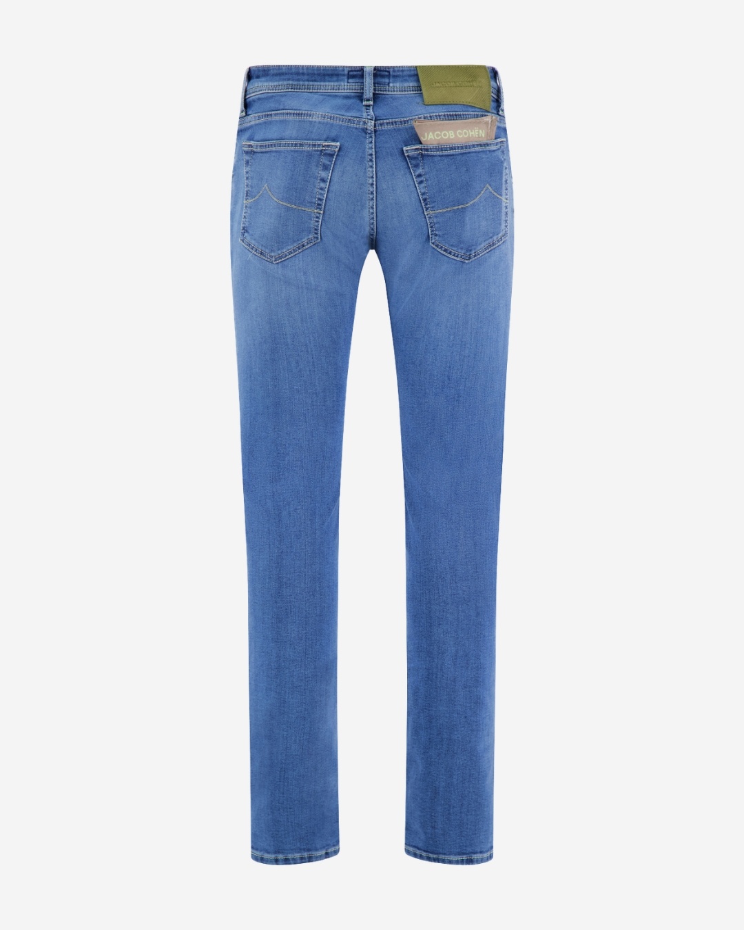 The jeans have a slim fit and a beige hairy logo label on the back.