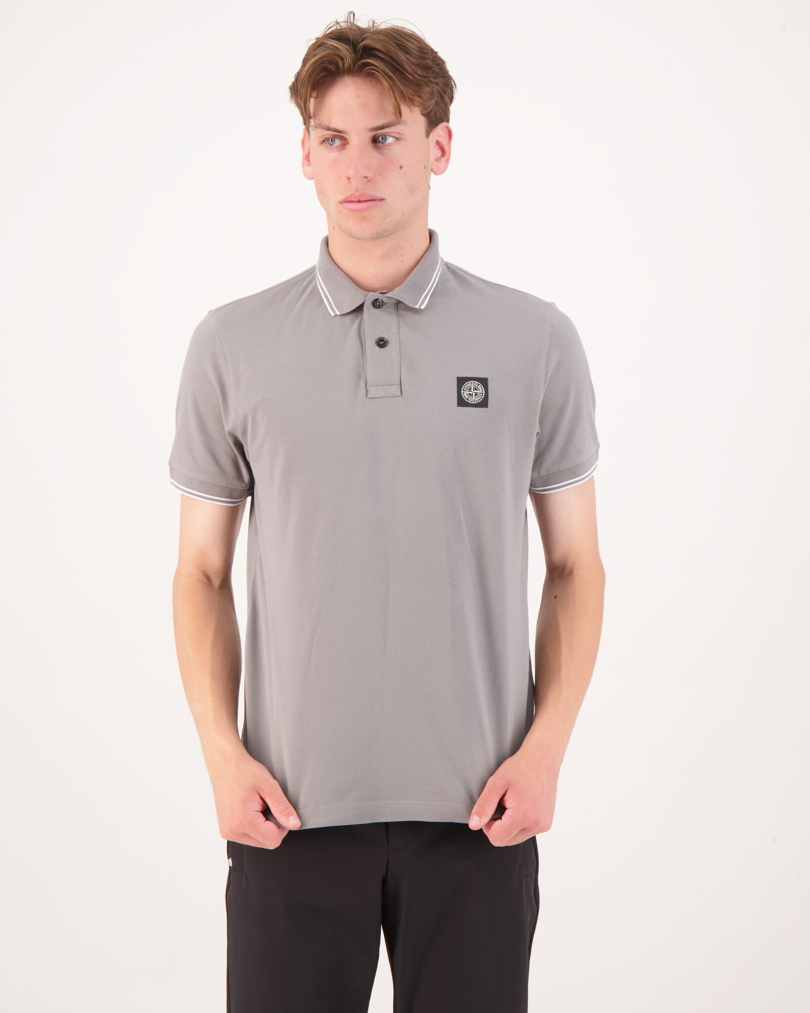 Material: Garment: 95% Cotton, 5% Elastane/Spandex. Collar Rib: 97% Cotton, 3% Polyester. Cuff Rib: 96% Cotton, 4% Polyester.