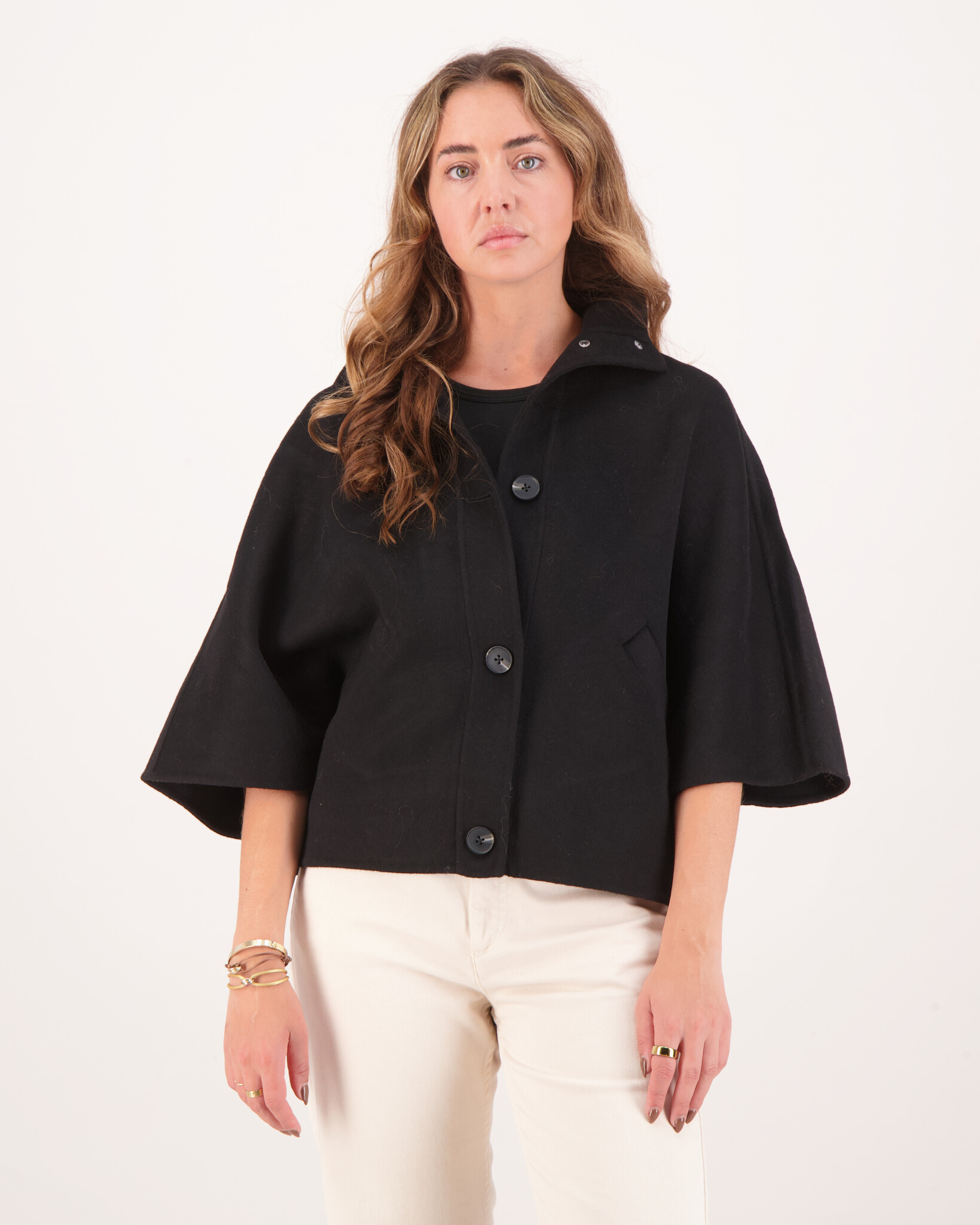 Moderne, kort vallende jas met een elegante opstaande kraag en korte mouwen. De Liv Jas heeft een minimalistisch silhouet en een rechte pasvorm die losjes om het lichaam valt. Voorzien van een knoopsluiting aan de voorzijde en twee steekzakken. Ideaal als stijlvolle overgangsjas in het voor- of najaar.