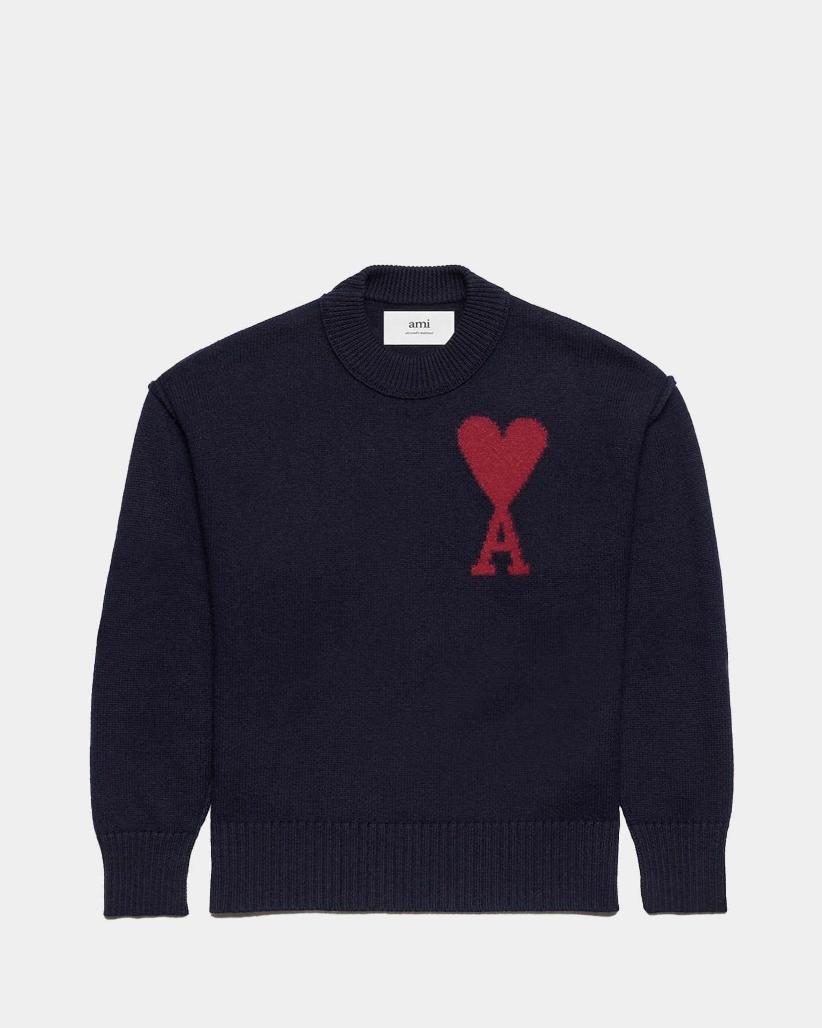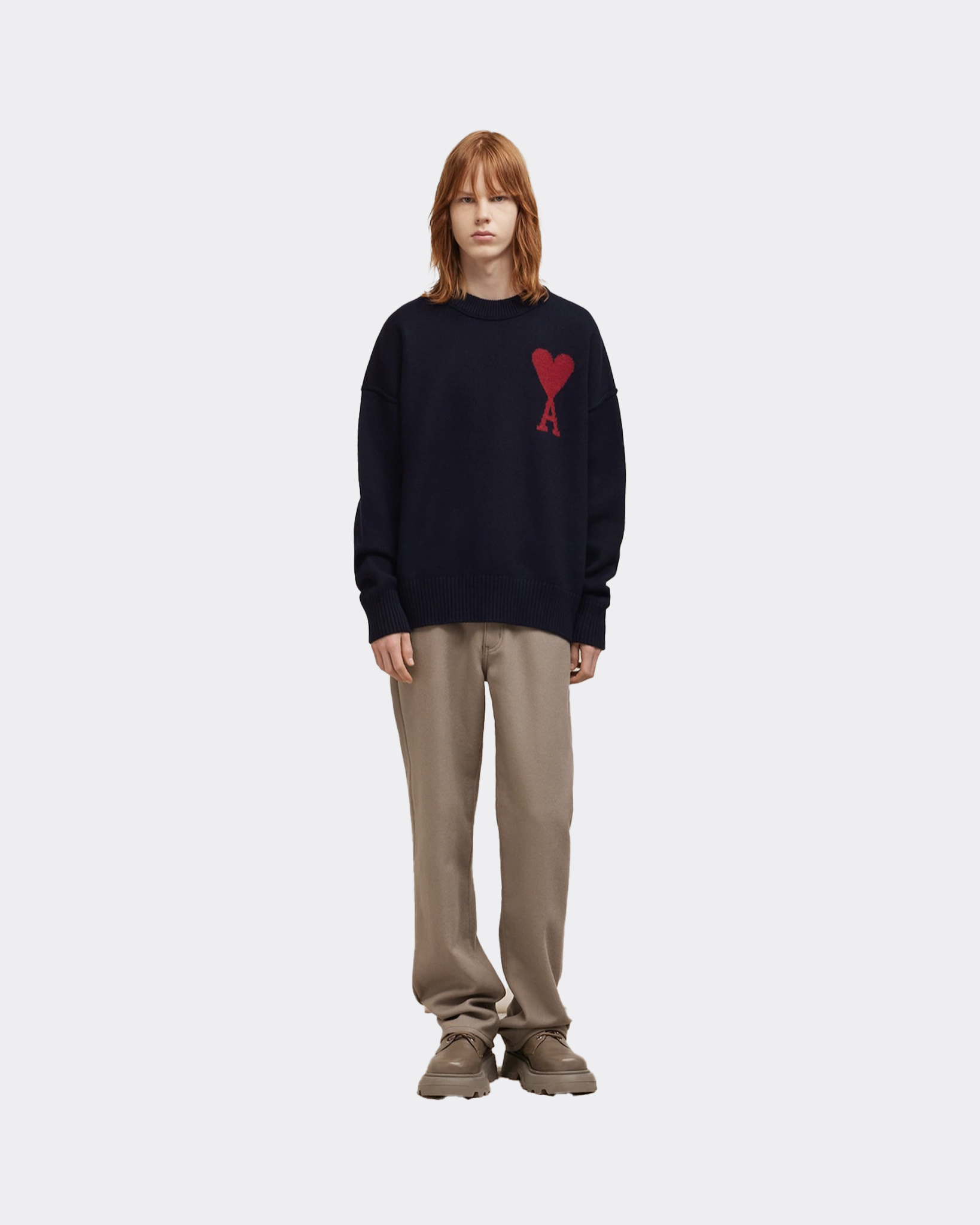 Marine ADC Crewneck Sweater van het merk Ami Paris. De Sweater heeft lange mouwen, in de nek de merk naam gestikt en op de borst het bekende rode hart logo geborduurd.