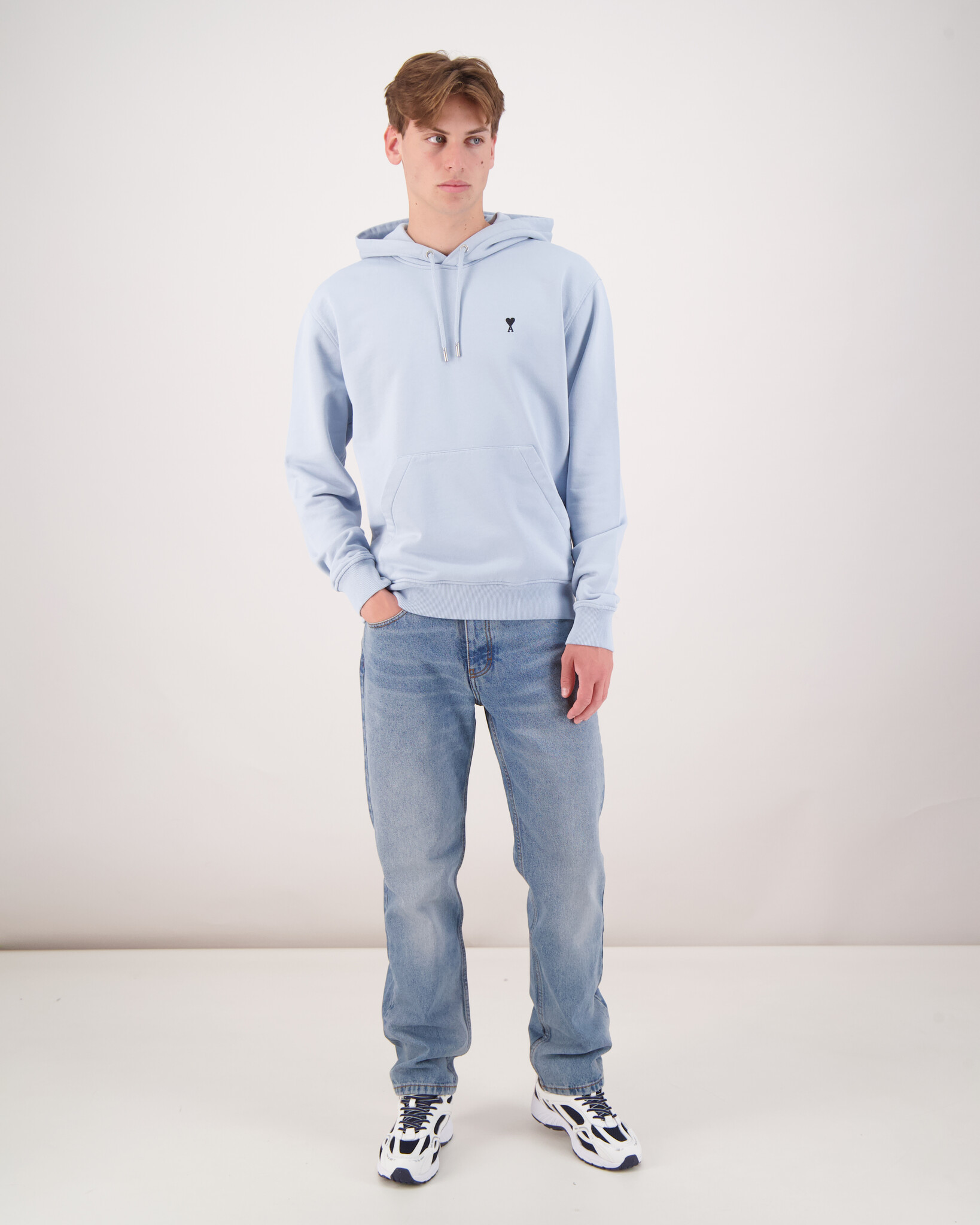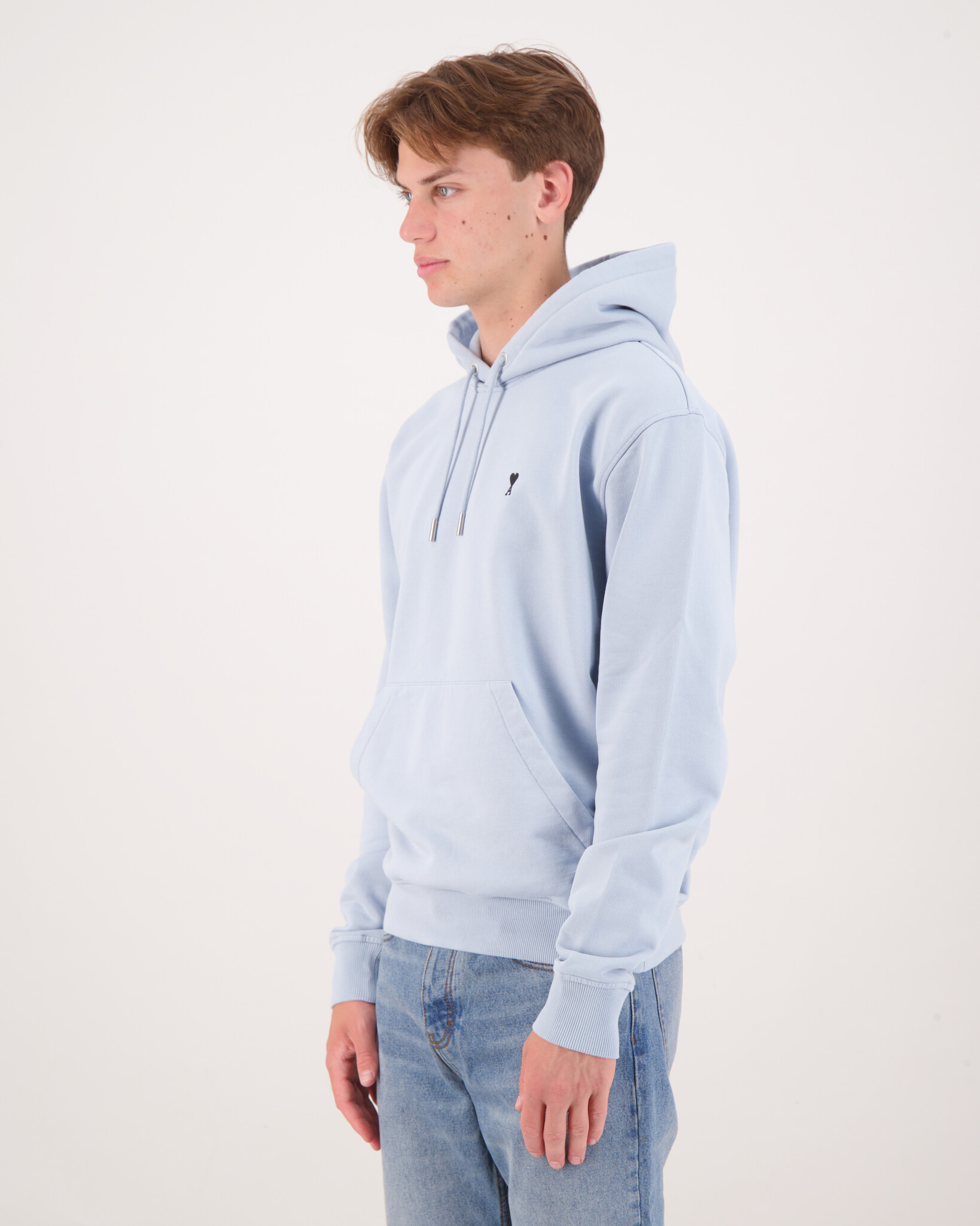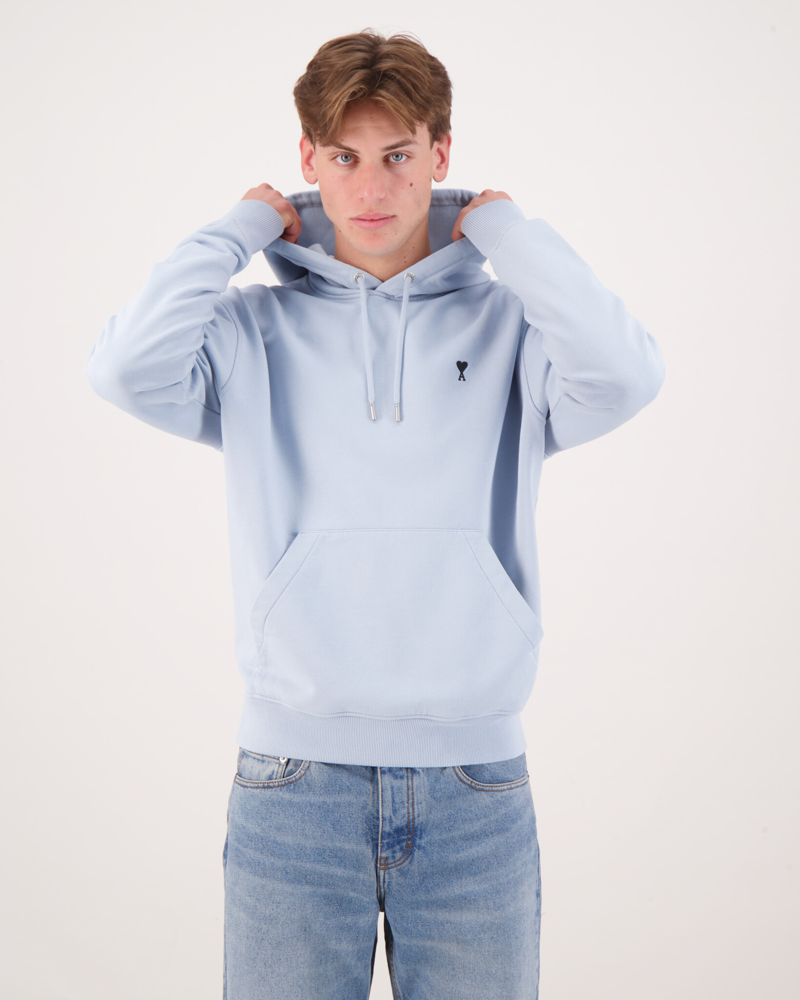 De capuchon is gevoerd met een trekkoord, wat extra comfort en draagbaarheid biedt. Op de voorkant prijkt het kenmerkende Ami de Coeur‑logo, fijn geborduurd en rustend subtiel op de borst – een ingetogen, maar herkenbaar merkdetail.