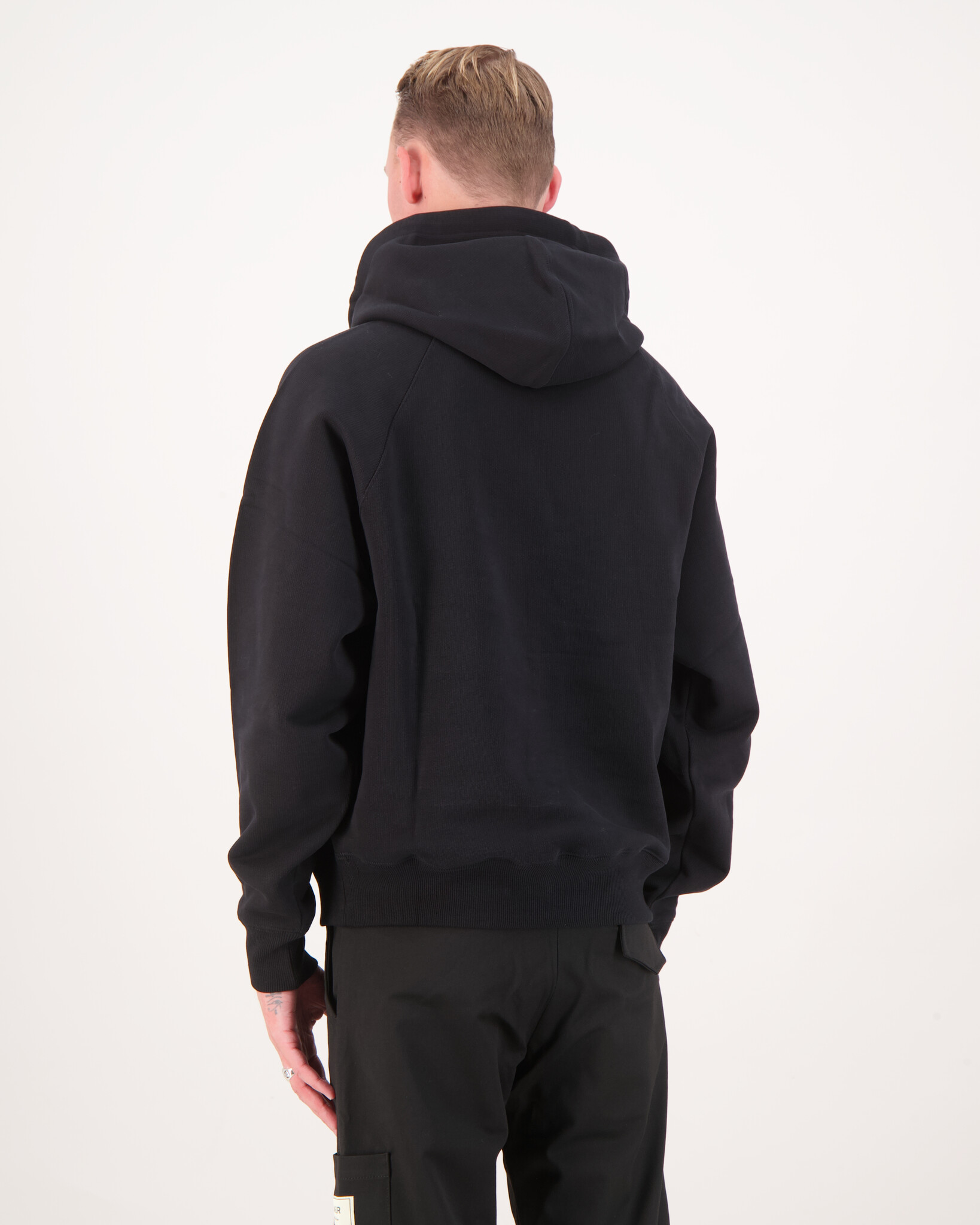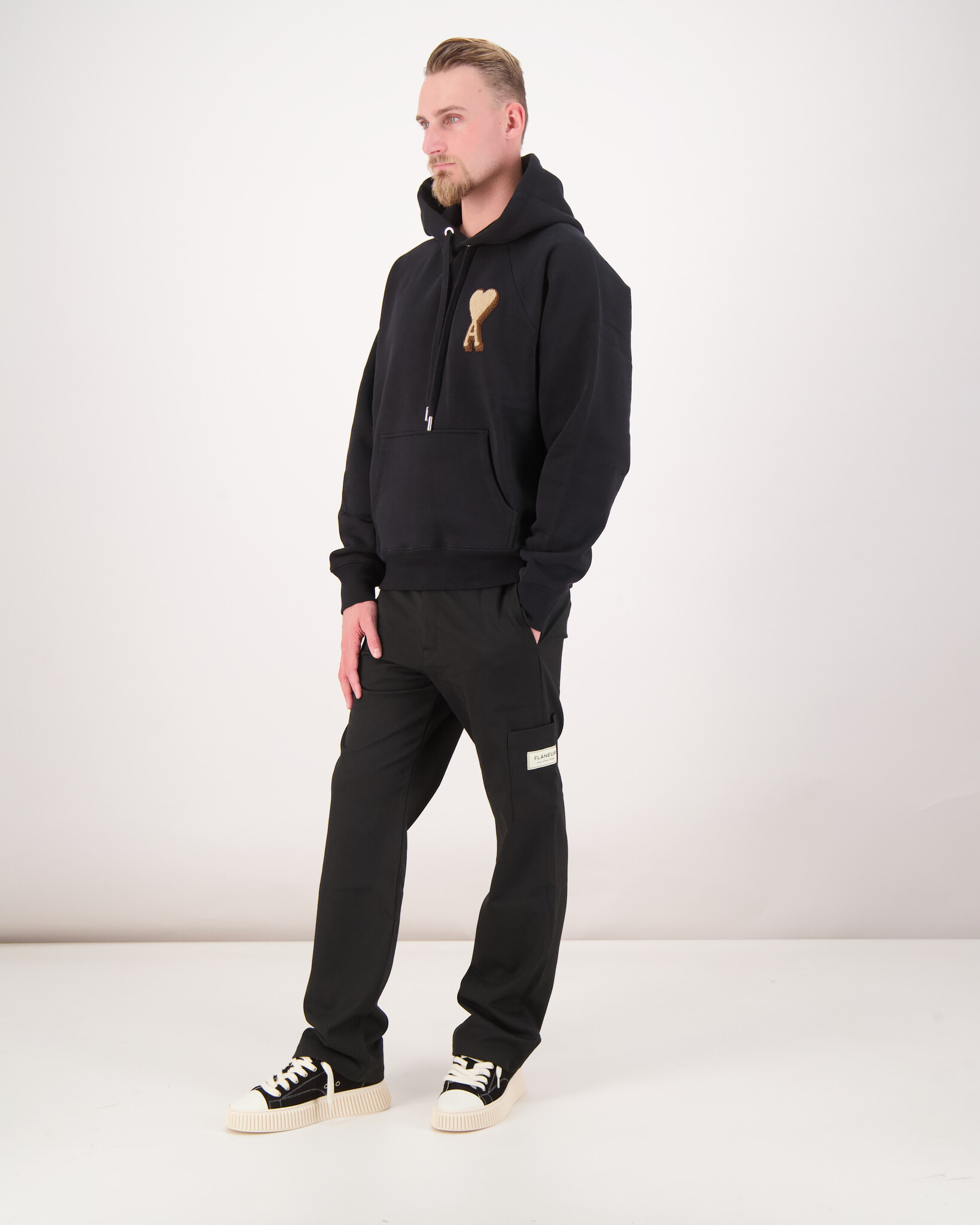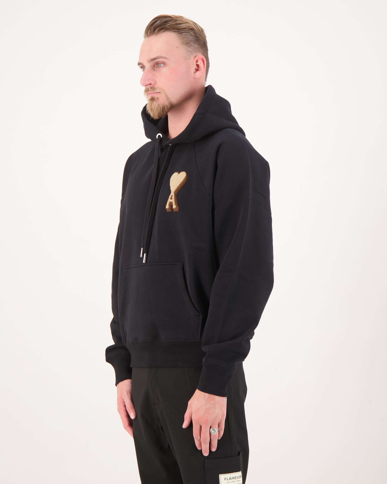 Zwarte ADC Patch Hoodie van het merk Ami Paris. De hoodie heeft het capuchon en een aantrekkoort met het grote bekende A logo op de borst.