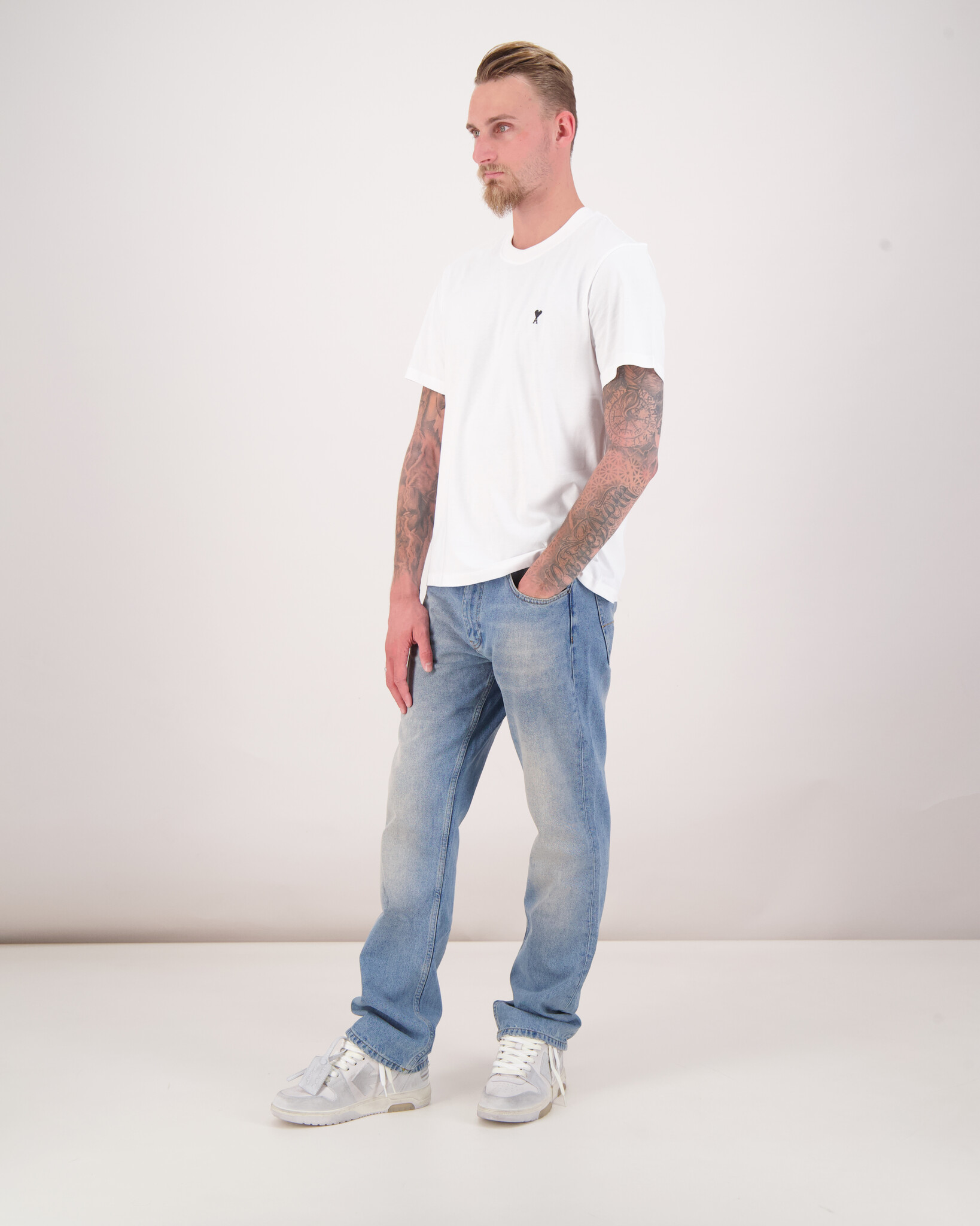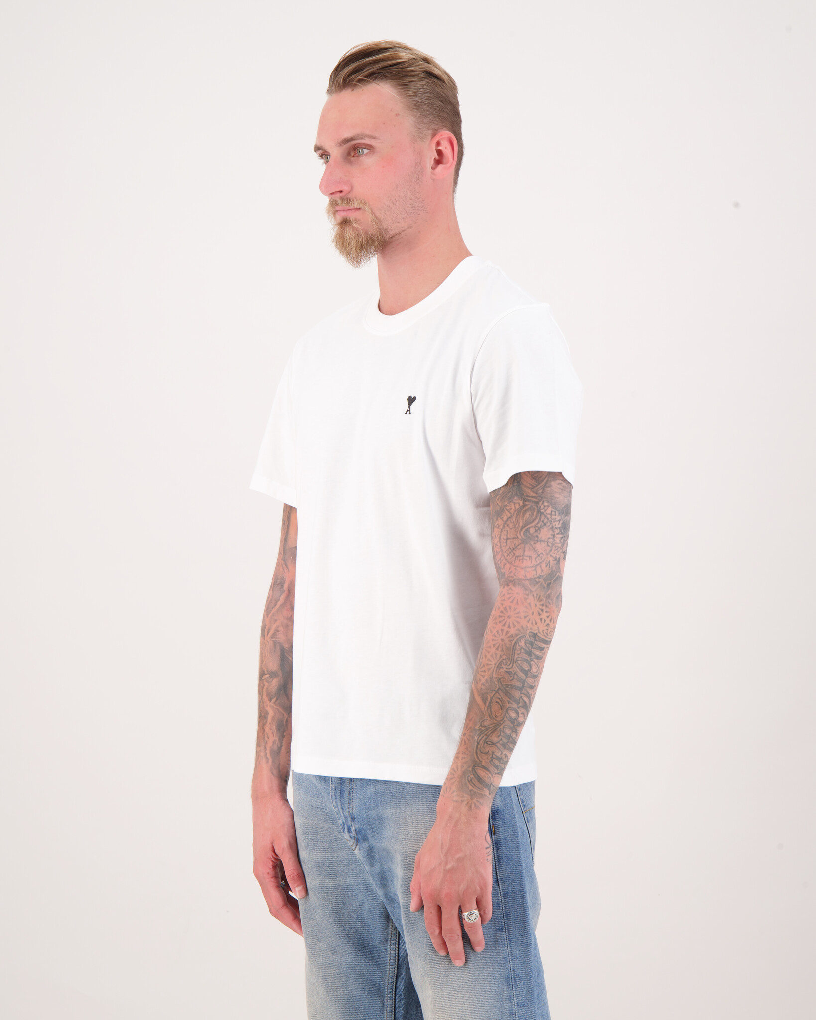Lichtblauwe AMI De Coeur Black logo T-Shirt van het merk Ami Paris. Het T-Shirt met korte mouwen is gemaakt van 100% Katoen. Het T-Shirt heeft het bekende AMI logo op de borst, het logo is zwart.