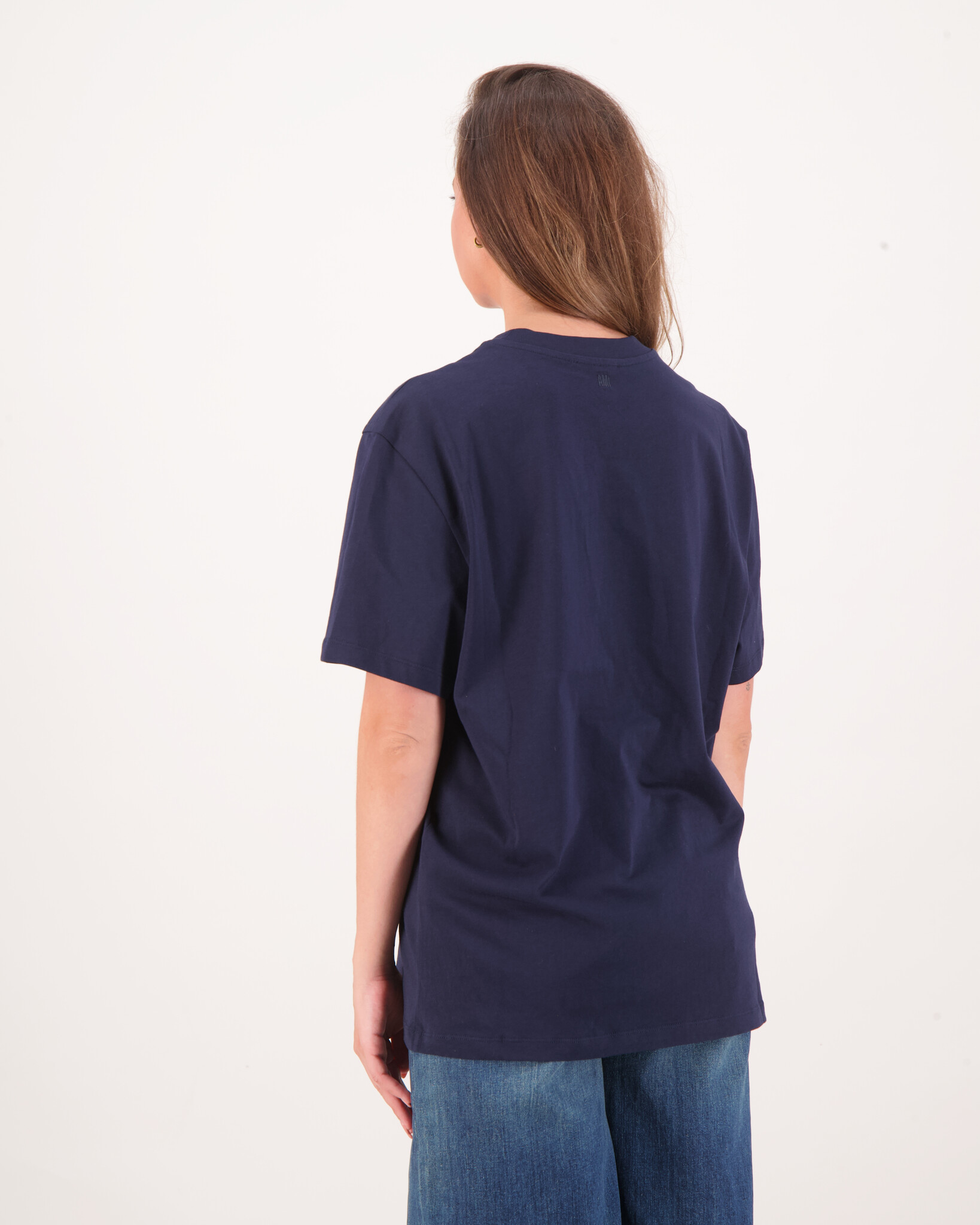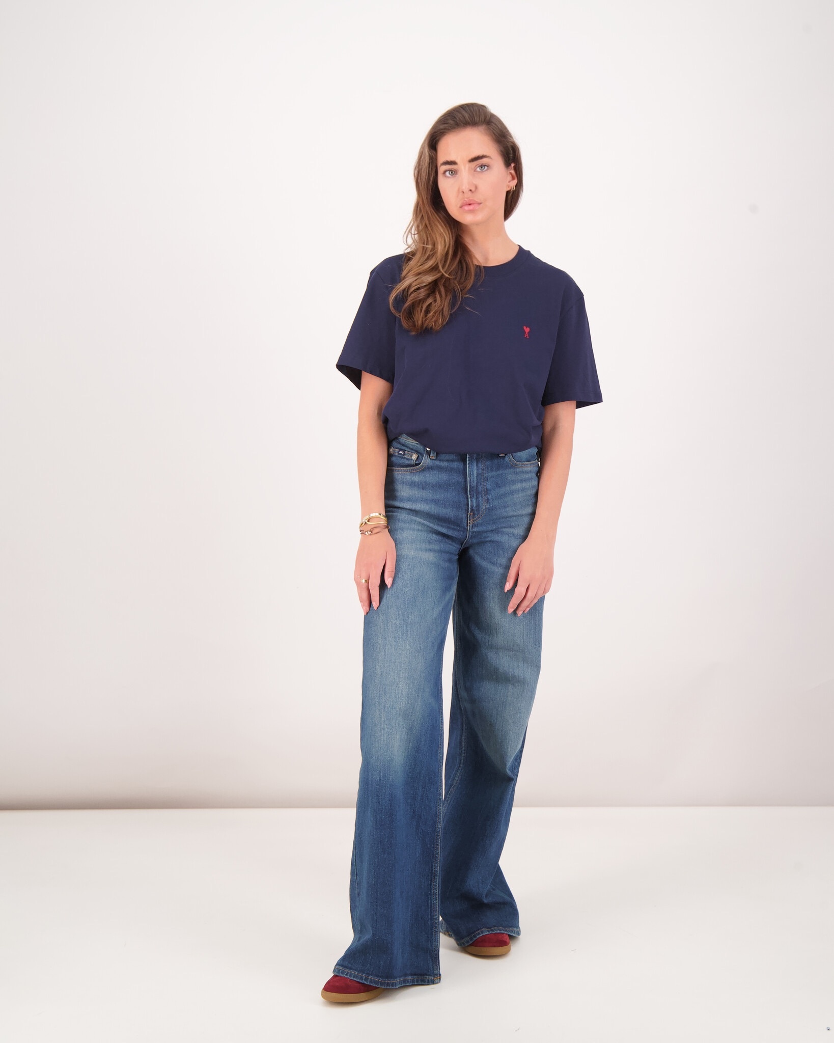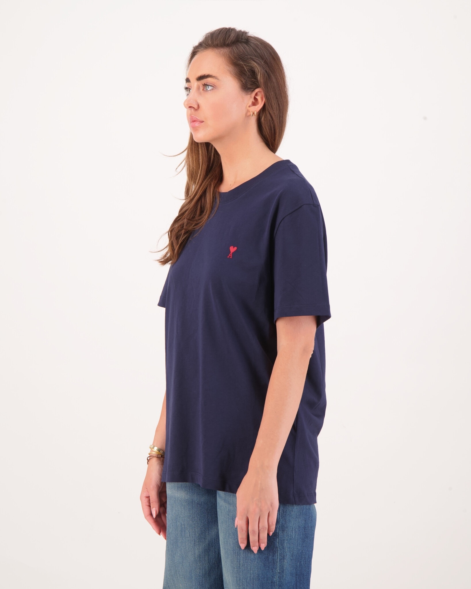 Blauwe AMI De Coeur Rouge T-Shirt van het merk Ami Paris. Het T-Shirt met korte mouwen is gemaakt van 100% Katoen. Het T-Shirt heeft het bekende rode AMI logo op de borst.