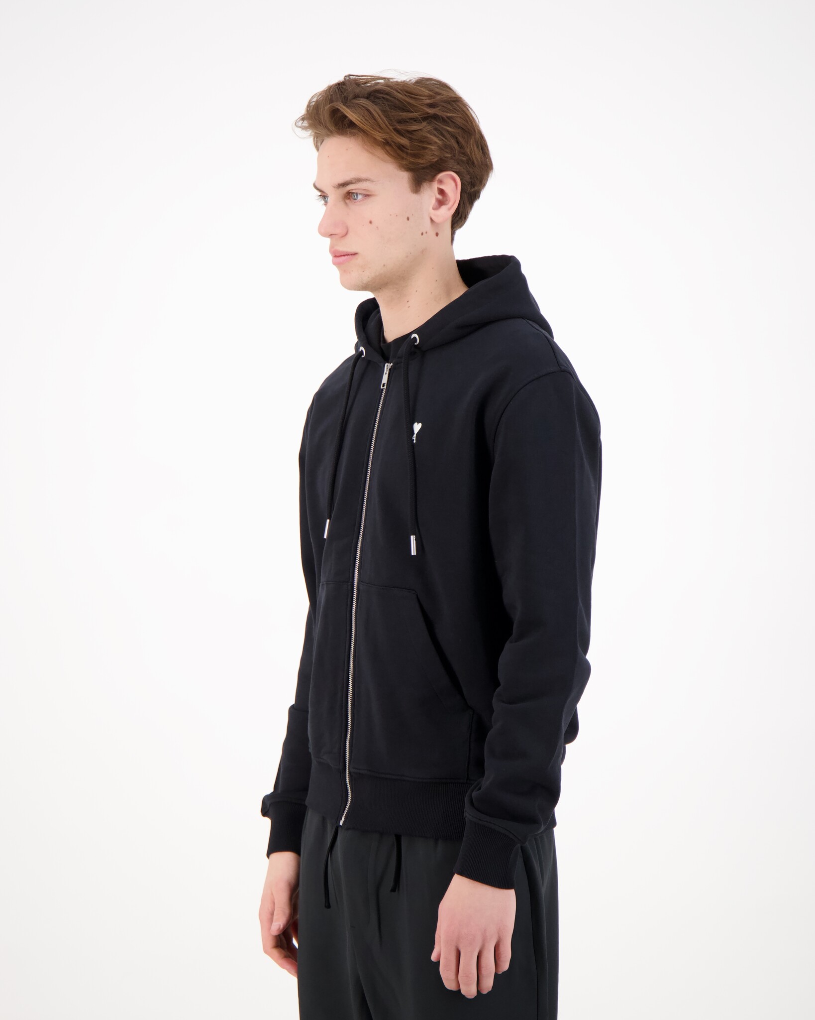 Zwarte Ami De Coeur With Contrasted Cardigan van het merk Ami Paris. Deze Ami de Coeur-hoodie met ritssluiting van Ami Paris is een perfecte mix van comfort en verfijnde eenvoud. De hoodie is vervaardigd uit hoogwaardig Katoenfleece, wat zorgt voor een zachte, ademende en duurzame kwaliteit die ideaal is voor dagelijks gebruik. De klassieke pasvorm geeft het ontwerp een tijdloze uitstraling en maakt de hoodie makkelijk te combineren met zowel casual als meer gestylede outfits. Op de borst prijkt het iconische Ami de Coeur-logo, uitgevoerd in een wit crèmekleurig borduursel, wat een subtiel maar herkenbaar accent toevoegt.