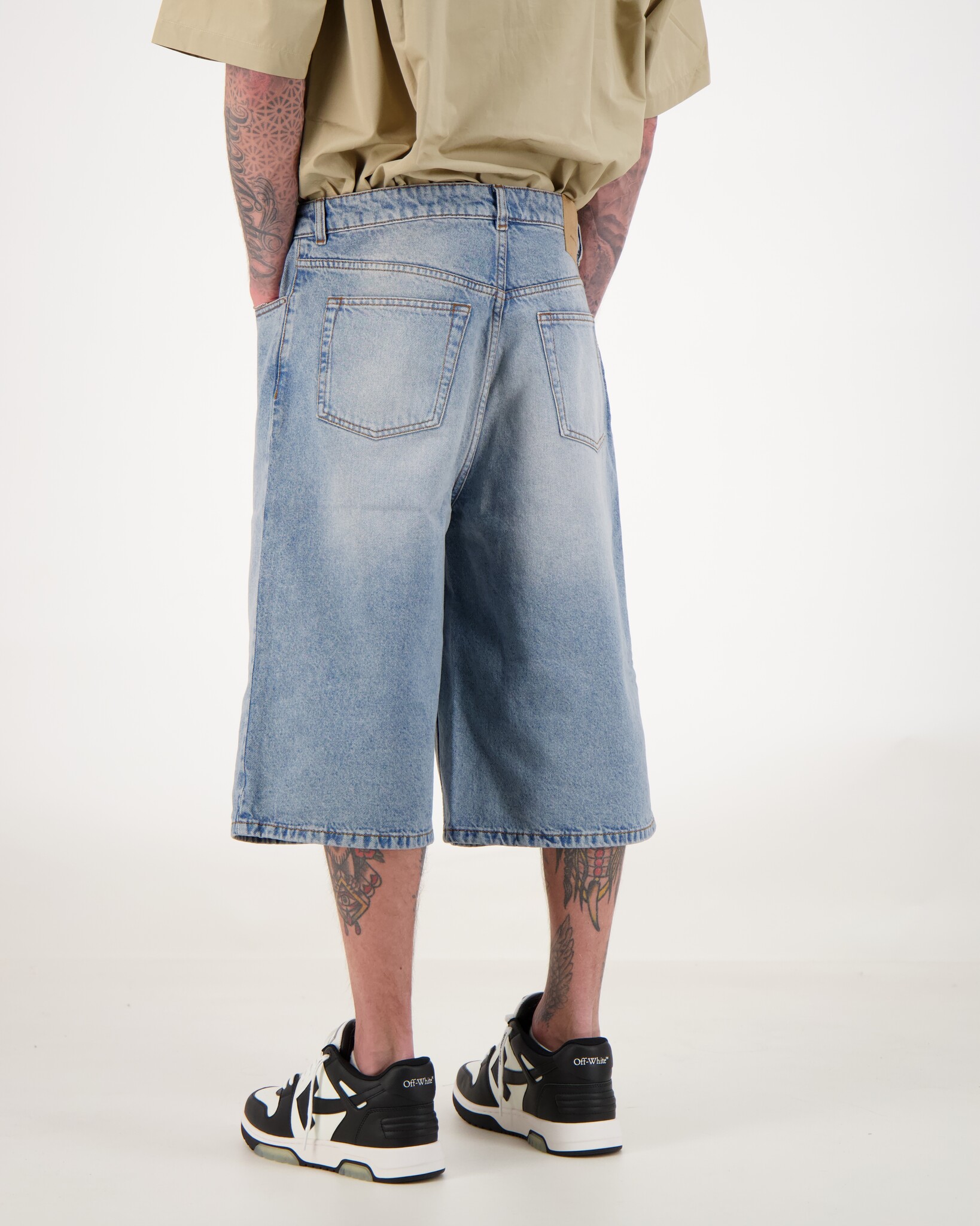 Blauwe AMI Paris Large Fit Bermuda Shorts Jeans van het merk Ami Paris. Deze large fit bermuda shorts in used indigo denim hebben een relaxte en eigentijdse uitstraling. De short heeft een regular waist, een wijde pijp en is uitgevoerd in klassiek 5-pocket design met een knoopsluiting. De denim is afgewerkt met nikkelkleurige metalen rivets en knopen, contrasterende tobacco stiksels en een kenmerkende “AMI Alexandre Mattiussi” paper jacron op de achterkant. Een comfortabele en stijlvolle keuze voor een casual zomerlook met karakter.