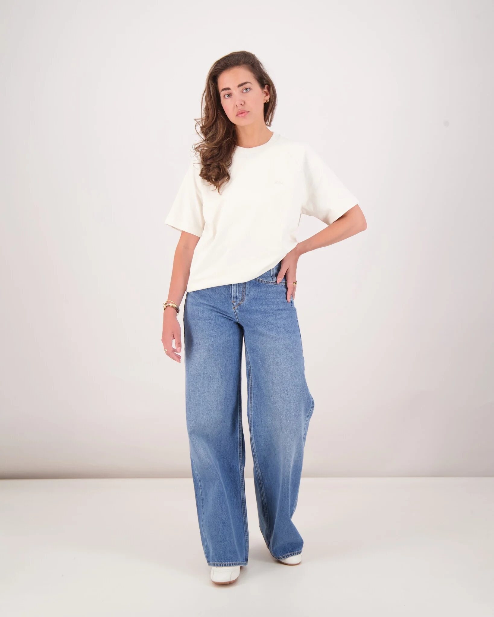 Wat direct opvalt, is het fijne, ton-sur-ton borduurtje: een schuine “ami” op de borst, aangevuld met eenzelfde subtiel logo net onder de nek aan de achterkant . Die details geven het shirt net dat beetje persoonlijkheid zonder de minimalistische uitstraling te doorbreken.