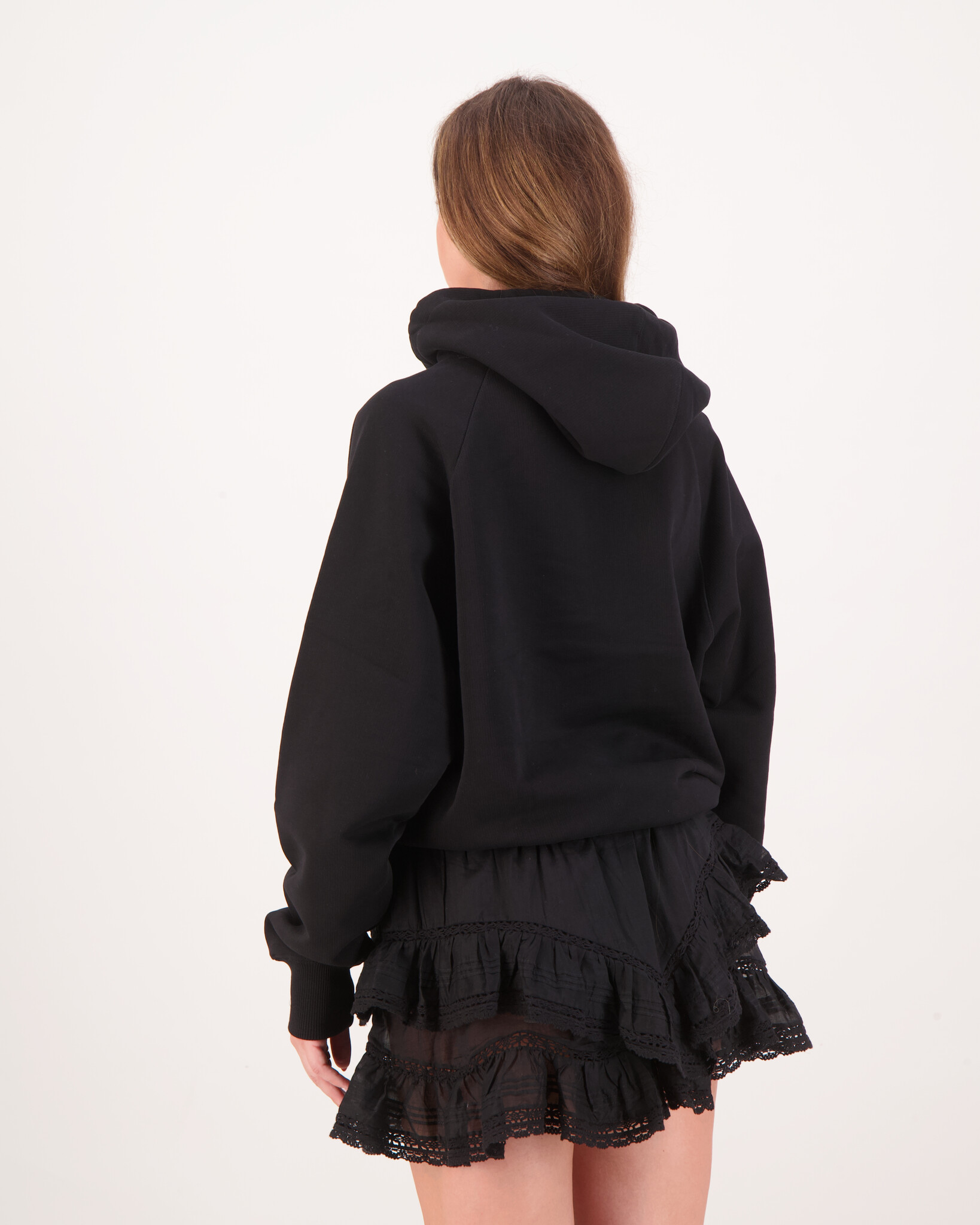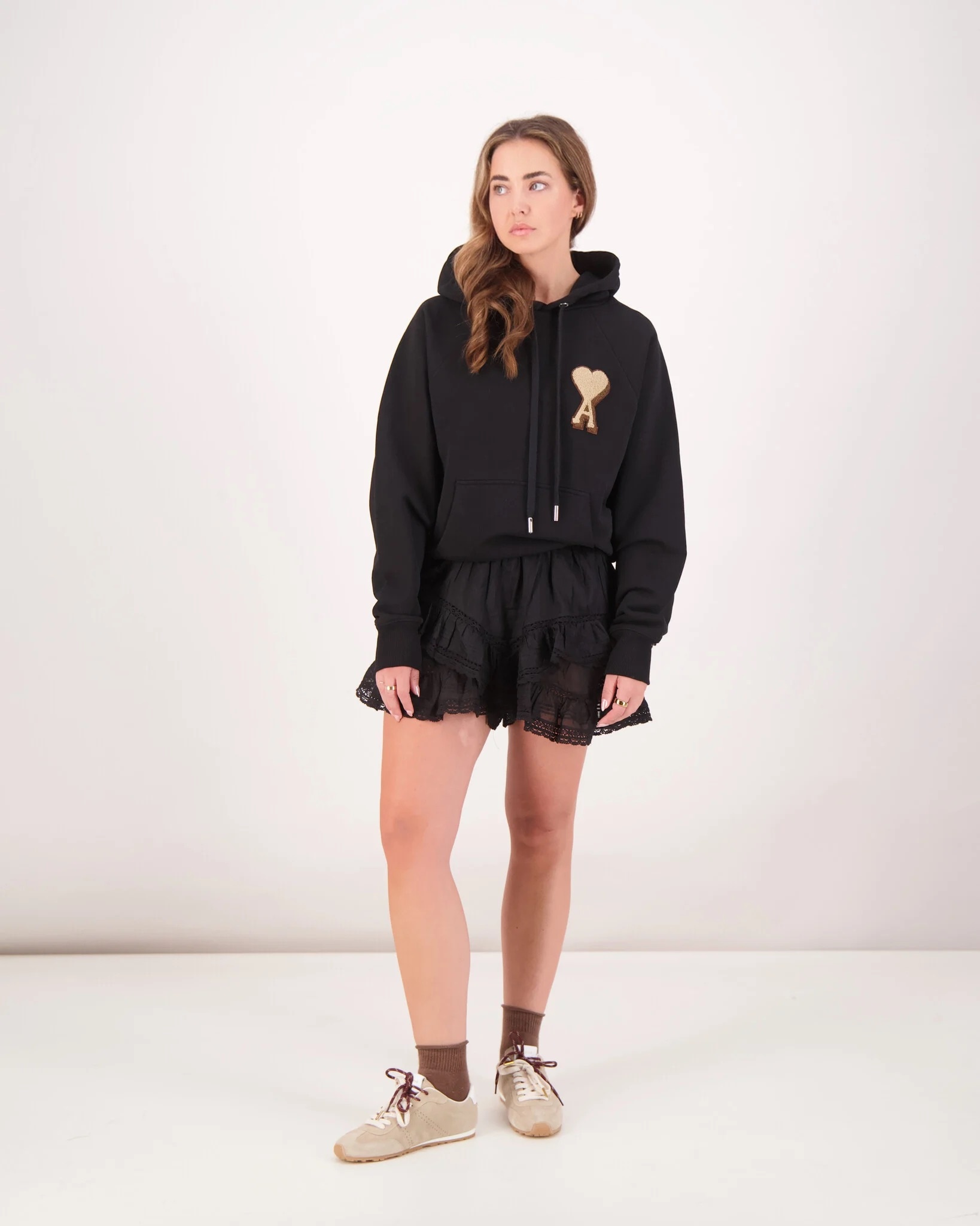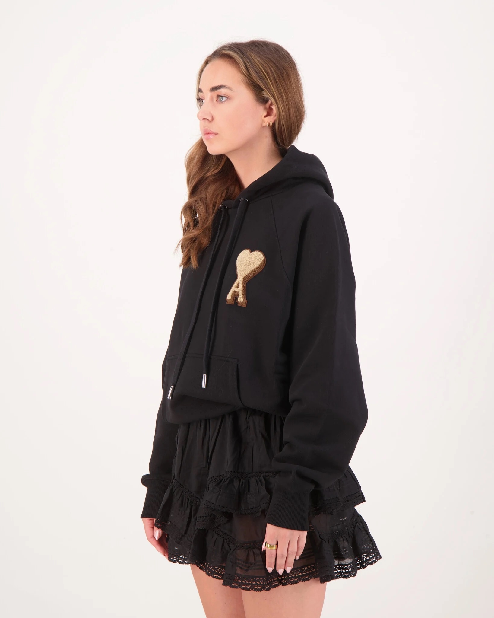 Zwarte ADC Patch Hoodie van het merk Ami Paris. De hoodie heeft het capuchon en een aantrekkoort met het grote bekende A logo op de borst.