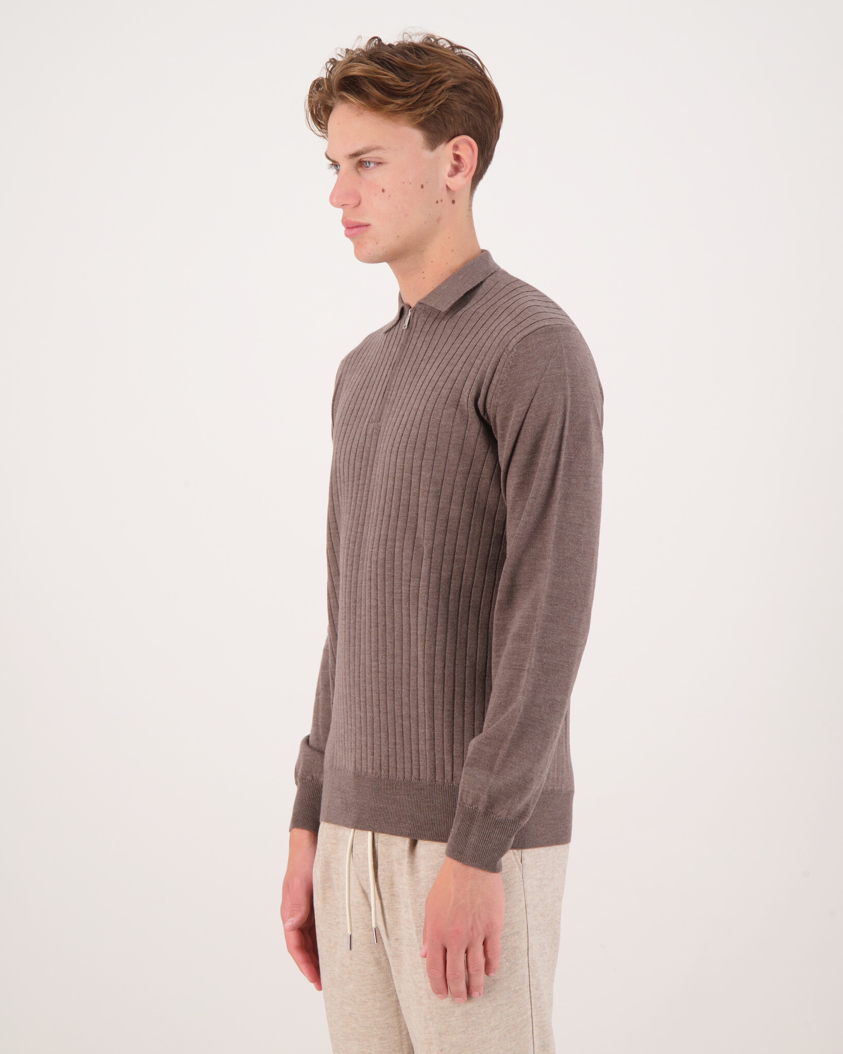 Ontdek verfijnde elegantie en subtiele functionaliteit met de Geribbelde Half Zip Polo. Deze luxe polo is vervaardigd uit Cashwool, een uitzonderlijk fijne merinowol (19,5 micron) afkomstig van zorgvuldig geselecteerde Australische schapen, het resultaat: een textuur zo zacht als kasjmier, met een zijdeachtige glans. (100 % extrafine merinowol)