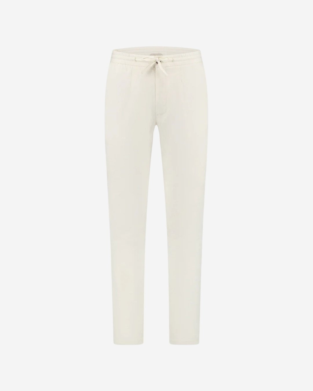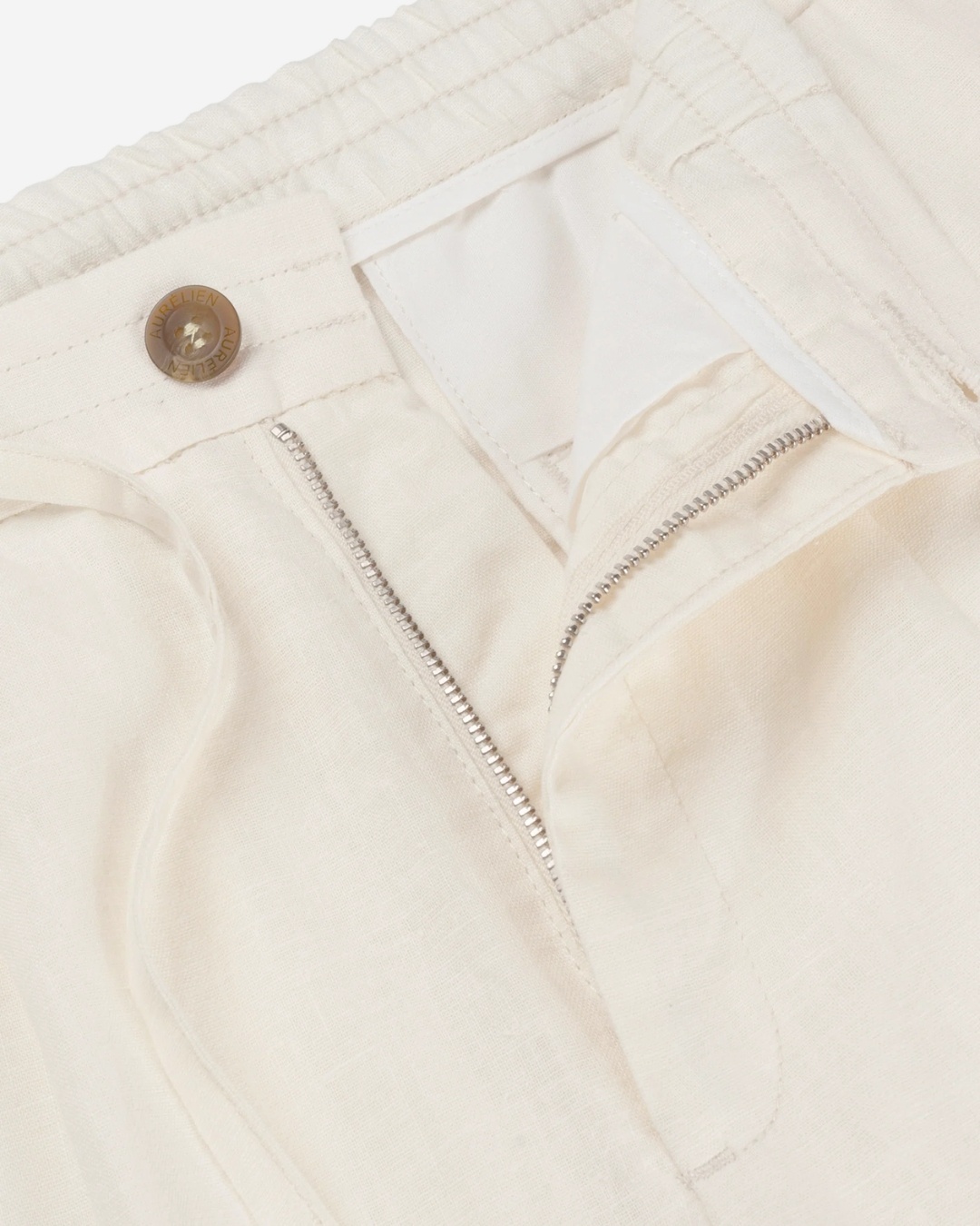 Ivoor Linen Seaside Trousers van het merk Aurélien. Deze Seaside Trousers zijn gemaakt van ademend linnen en hebben een comfortabele tailleband met trekkoord. Deze broek heeft twee steekzakken en twee achterzakken.