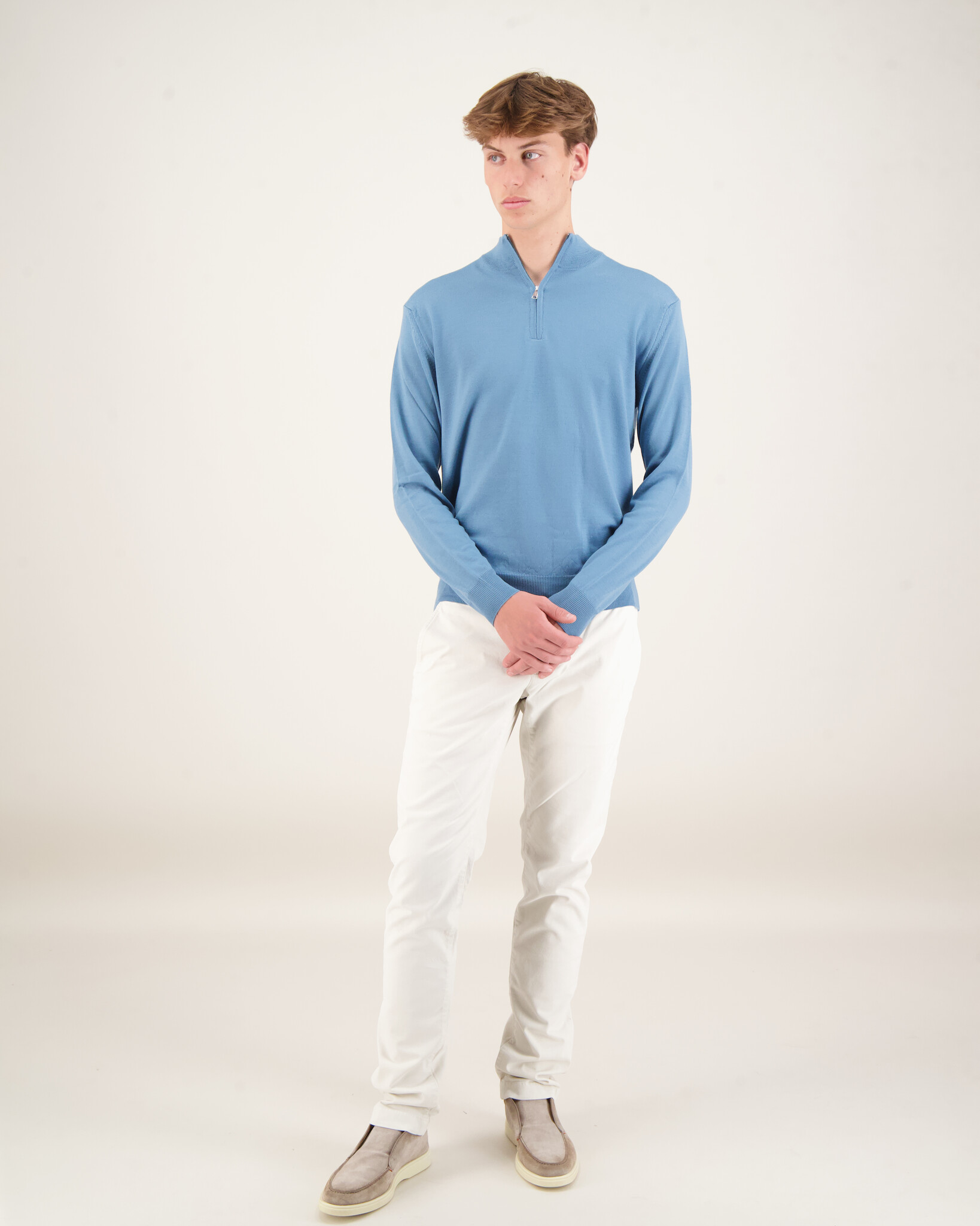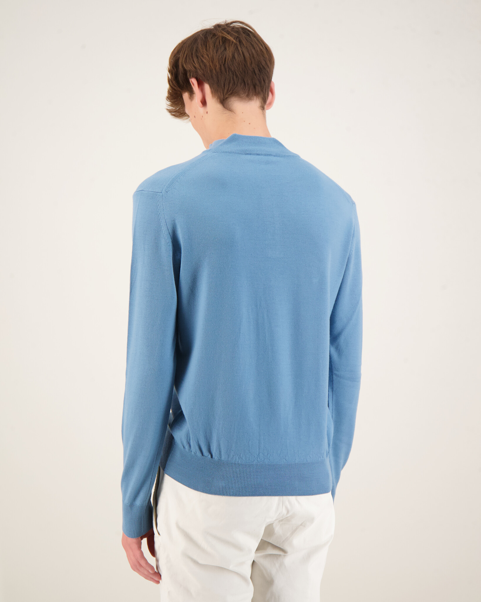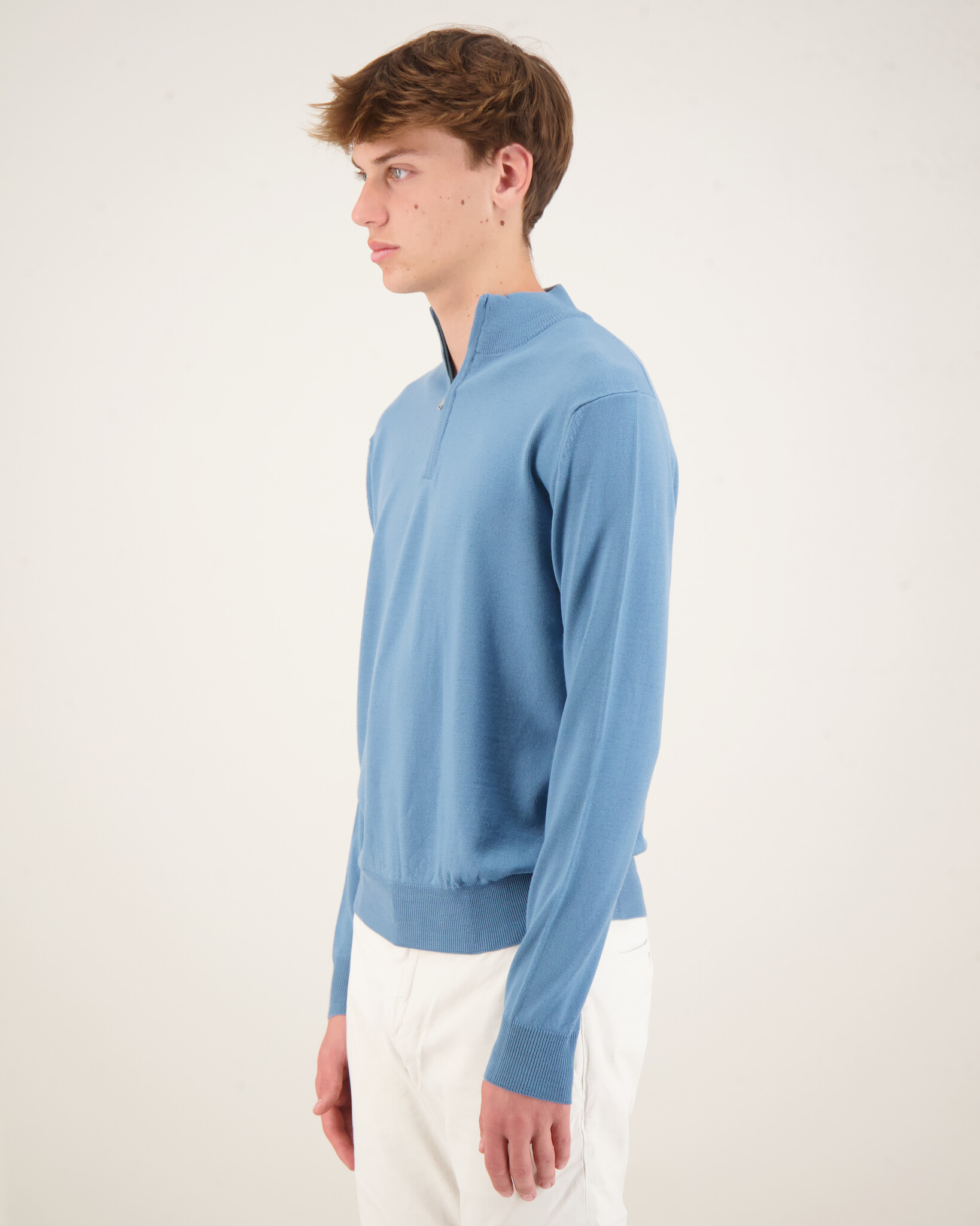 Blauwe Zipper Sweater Extra Fine Marino Mint van het merk Aurélien. Zo zacht als Cashmere met een zijde glans. Deze trui is handgemaakt in Italië van het ultra luxe Cashwool ®. Cashwool ® is een bijzonder fijn materiaal wat enkel afkomstig is van de Australische Merino schapen. Het Merino wol is zo fijn dat de vezel een diameter van slechts 19.5 micron heeft. Deze veelzijdige trui zal een toevoeging zijn voor elke garderobe omdat het gemakkelijk te dragen is met bijna elke formele of casual look. De trui heeft een perfecte dikte die zowel los te dragen is of als extra laagje.