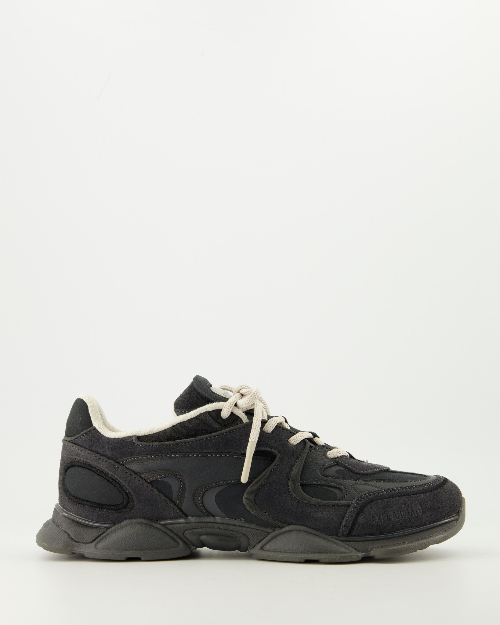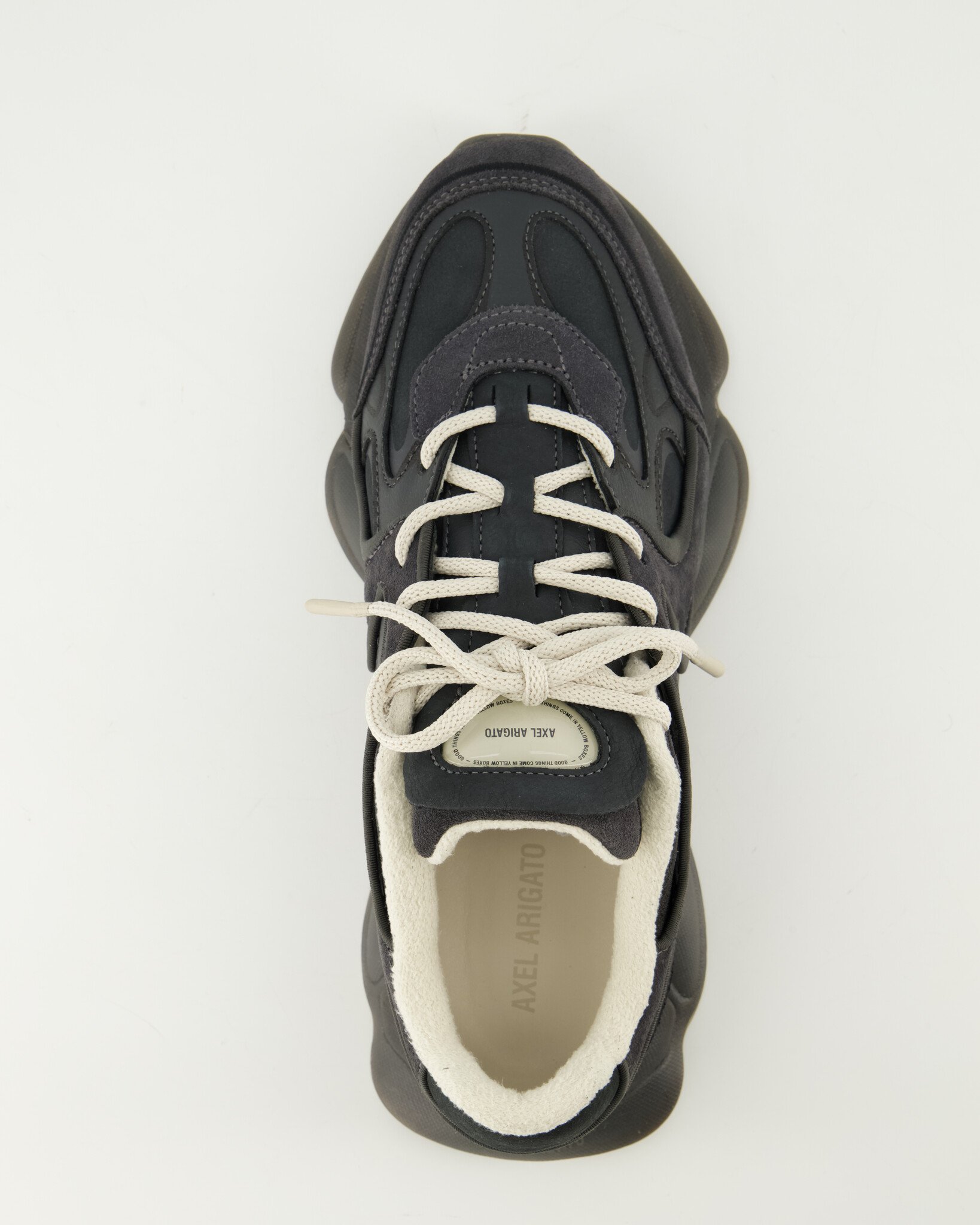 De Eris-sneaker belichaamt onze toewijding aan het combineren van uitzonderlijk vakmanschap met grensverleggend experimenteel design. Hij staat op een overdreven grote buitenzool die voorbij de omtrek van het lage bovenwerk uitsteekt, waardoor vanuit elke hoek een opvallend visueel contrast ontstaat. Deze sneaker is een toonbeeld van technische vakbekwaamheid en is met de hand opgebouwd uit 36 afzonderlijke onderdelen. Hij heeft een ingewikkeld in elkaar vergrendelde buitenkant voor een kenmerkende paneelafwerking, samen met een getextureerde schuurpapierachtige afwerking onder de soklijn.