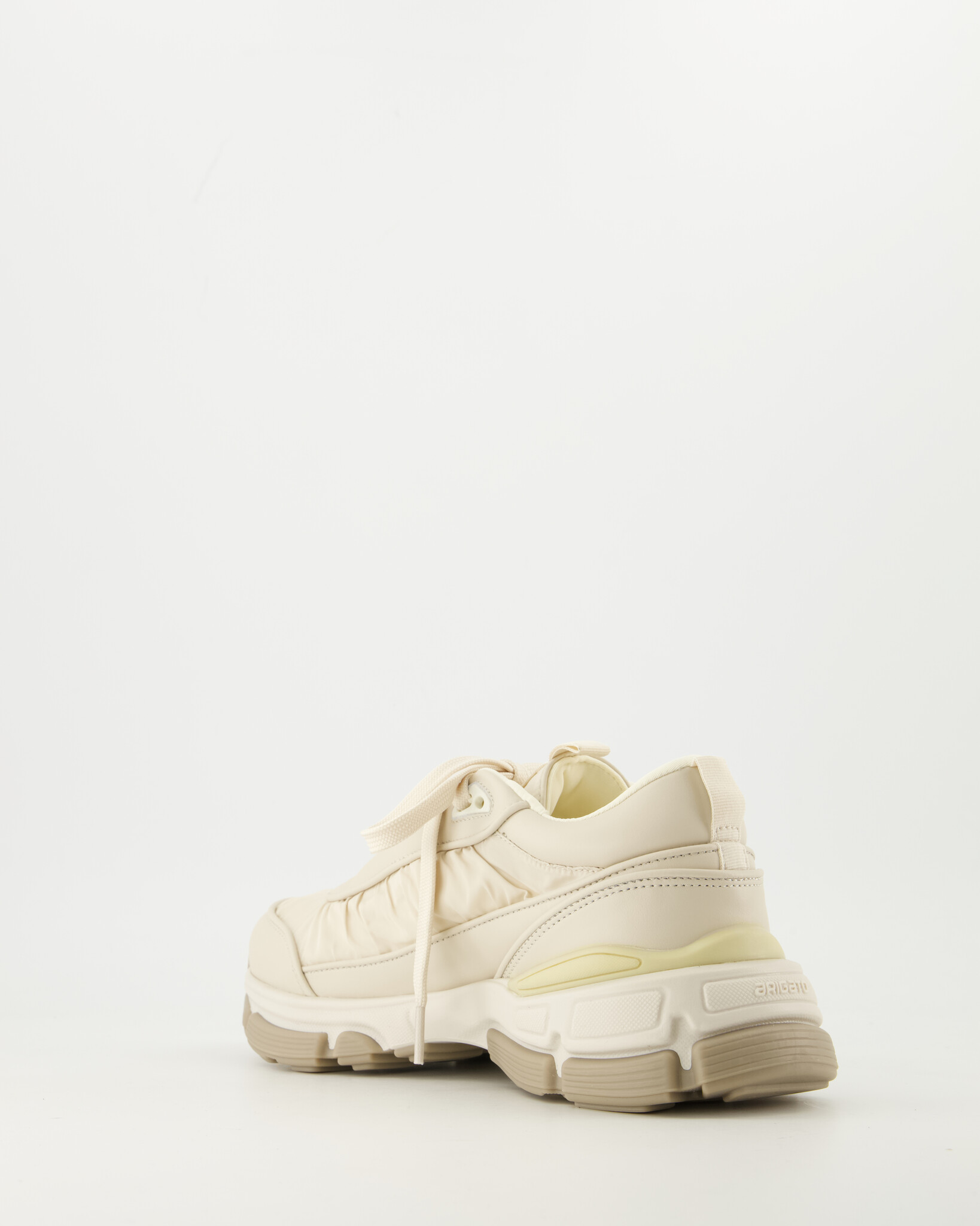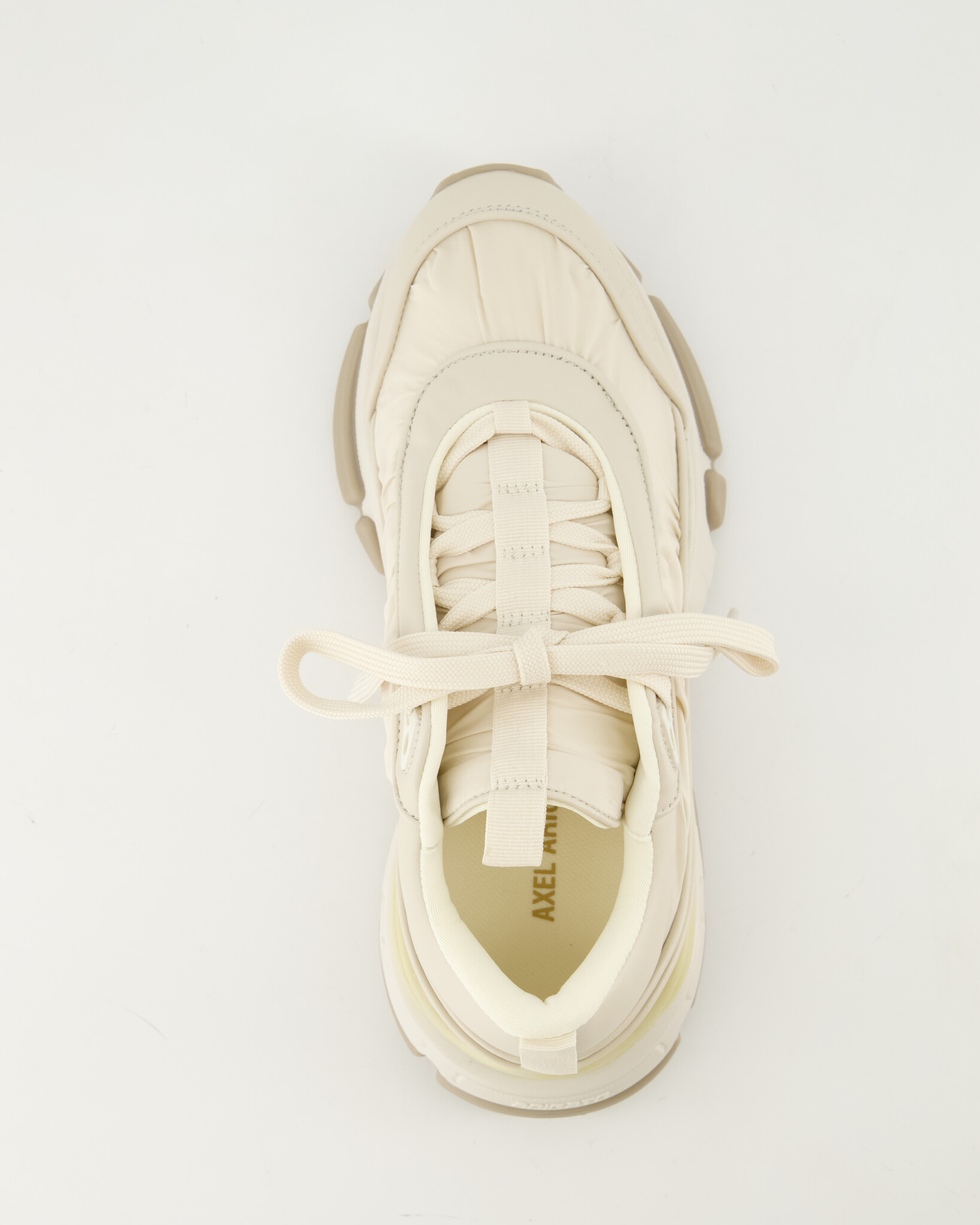 Offwhite Sphere Ruche Runner Sneaker van het merk Axel Arigato. De Sphere Ruche Runner is gehuld in een strook stof met ruches die diepte, dimensie en een tactiele afwerking creëert. Hij is met de hand gemaakt in Portugal, afgewerkt met eersteklas leer en staat op een aangepaste versie van onze dikke Marathon Runner-zool.