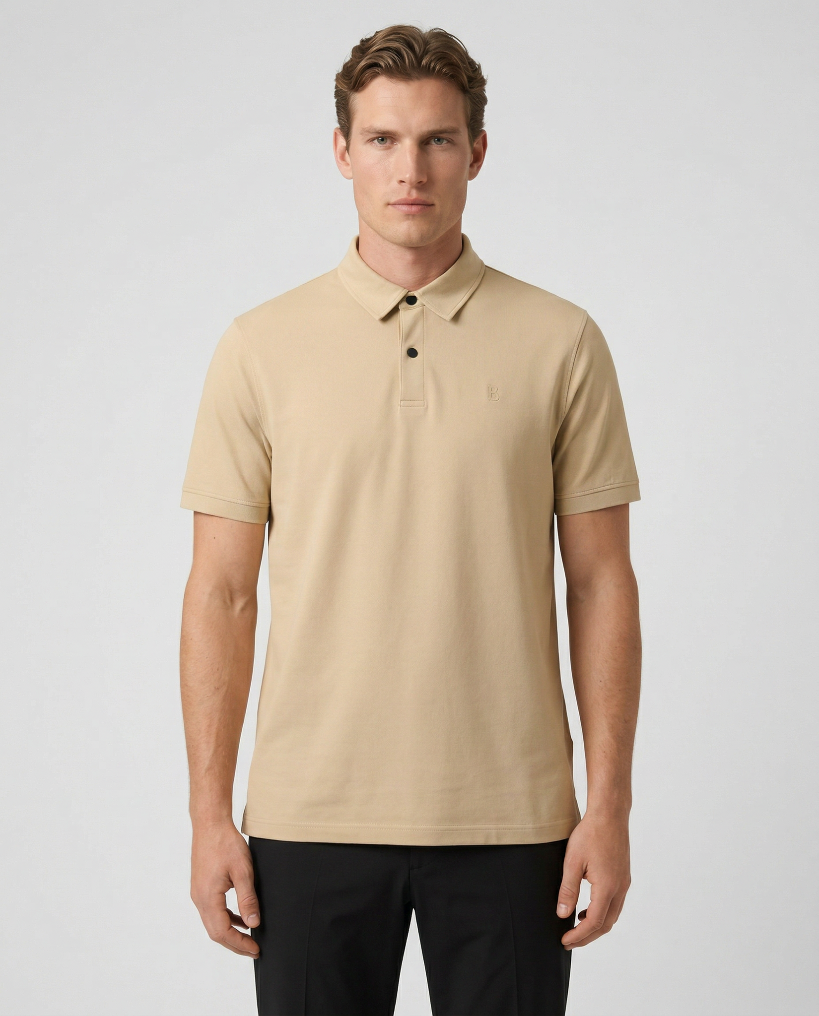Biscuit Timo Polo van het merk Bogner. De polo heeft korte mouwen, sluit met 2 zwarte knoopjes en heeft het Bogner logo links op de borst.