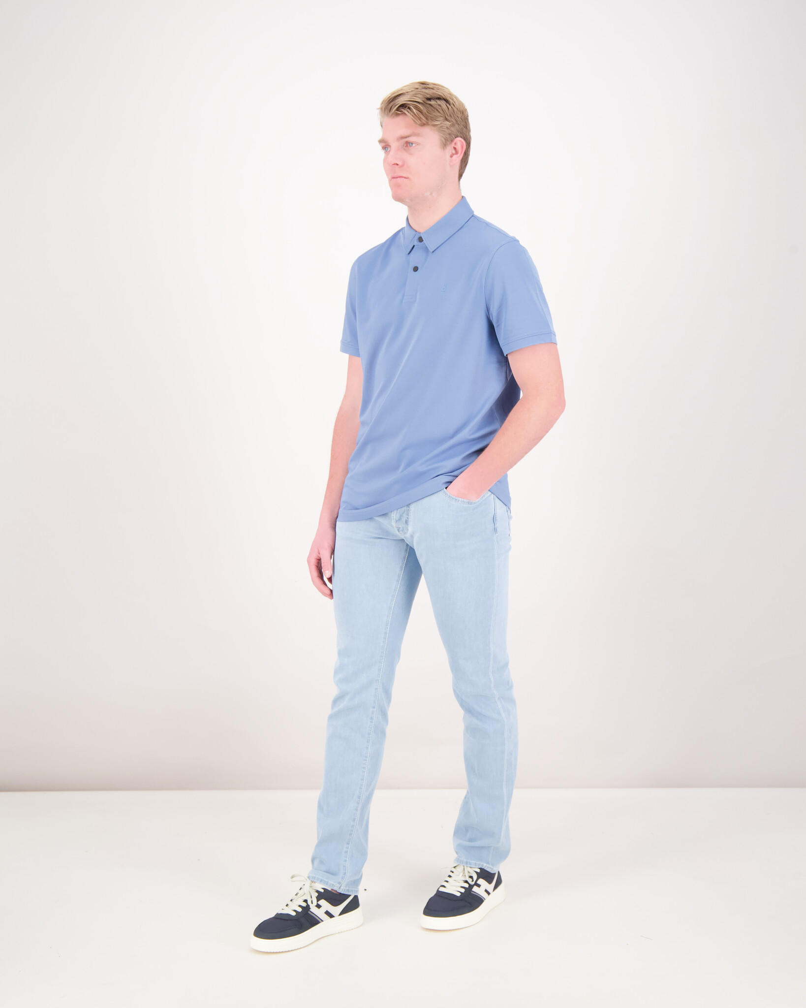 Blauwe Timo-5F Polo van het merk Bogner. De polo heeft korte mouwen, sluit met 3 zwarte knoopjes en heeft het Bogner logo links op de borst.