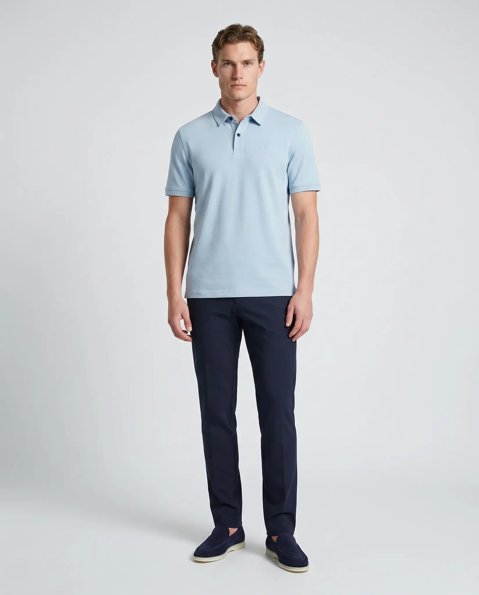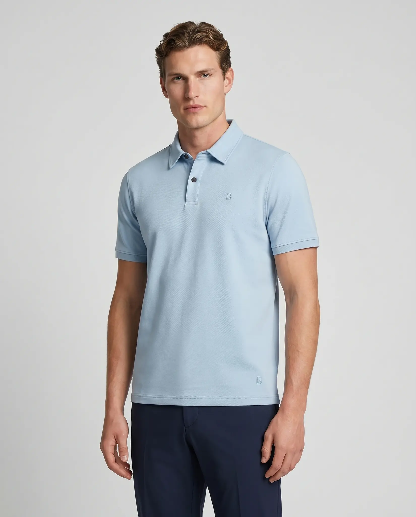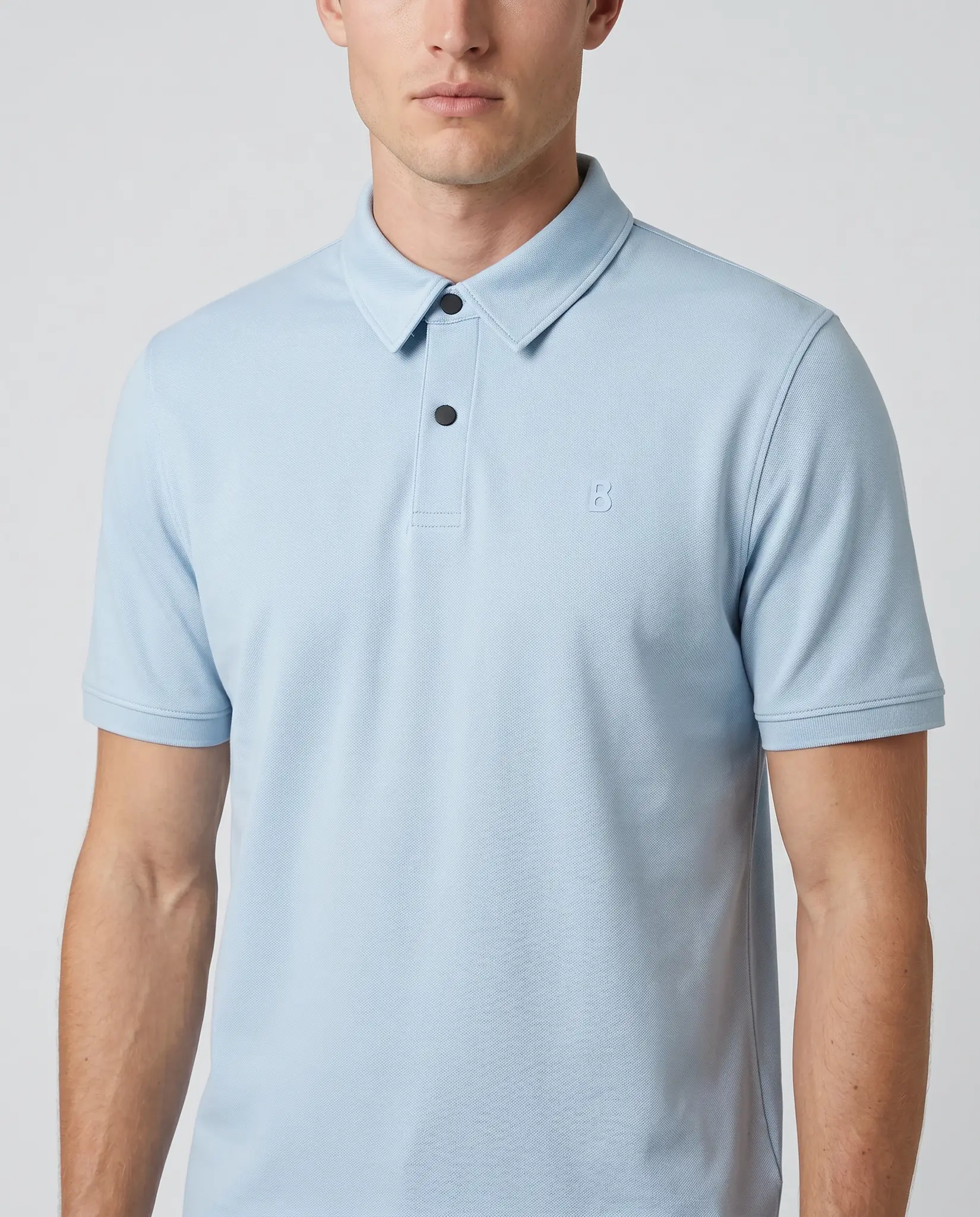 Lichtblauw Timo Polo van het merk Bogner. De polo heeft korte mouwen, sluit met 2 zwarte knoopjes en heeft het Bogner logo links op de borst.