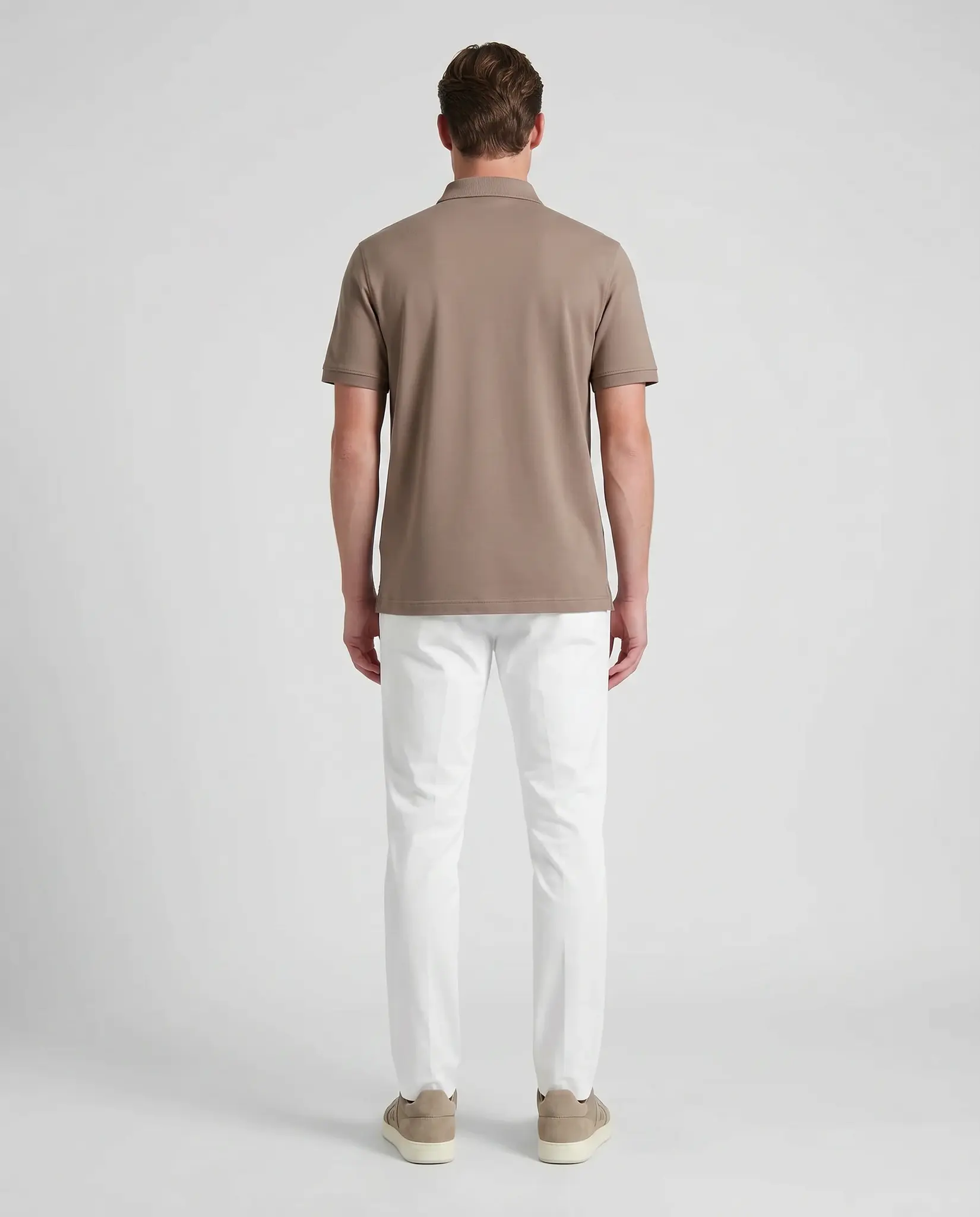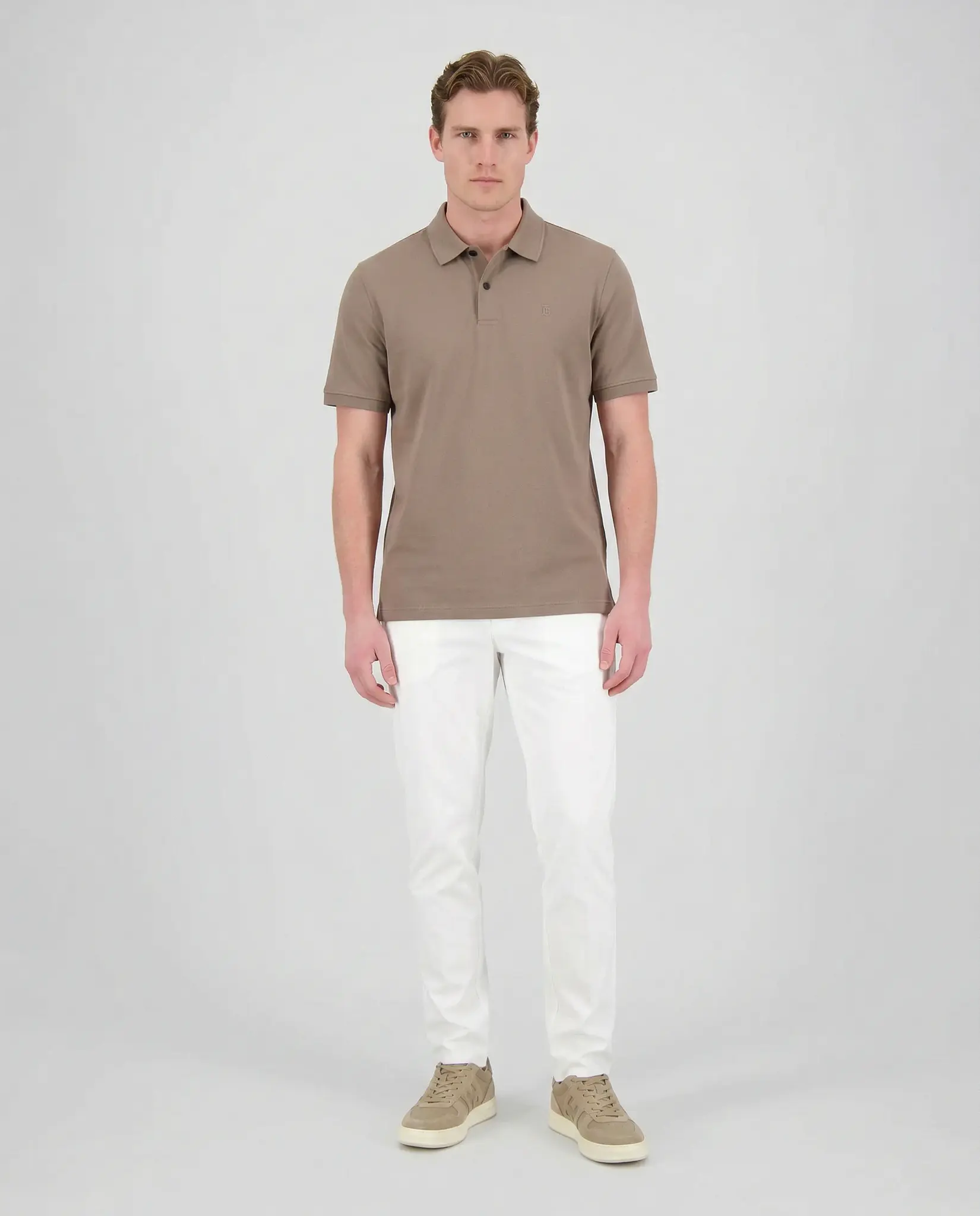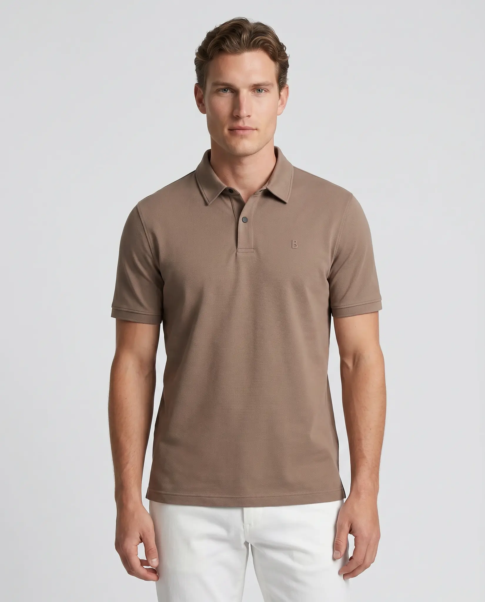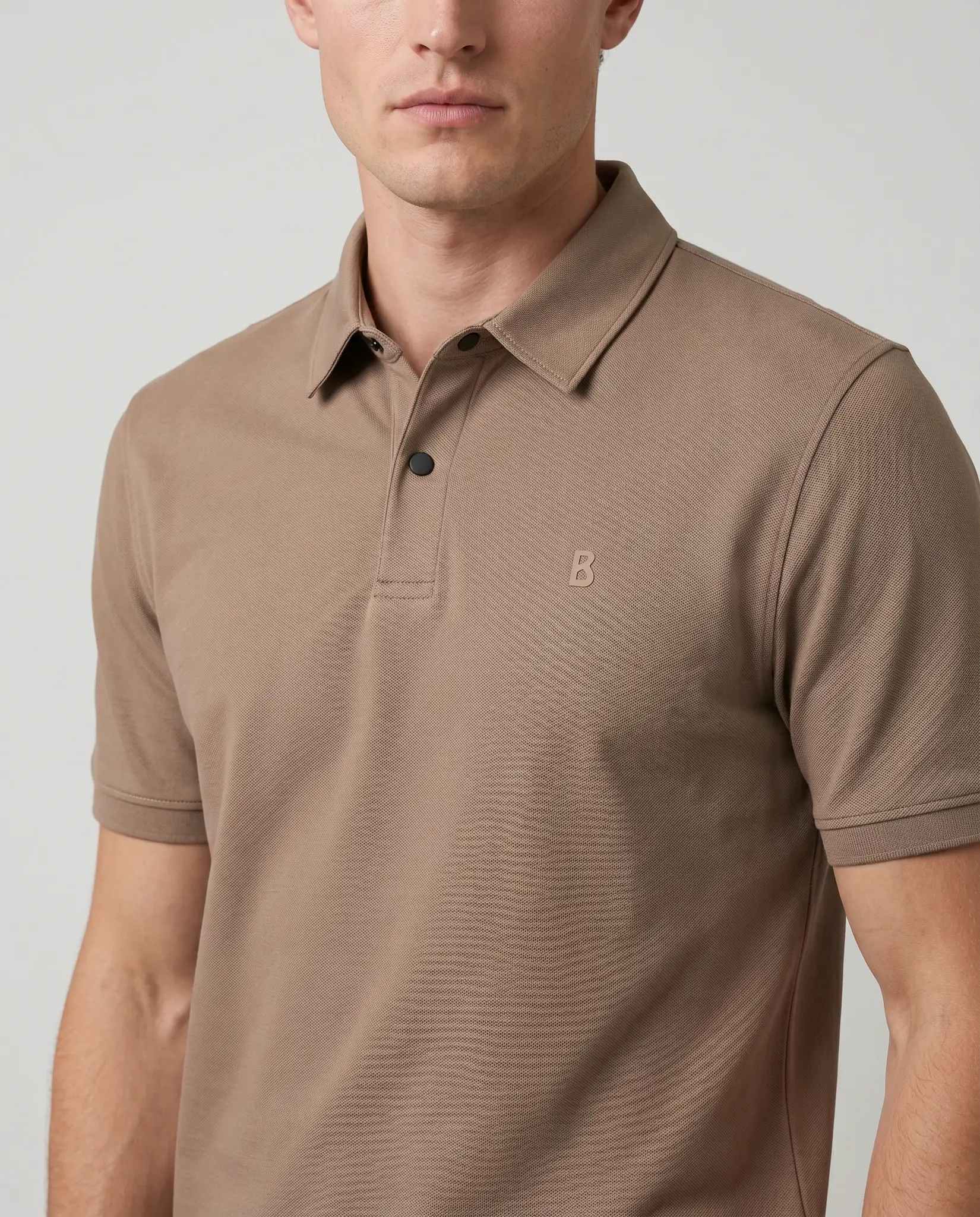 Taupe Timo Polo van het merk Bogner. De polo heeft korte mouwen, sluit met 2 zwarte knoopjes en heeft het Bogner logo links op de borst.