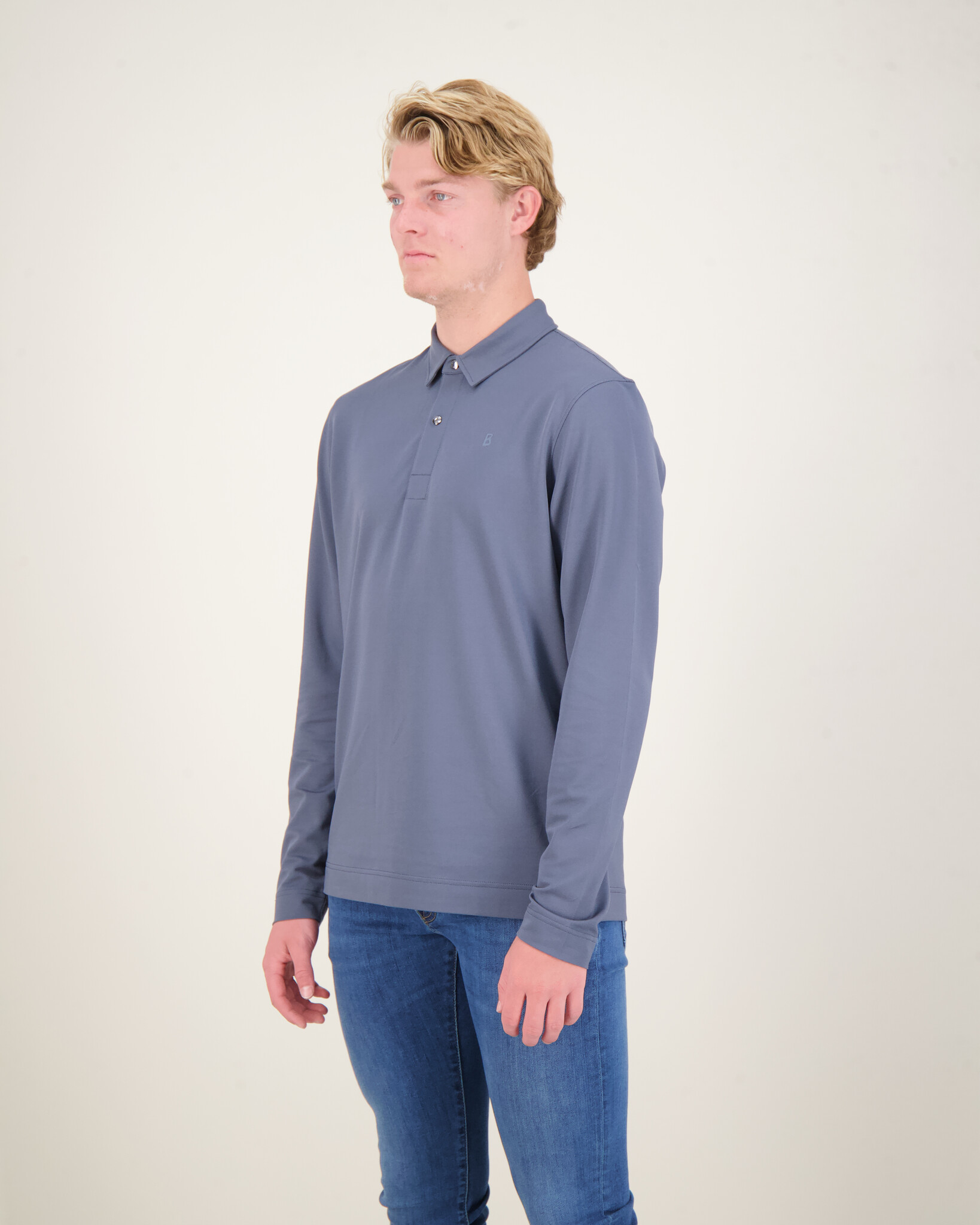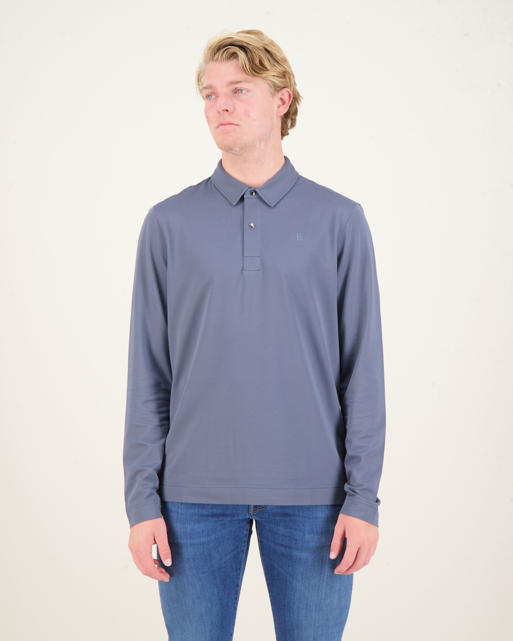 Blauwe Timon-6 Lange mouwen Polo van het merk Bogner. De polo heeft langemouwen, sluit met 3 zwarte knoopjes en heeft het Bogner logo links op de borst en een randje op de mouwen.