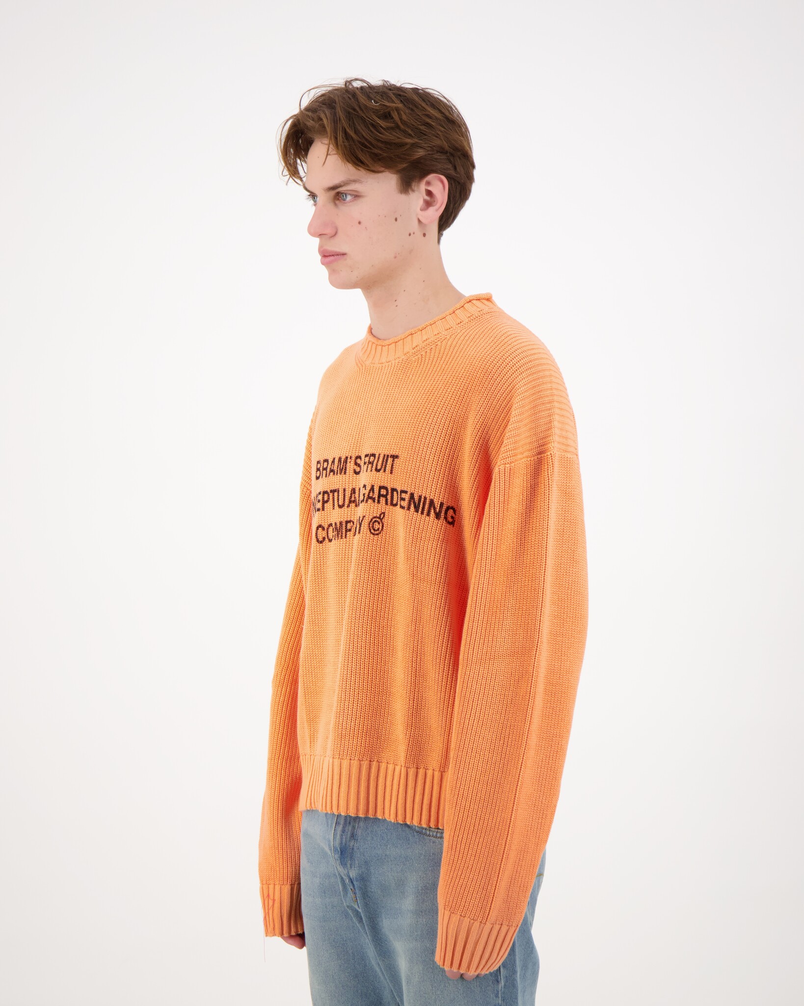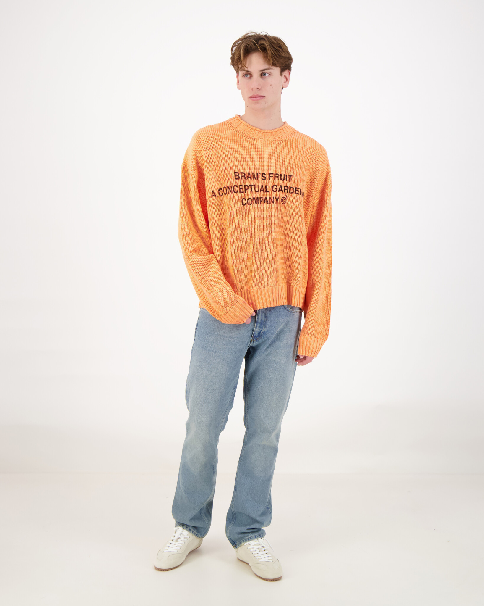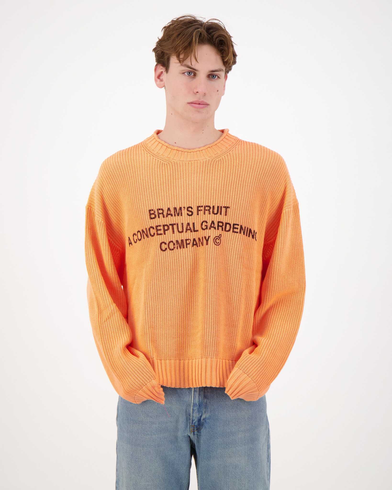 Oranje Stamp Knit Sweater van het merk Bram's Fruit. De Stamp Knit Sweater van Bram’s Fruit is een hoogwaardige gebreide trui die stijl en comfort combineert in één opvallend item. Het ontwerp weerspelt de creatieve en expressieve esthetiek.