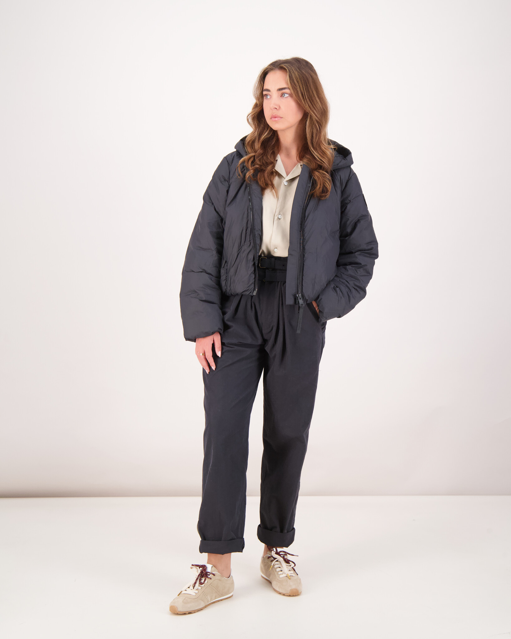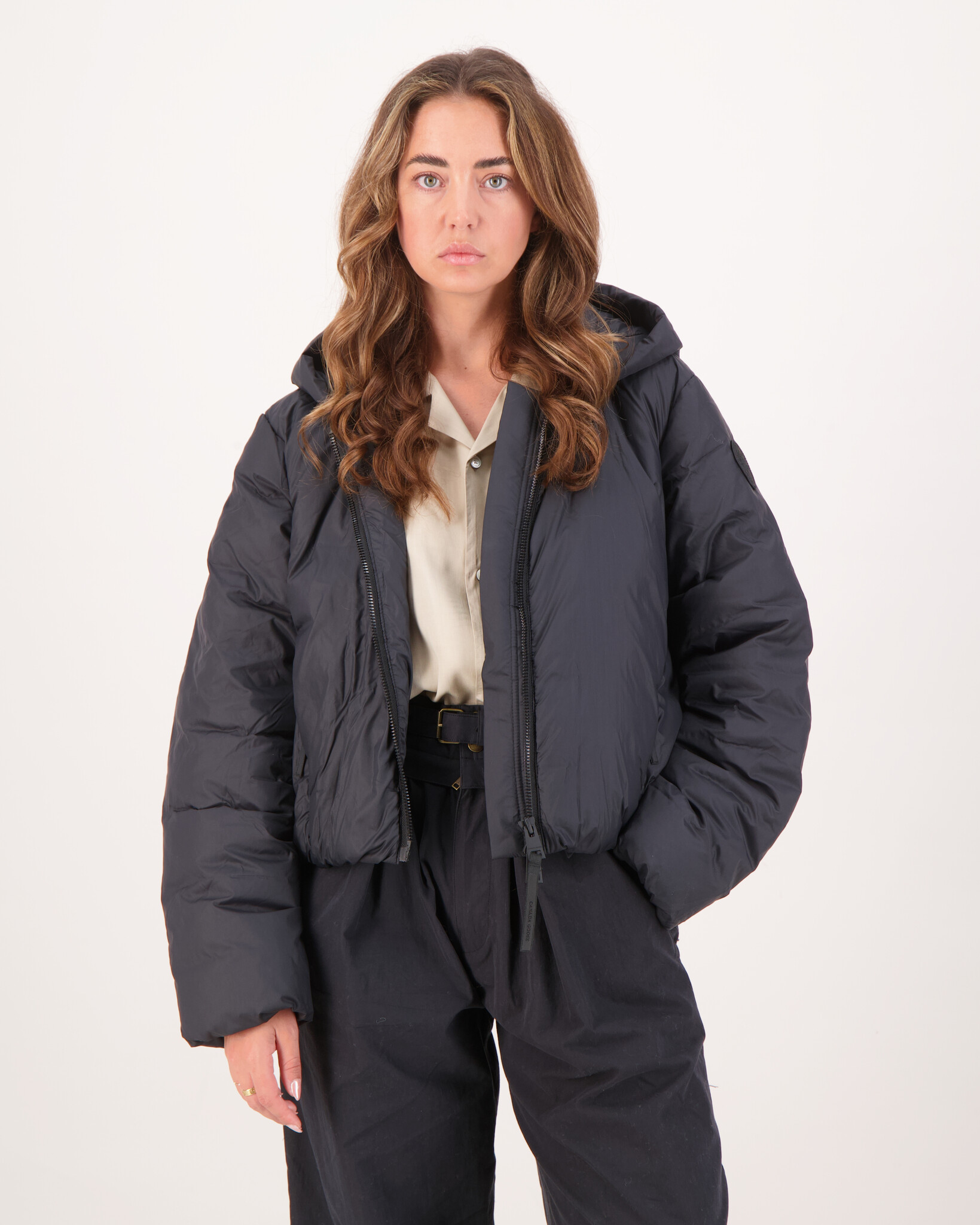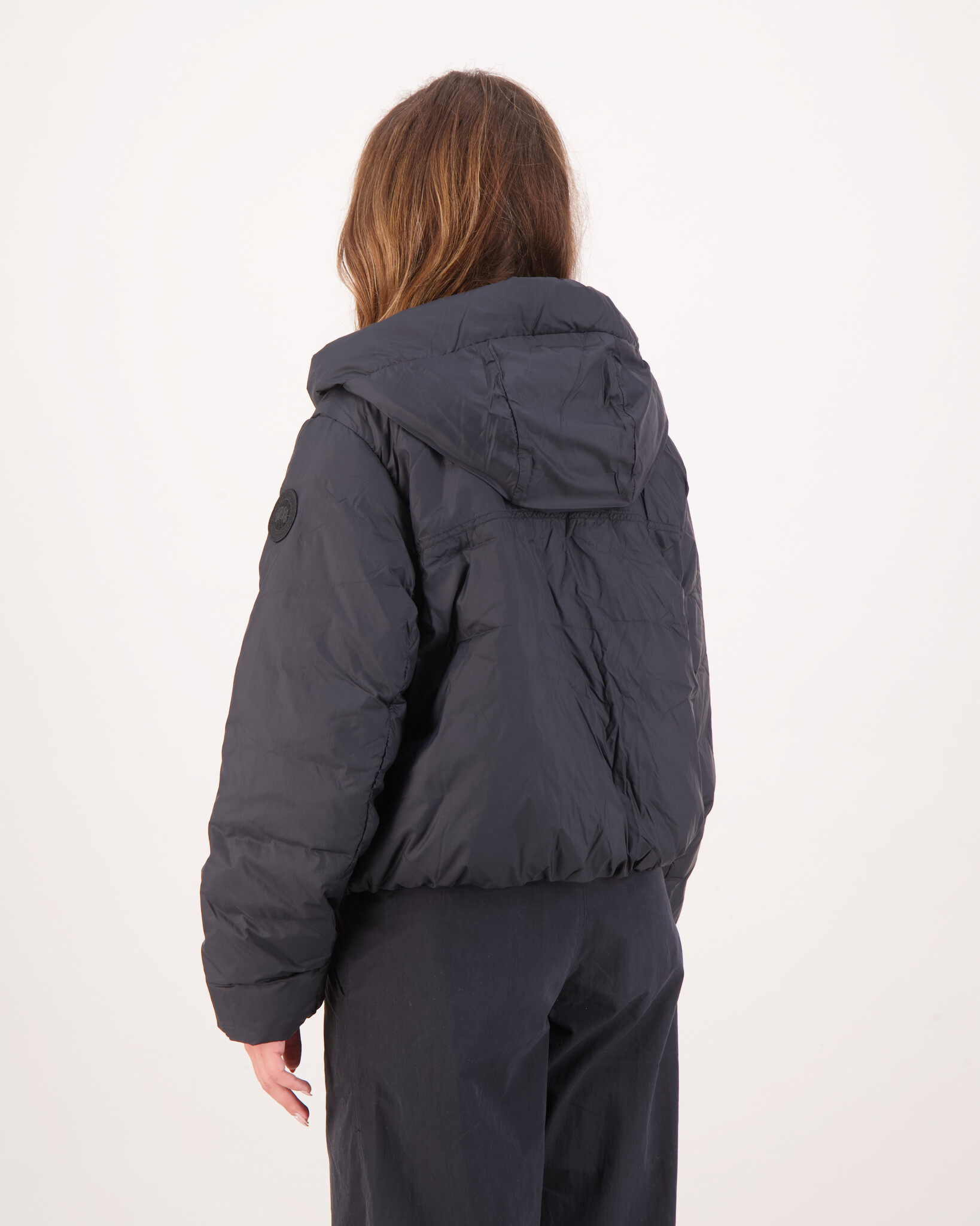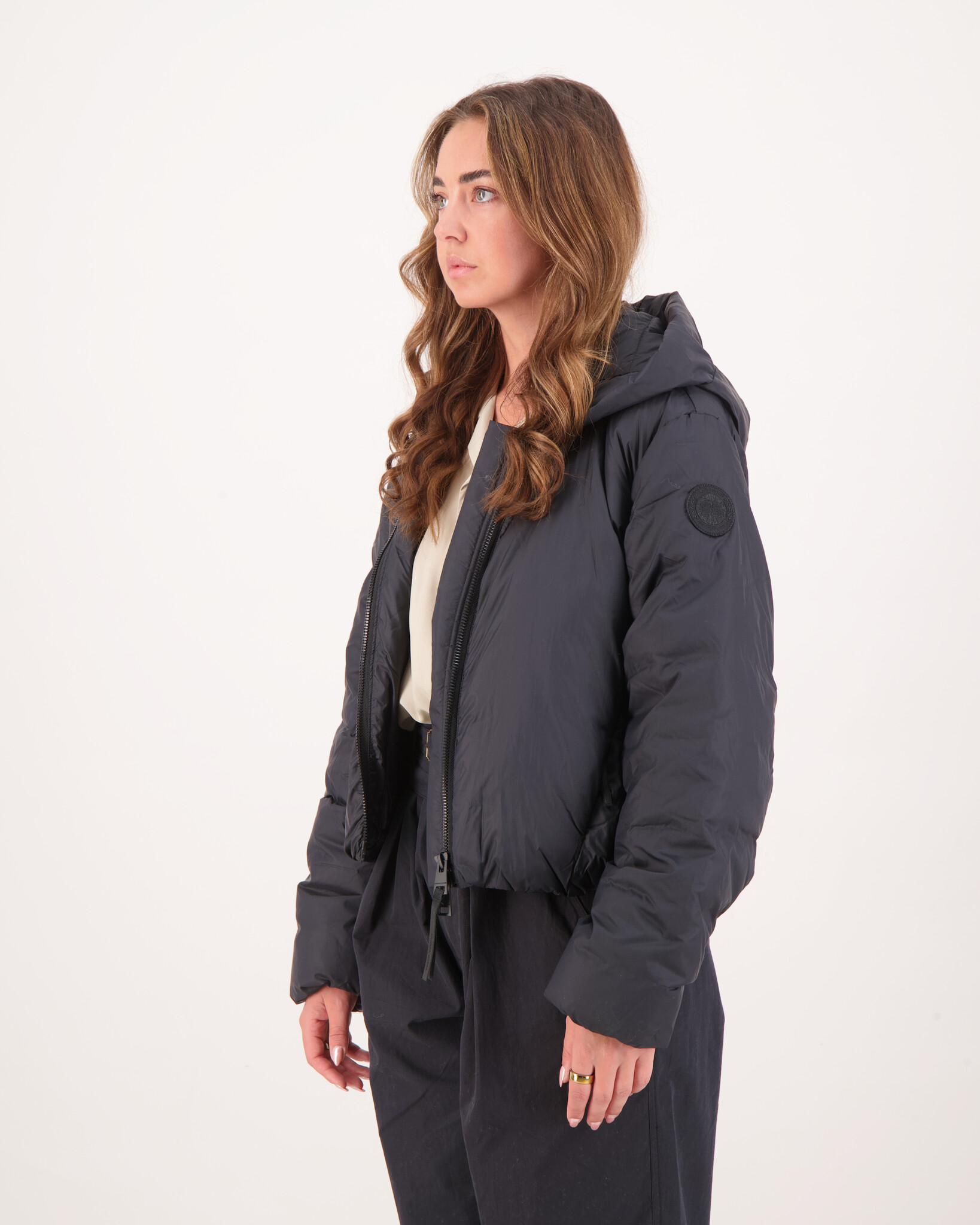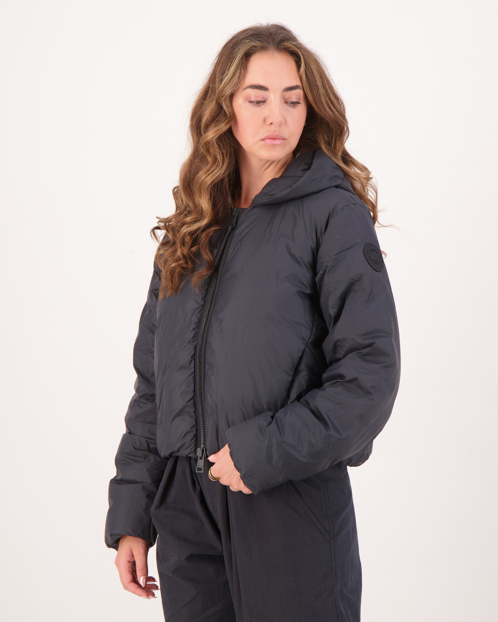 Zwarte 'Elba Jacket' van het merk Canada Goose. De jas heeft een rechte pasvorm met lange mouwen en een capuchon die zacht aansluit bij het hoofd voor extra bescherming tegen wind en koude.