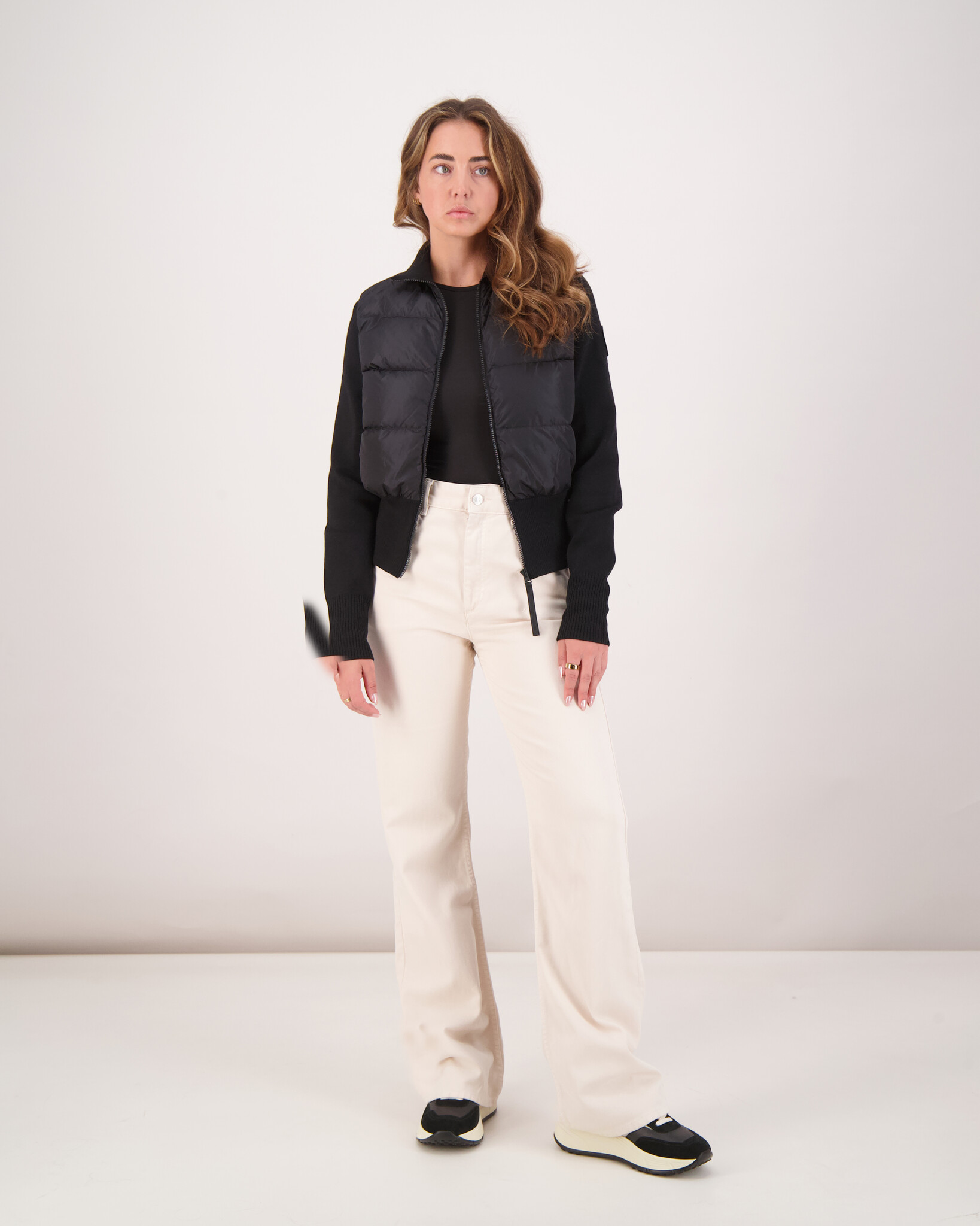 Zwarte 'HyBridge Wide Quilt Knit Jacket' van het merk Canada Goose. De jacket is een verfijnde midlayer die merinowol combineert met slijtvaste nylon voor lichtgewicht isolatie en comfortabele bewegingsvrijheid. De jacket heeft een ribgebreide kraag, mouwen en tailleband die voor extra comfort en vormbehoud zorgen. De jacket sluit met een centrale ritssluiting en heeft twee buitenzakken met fleecevoering voor jouw handen en één ritszak aan de binnenzijde voor veilige opbergruimte. De jas heeft het Canada Goose logo op de linker mouw in dezelfde kleur als de jas.