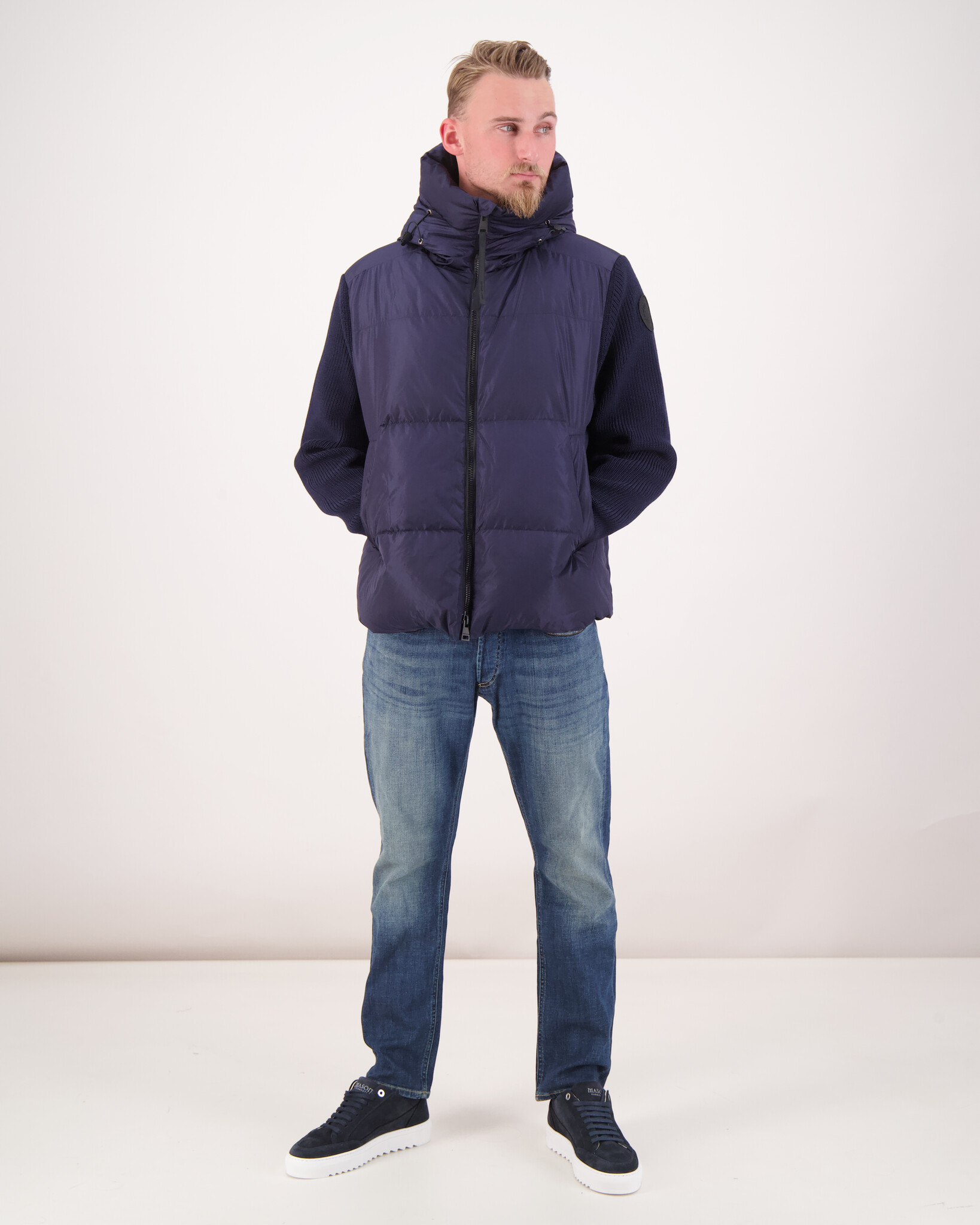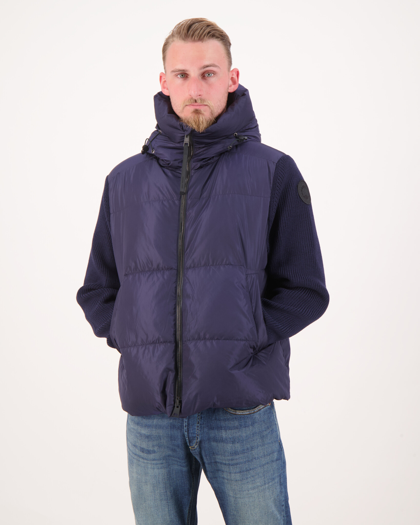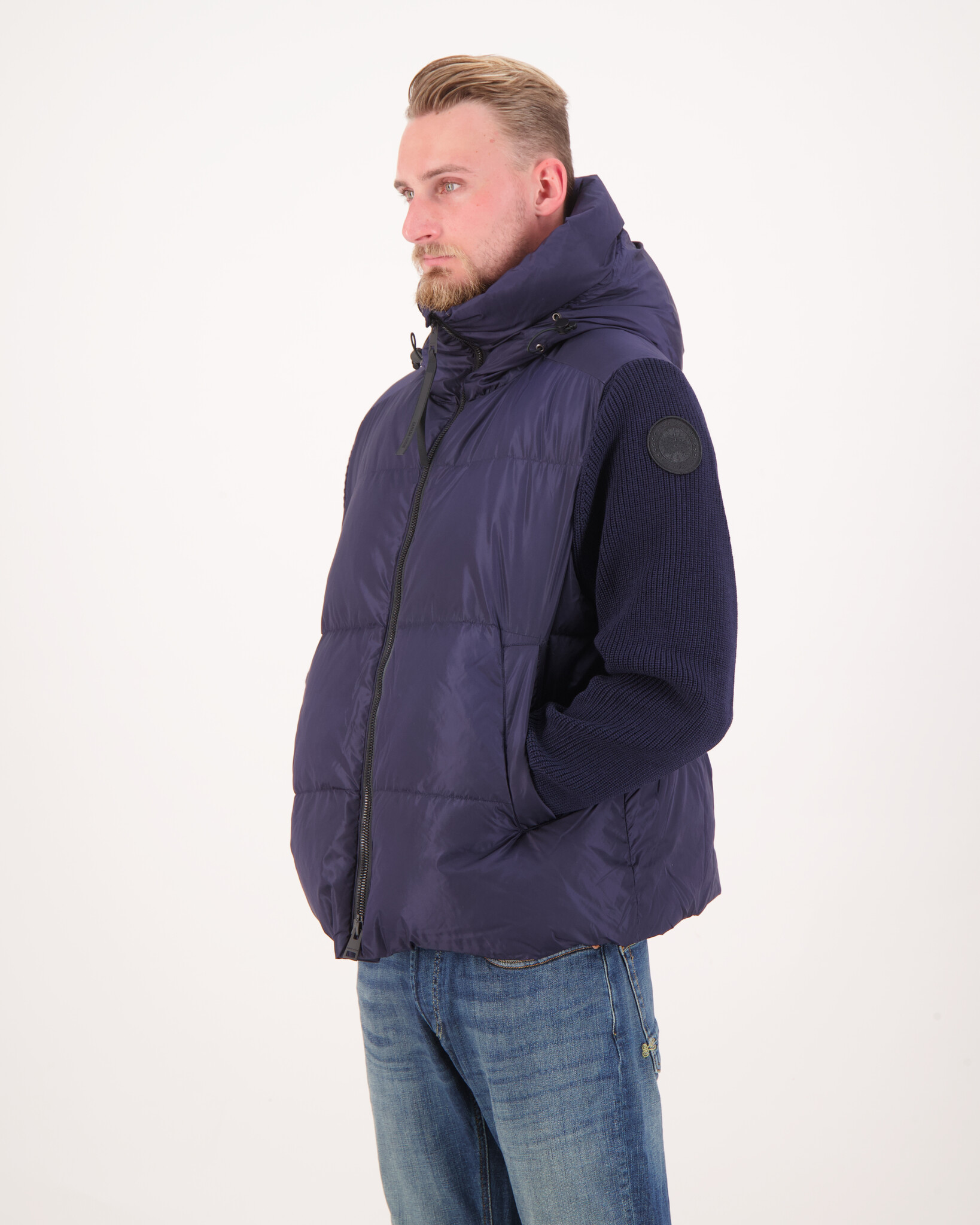 Marine 'HyBridge Grove Knit Hoody Jacket' van het merk Canada Goose. De zwarte HyBridge Grove Knit Hoody Jacket is een stijlvolle en functionele jas die knitwear en technische stoffen combineert. Deze hybride hoodie biedt een perfecte balans tussen warmte en bewegingsvrijheid, met donsgevulde panelen voor isolatie en gebreide mouwen en zijkanten voor comfort en flexibiliteit. Ideaal voor dagelijks gebruik in frisse weersomstandigheden, met een verfijnde, sportieve look.