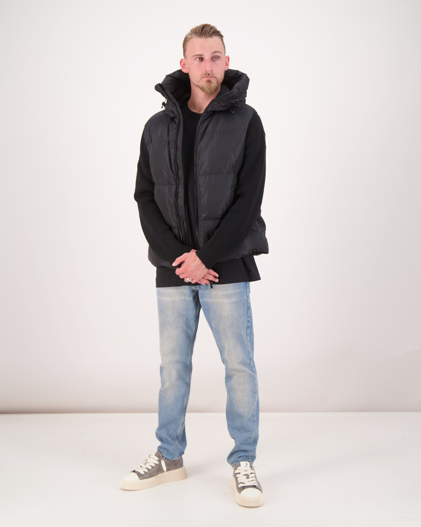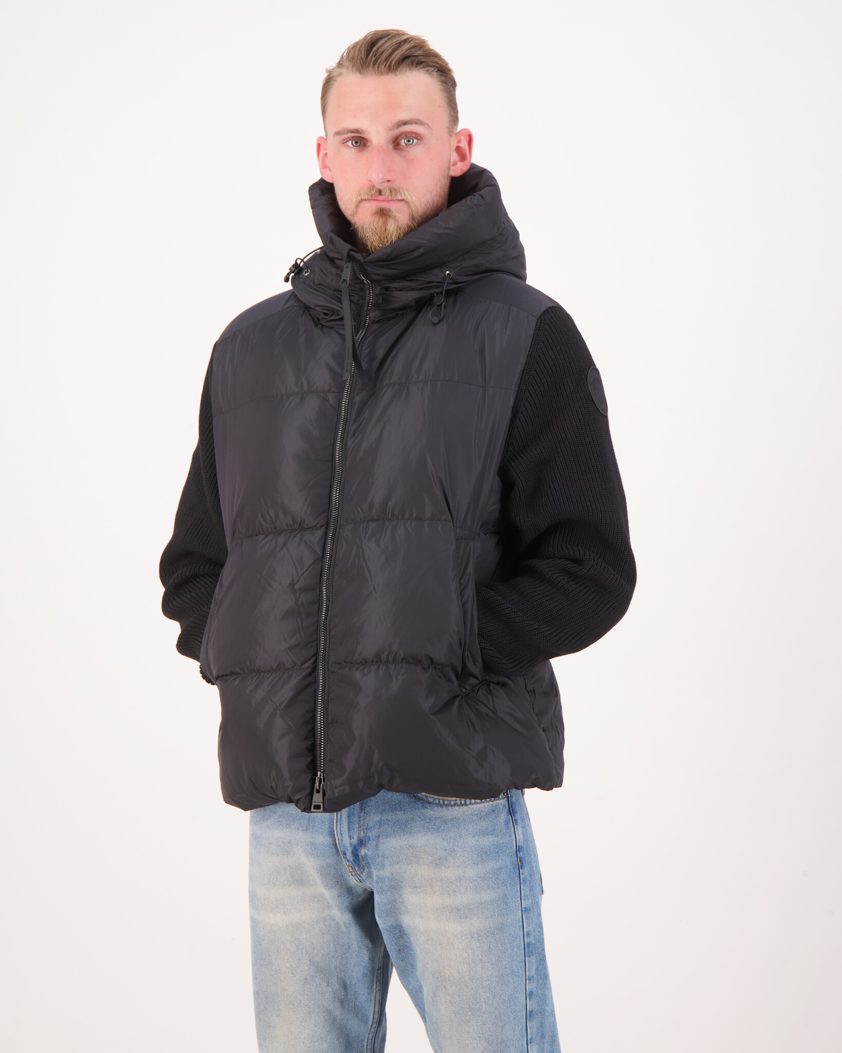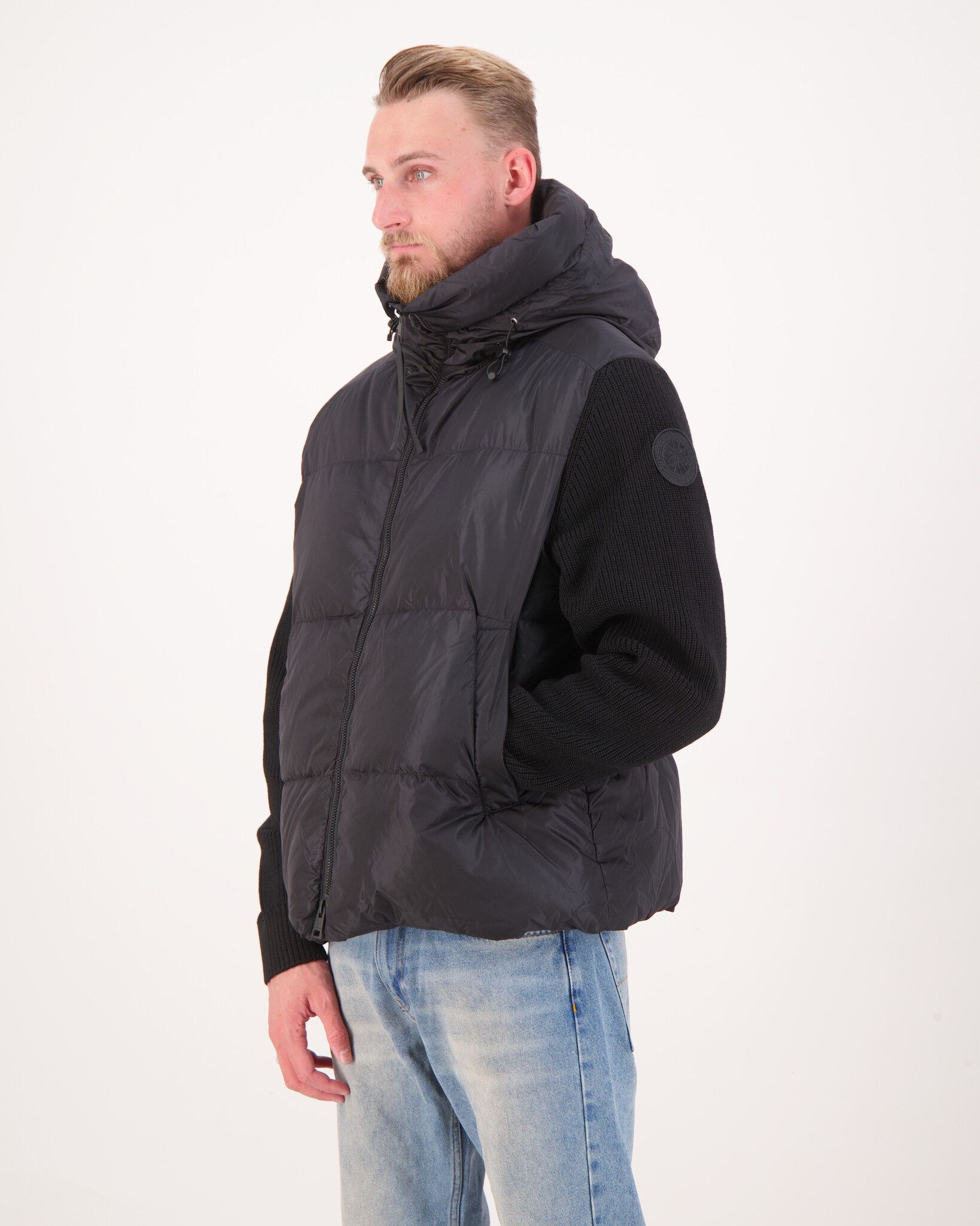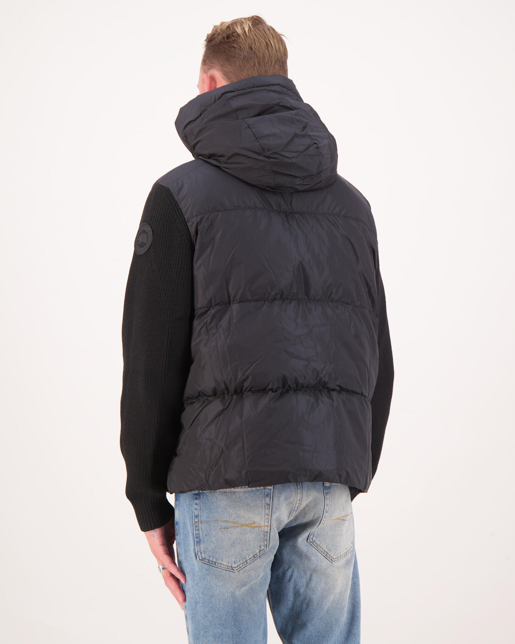 Zwarte 'HyBridge Grove Knit Hoody Jacket' van het merk Canada Goose. De zwarte HyBridge Grove Knit Hoody Jacket is een stijlvolle en functionele jas die knitwear en technische stoffen combineert. Deze hybride hoodie biedt een perfecte balans tussen warmte en bewegingsvrijheid, met donsgevulde panelen voor isolatie en gebreide mouwen en zijkanten voor comfort en flexibiliteit. Ideaal voor dagelijks gebruik in frisse weersomstandigheden, met een verfijnde, sportieve look.
