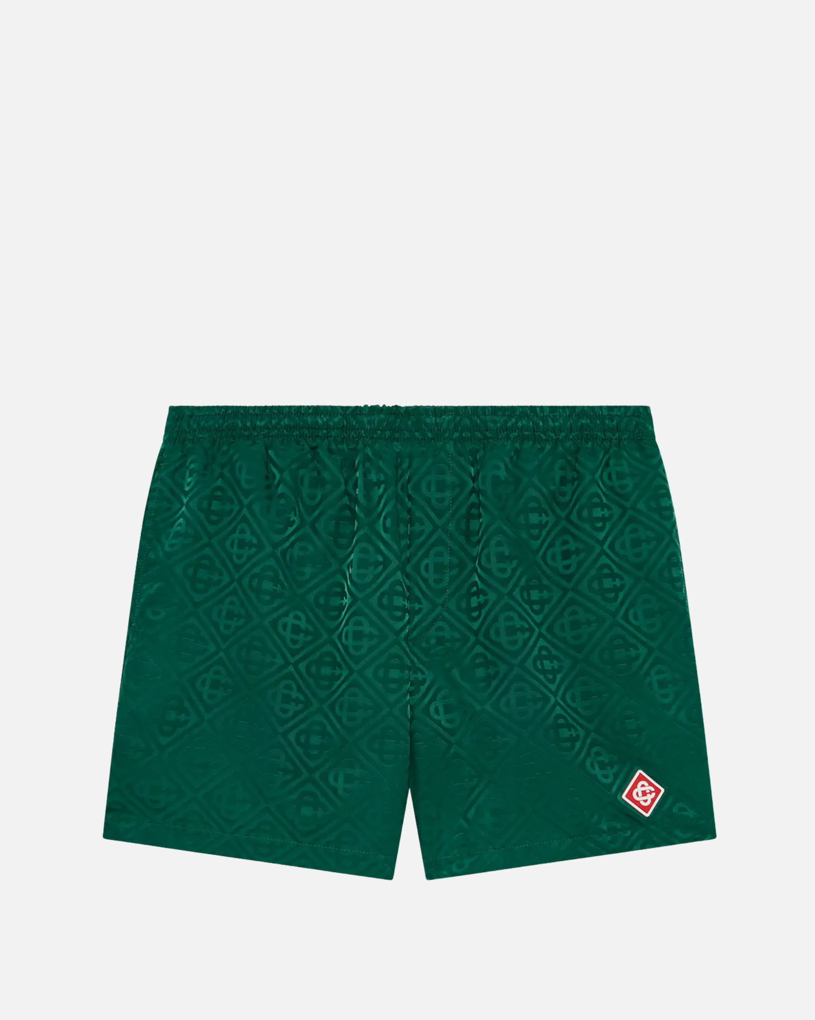 Groene Monogram Jacquard Swim Short van het merk Casablanca. De jacquard swim short is een verfijnd zwemkledingontwerp, vervaardigd uit technische zwemstof en uitgevoerd met het kenmerkende diamantlogo van het huis. Het model heeft een all-over print in de herkenbare monogramstof en is afgewerkt met een elastische tailleband en een interne trekkoordsluiting. Inseamzakken en een mesh voering maken het ontwerp compleet.