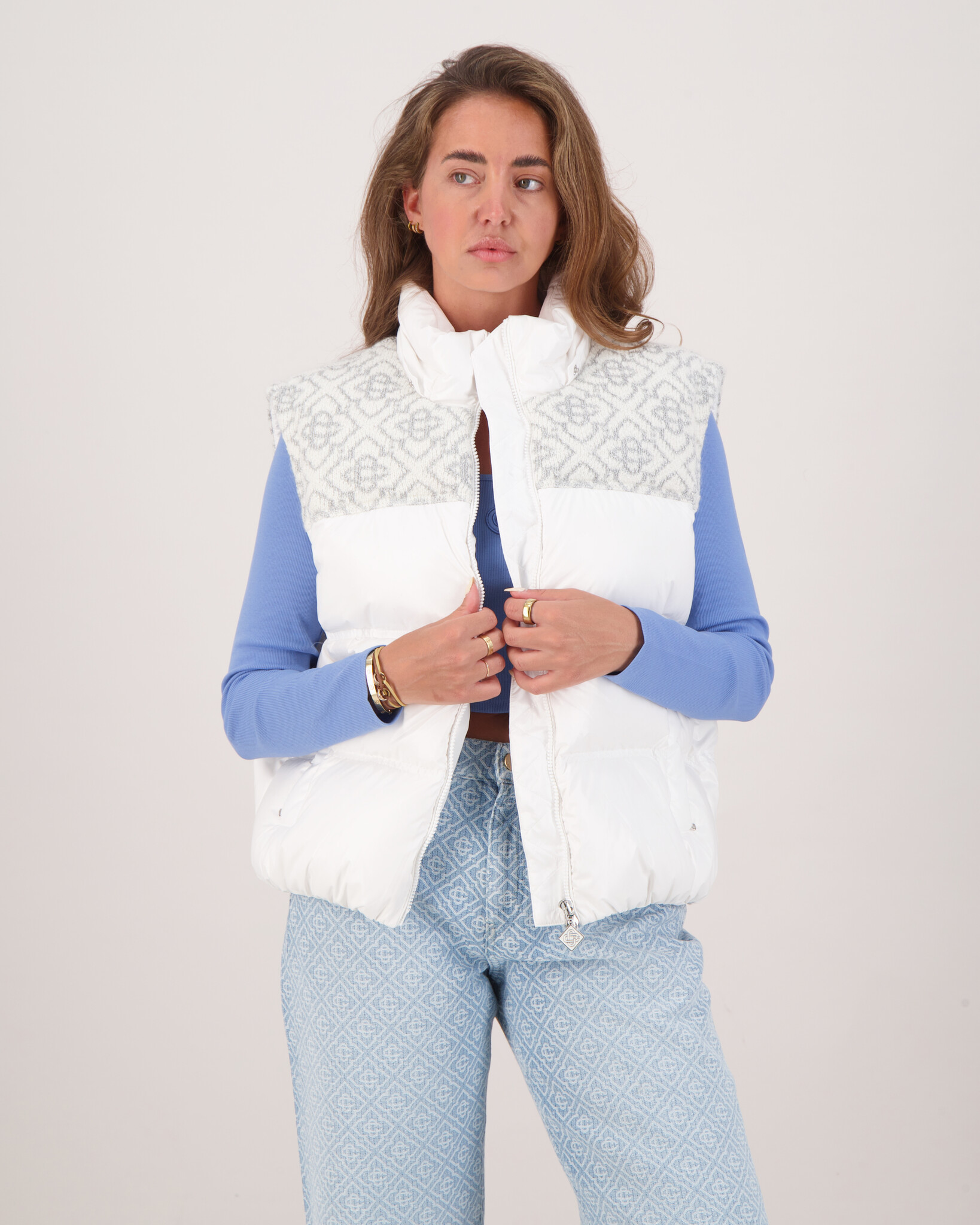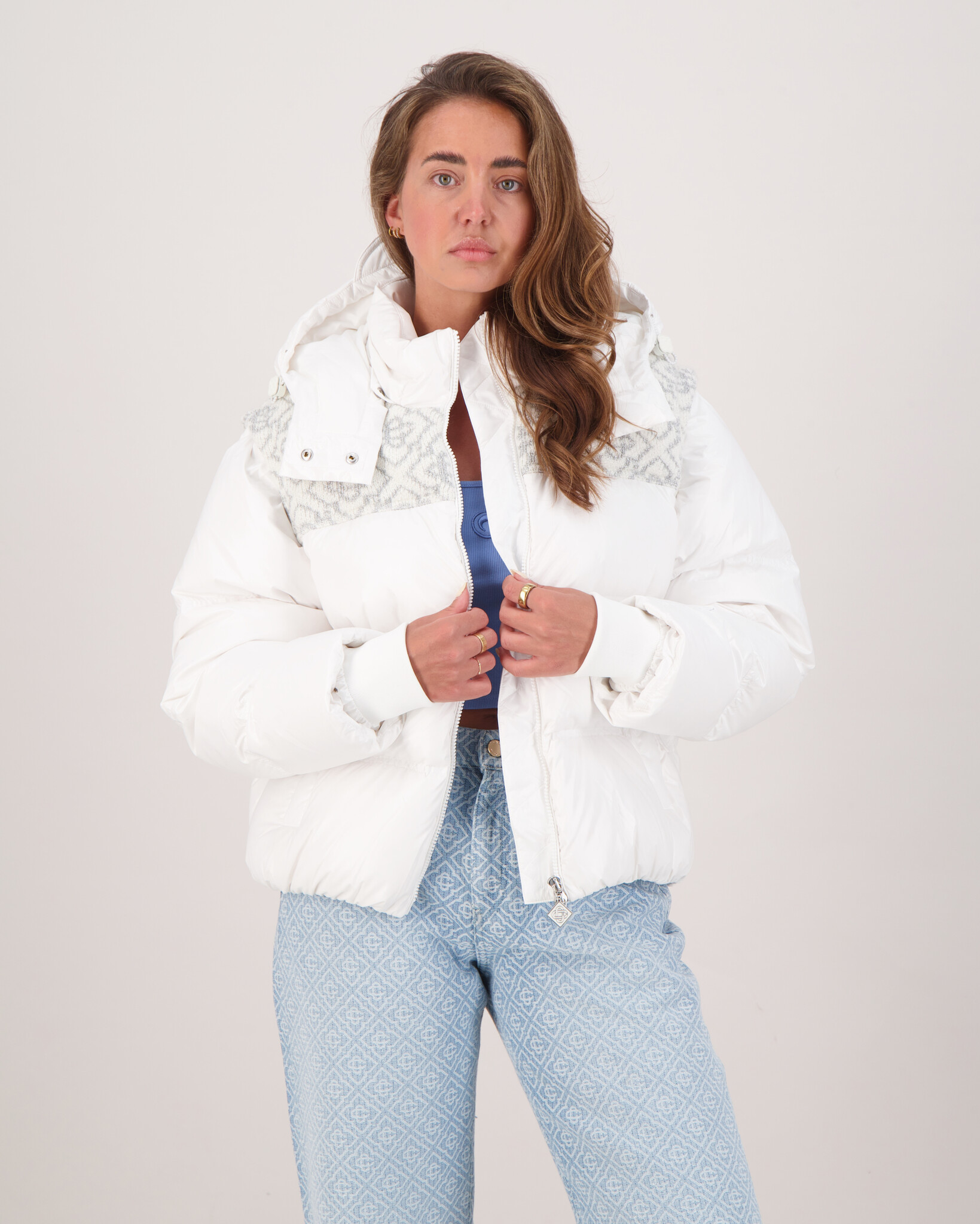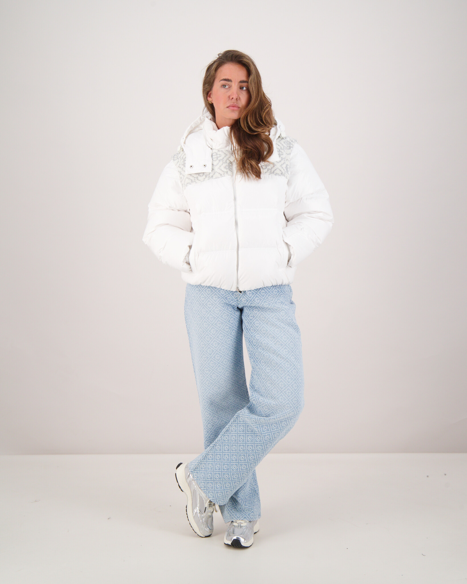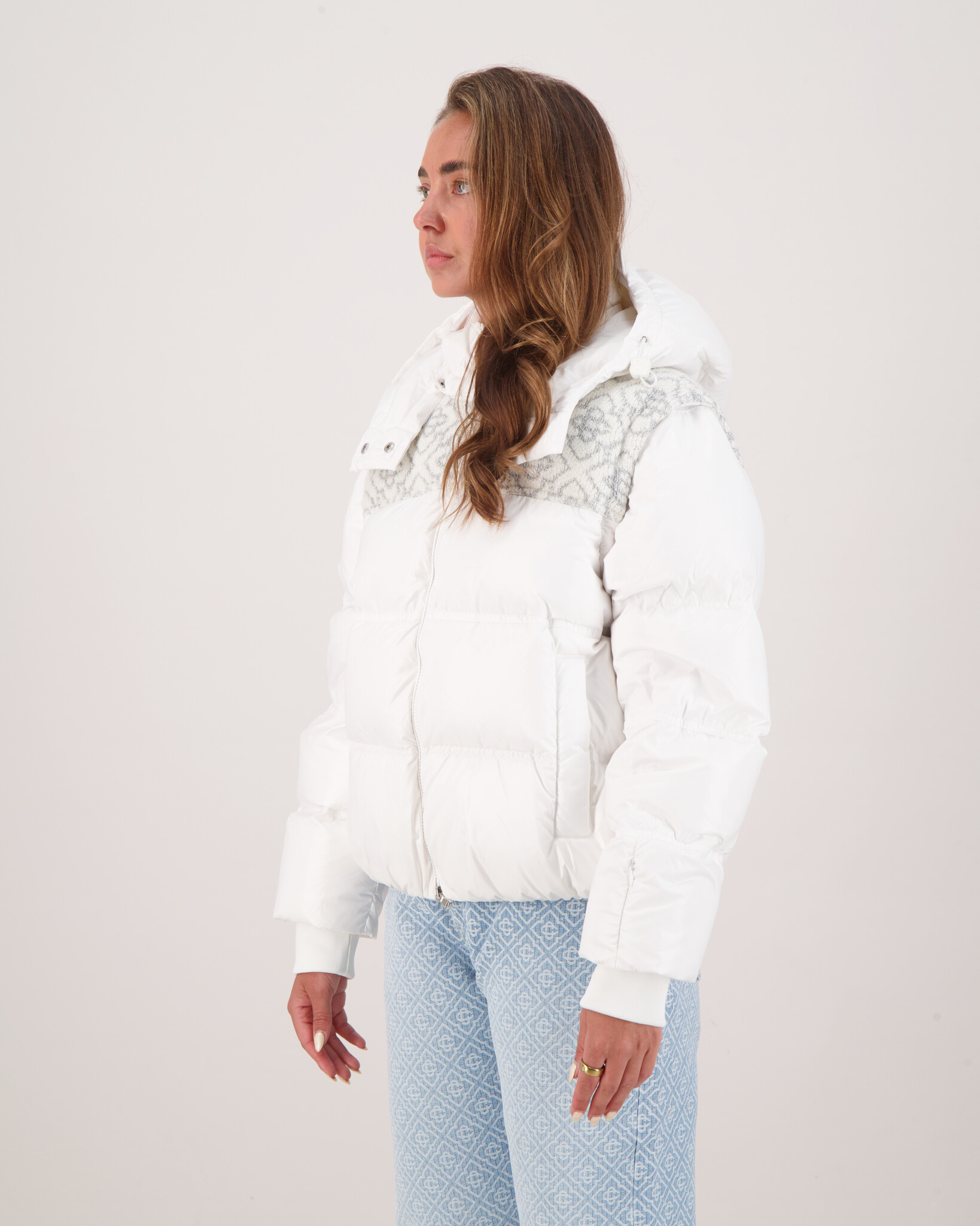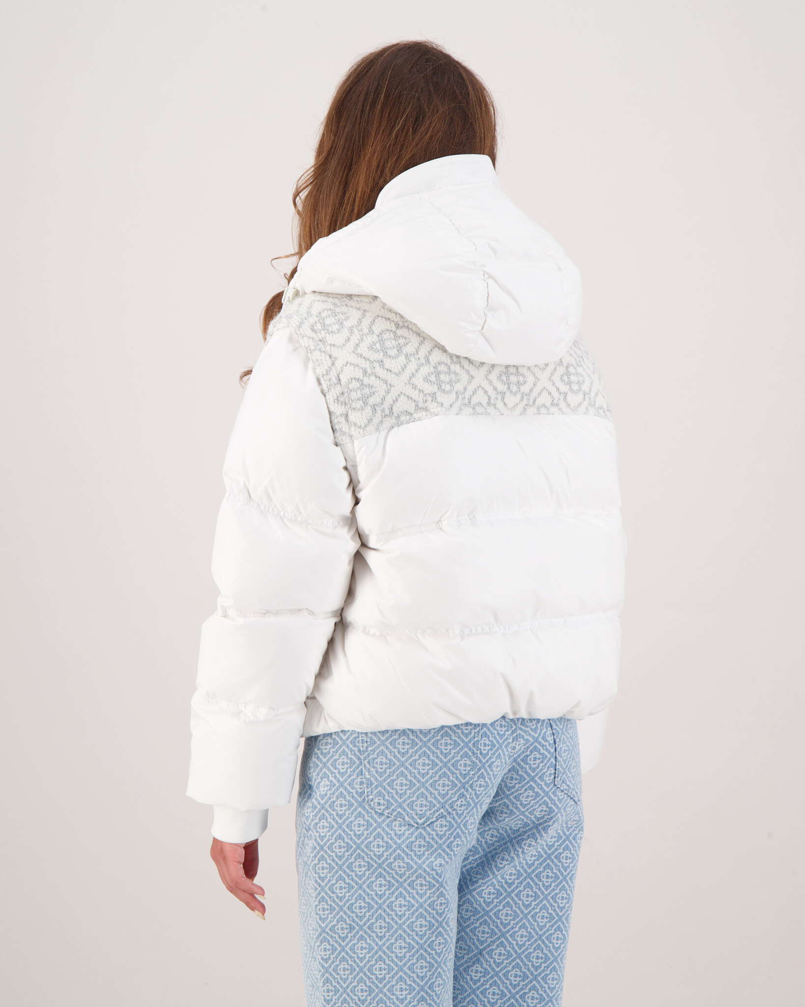 Wit Nylon Ripstop Puffer Jacket van het merk Casablanca. Stijl en comfort komen samen in deze opvallende puffer jacket van Casablanca. Gemaakt van lichtgewicht nylon met een luxe donsvulling, biedt deze jas ultieme warmte zonder zwaar aan te voelen. Het subtiele monogramdetail op de schouders en de verfijnde afwerking maken dit geen gewone winterjas, maar een echt statement piece. Of je nu door de stad loopt of op weg bent naar een avond uit – met deze jas blijf je warm én stijlvol.
