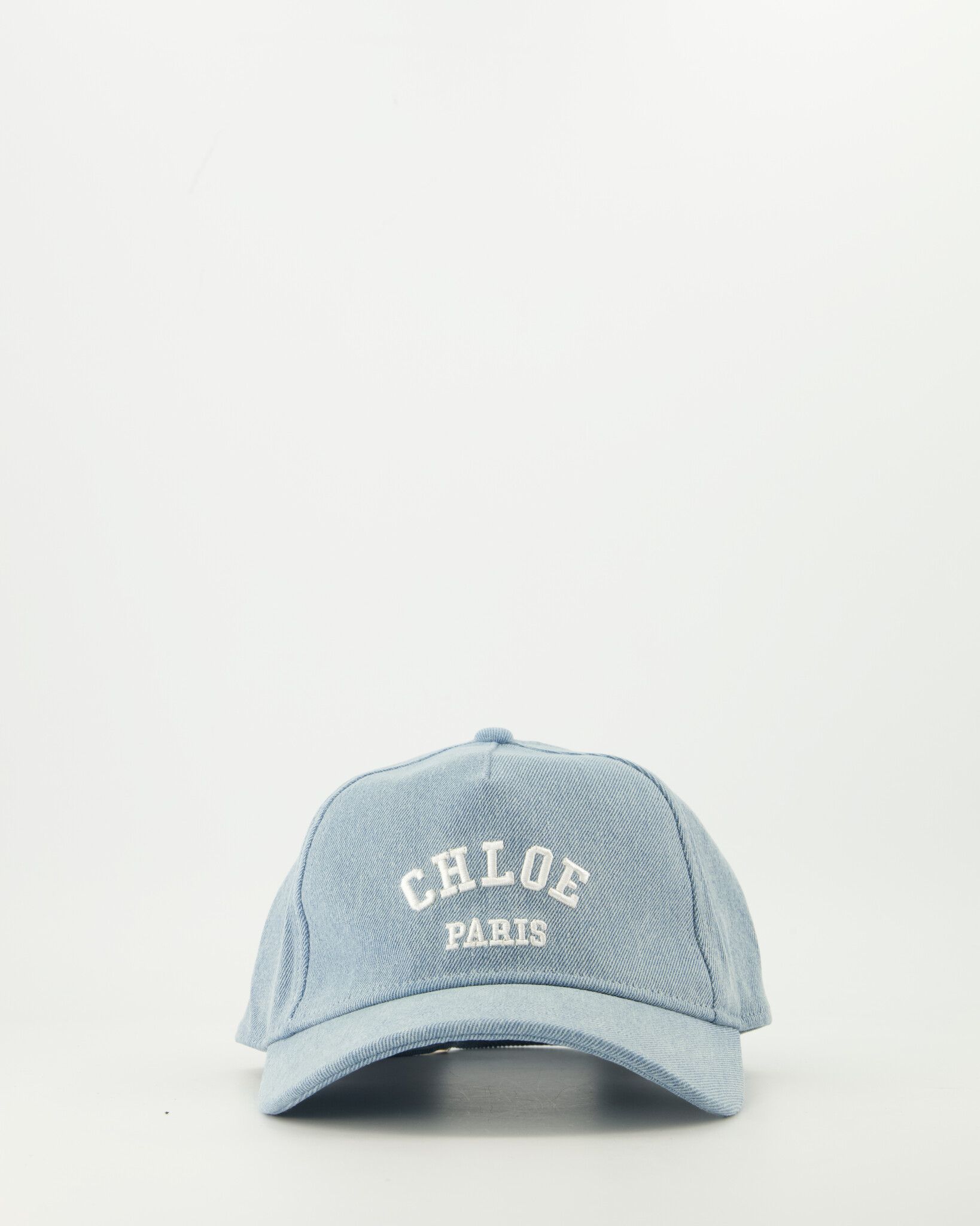 Blauwe Chloe Denim Cap van het merk Chloé Kids. De Chloé Denim Cap met een cursief Chloé-logo aan de voorkant. Aan de achterkant zit een verstelbare gouden messing ketting.