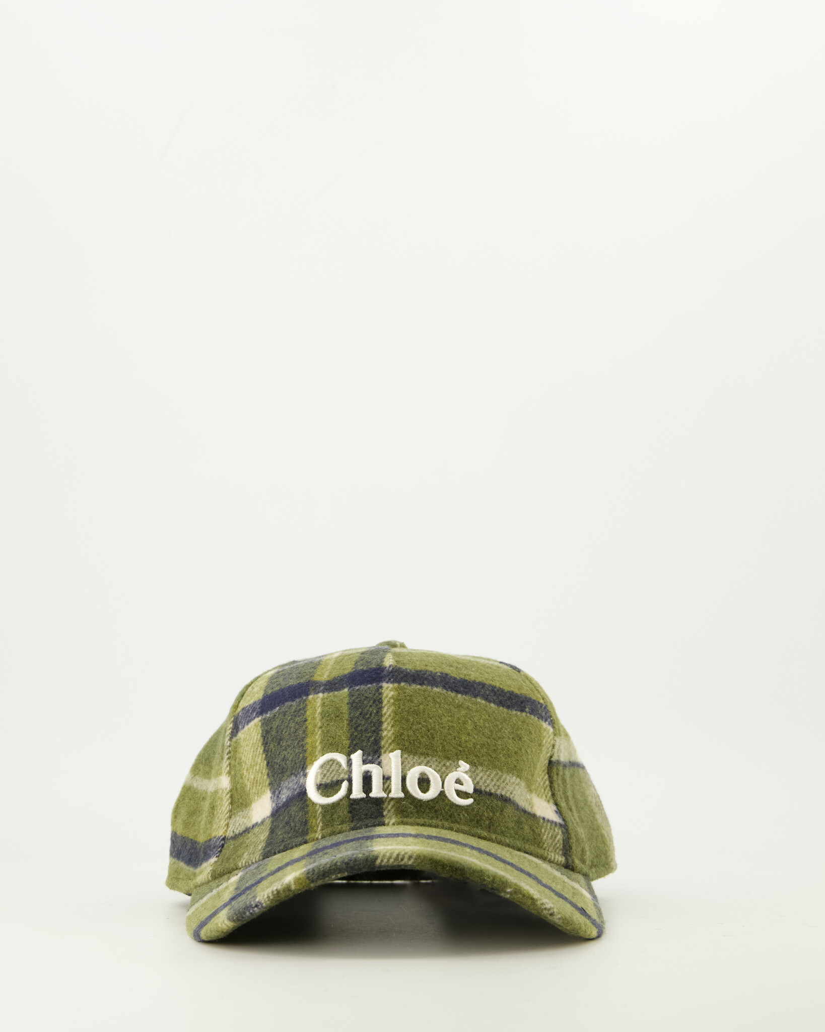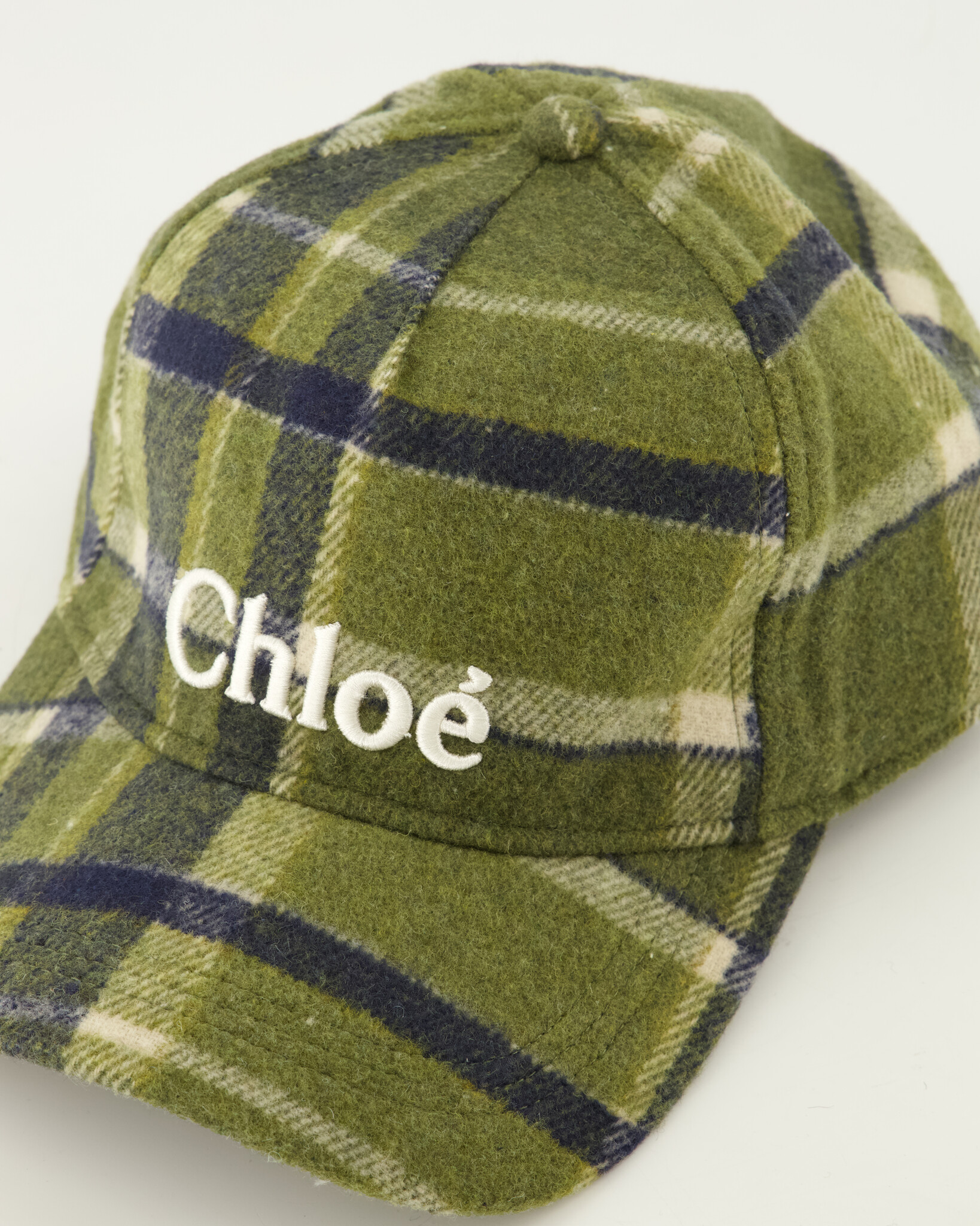 Een trendy en verfijnde pet voor meisjes uit de Chloé Kids-collectie. Deze baseballcap is uitgevoerd in een levendig groen ruitmotief, afgewerkt met een subtiel maar herkenbaar geborduurd Chloé-logo aan de voorkant. De stevige klep behoudt zijn vorm en de velcro-sluiting maakt hem verstelbaar voor een comfortabele pasvorm.