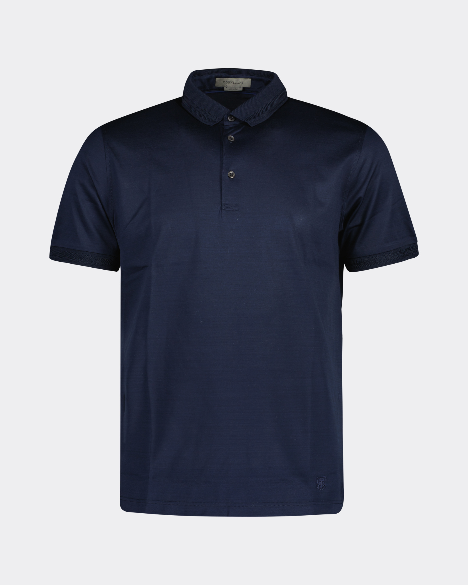 Blauwe Maglieria Polo van het merk Cornelini. De Polo heeft in de kraag een patroon en kan afgesloten worden door middel van 3 knopen.