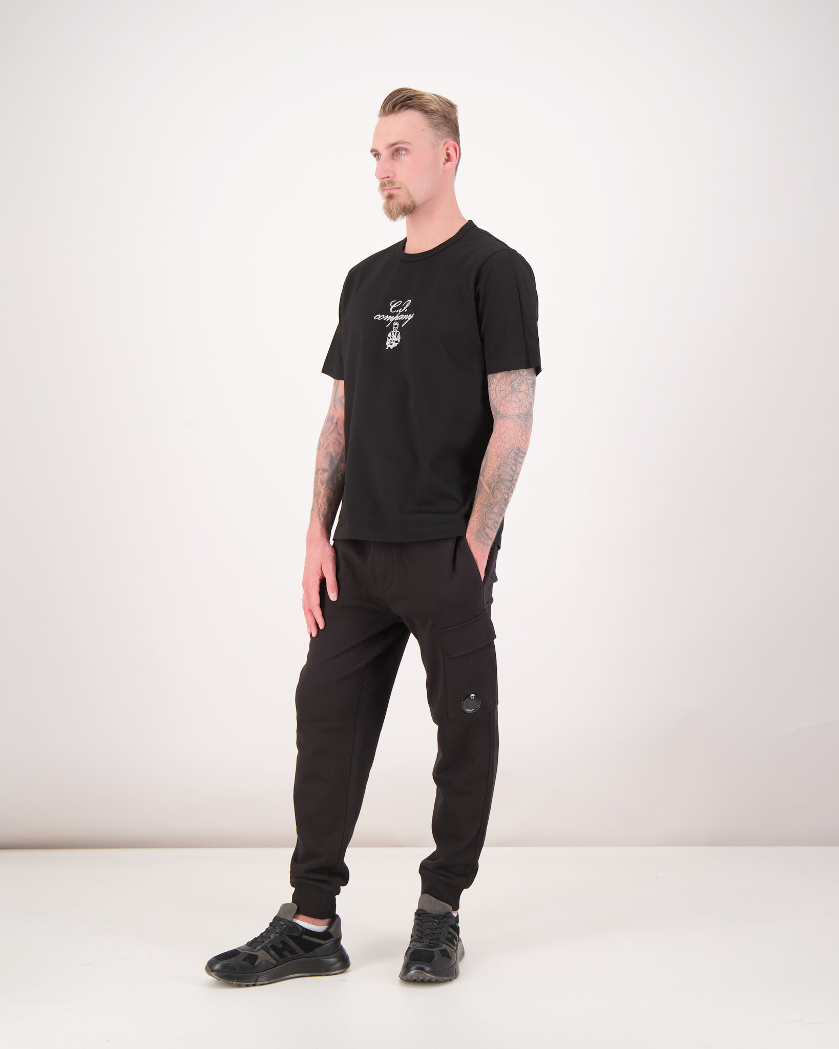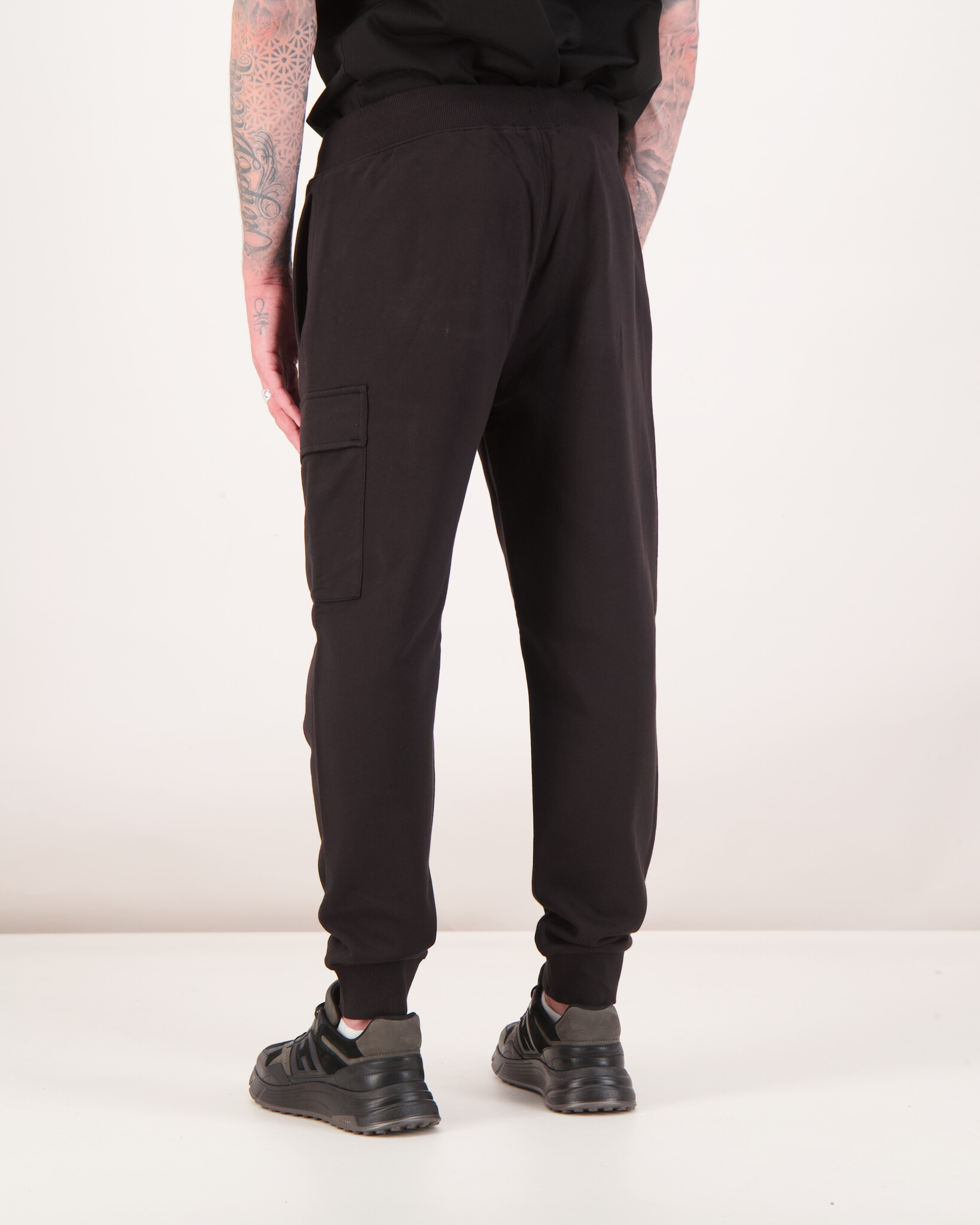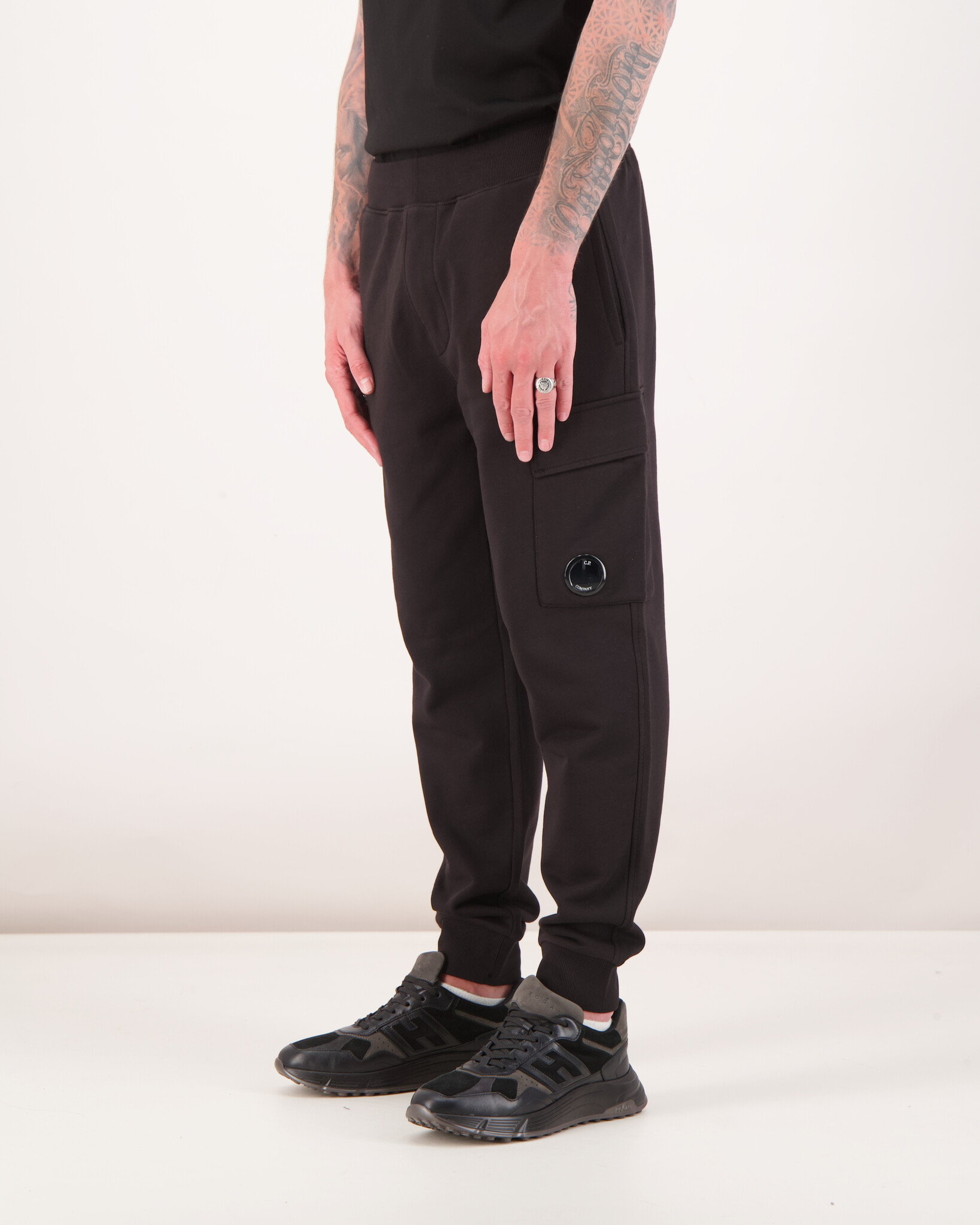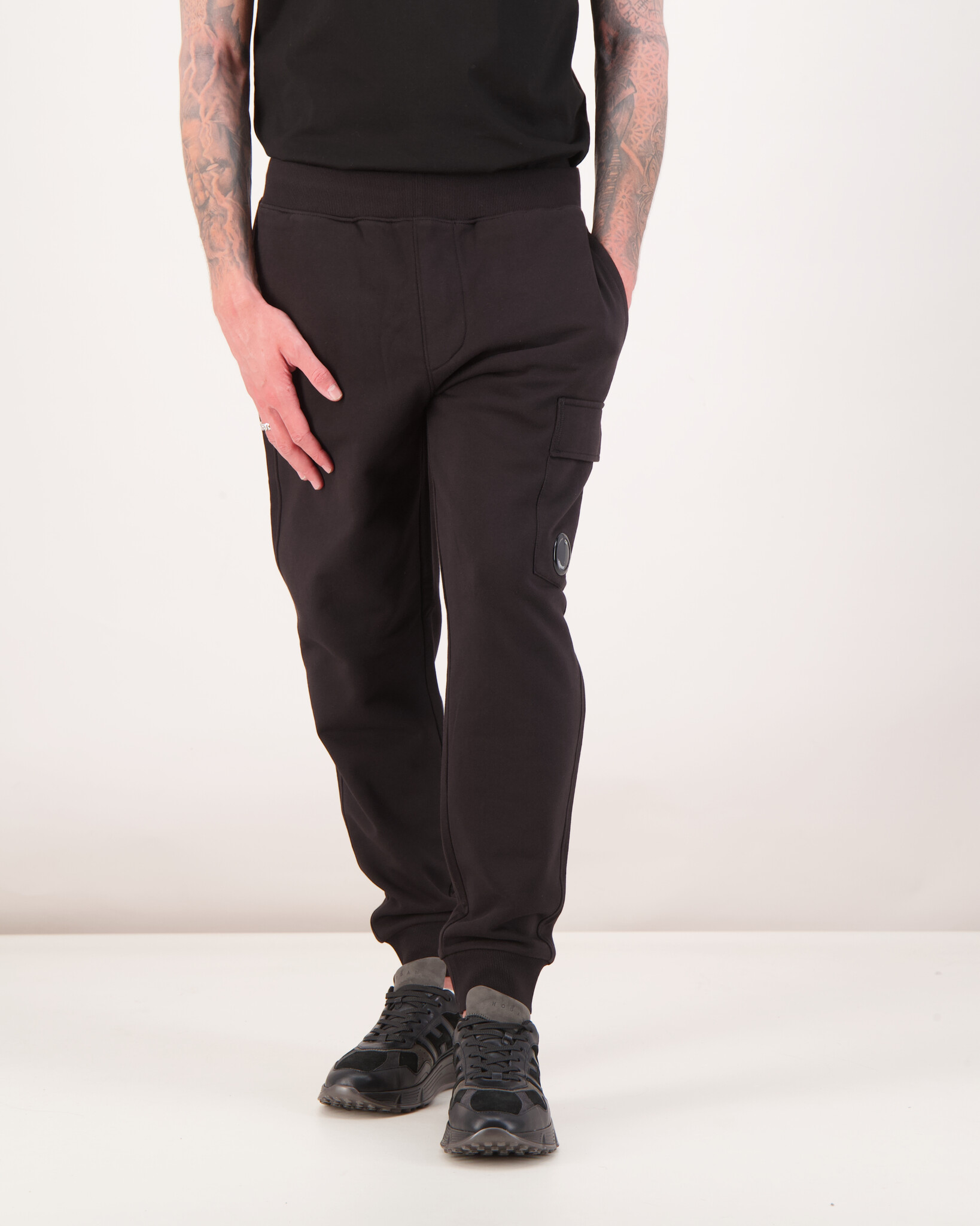 Zwarte Diagonal Raised Fleece Cargo Sweatpants van het merk C.P. Company. Cargo joggingbroek met elastische tailleband met trekkoord, taps toelopende pijpen met manchetten en Lens-details op de linkerbeenzak. Gemaakt van diagonaal opgestikt fleece, een middengewicht katoenen variant die absoluut comfort combineert met een stevig en slijtvast gevoel. Normale pasvorm.