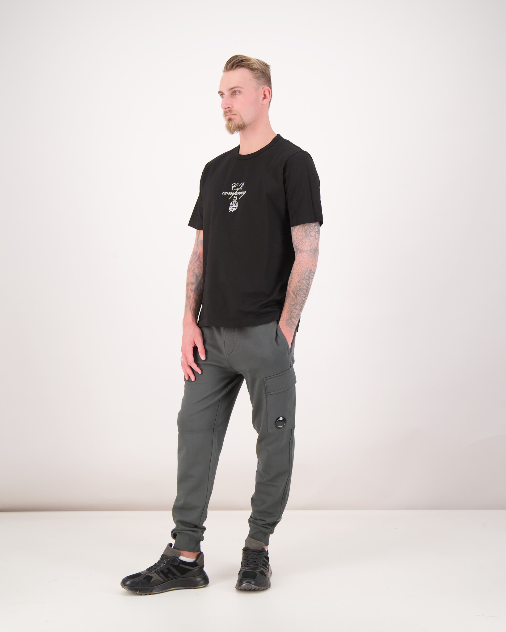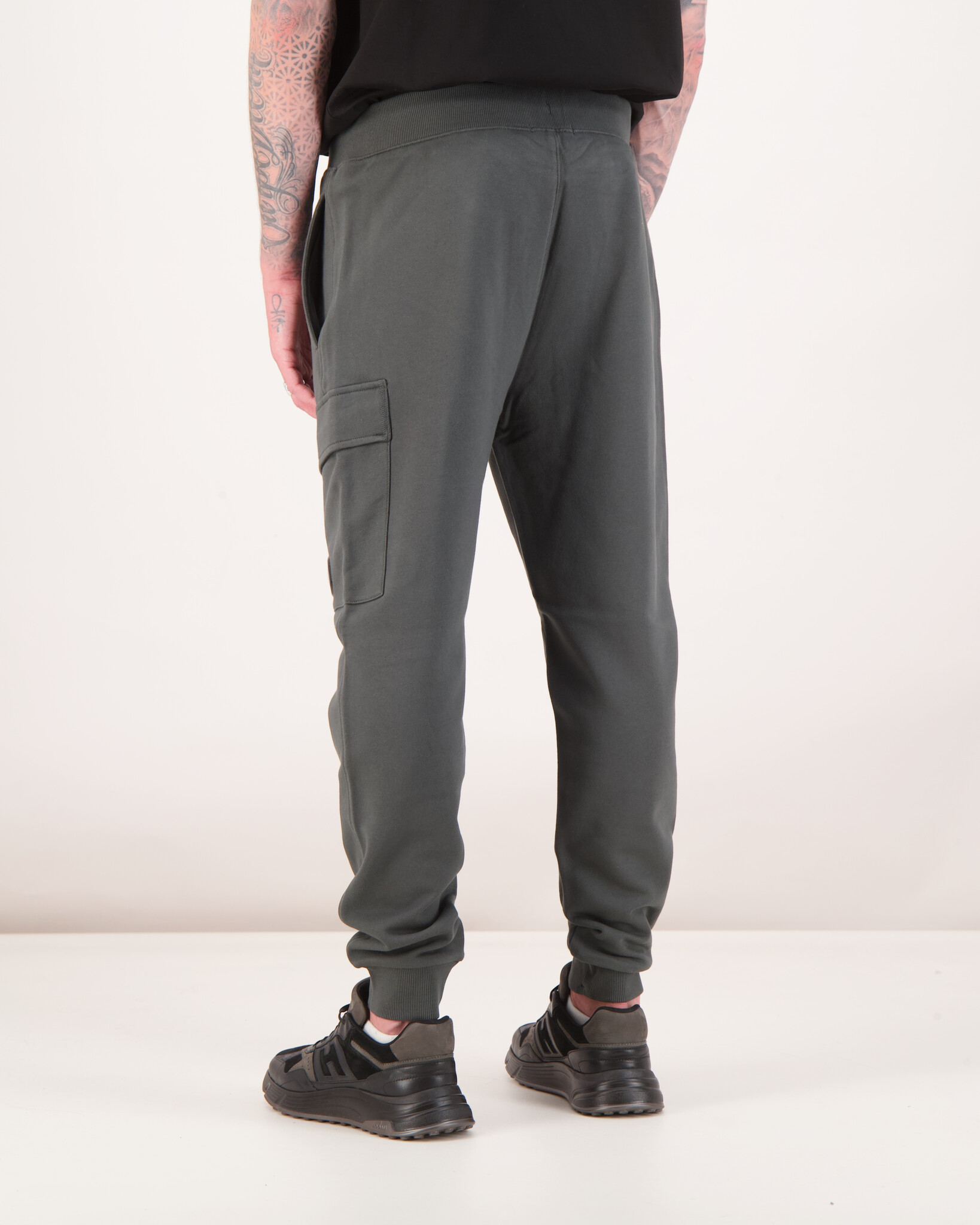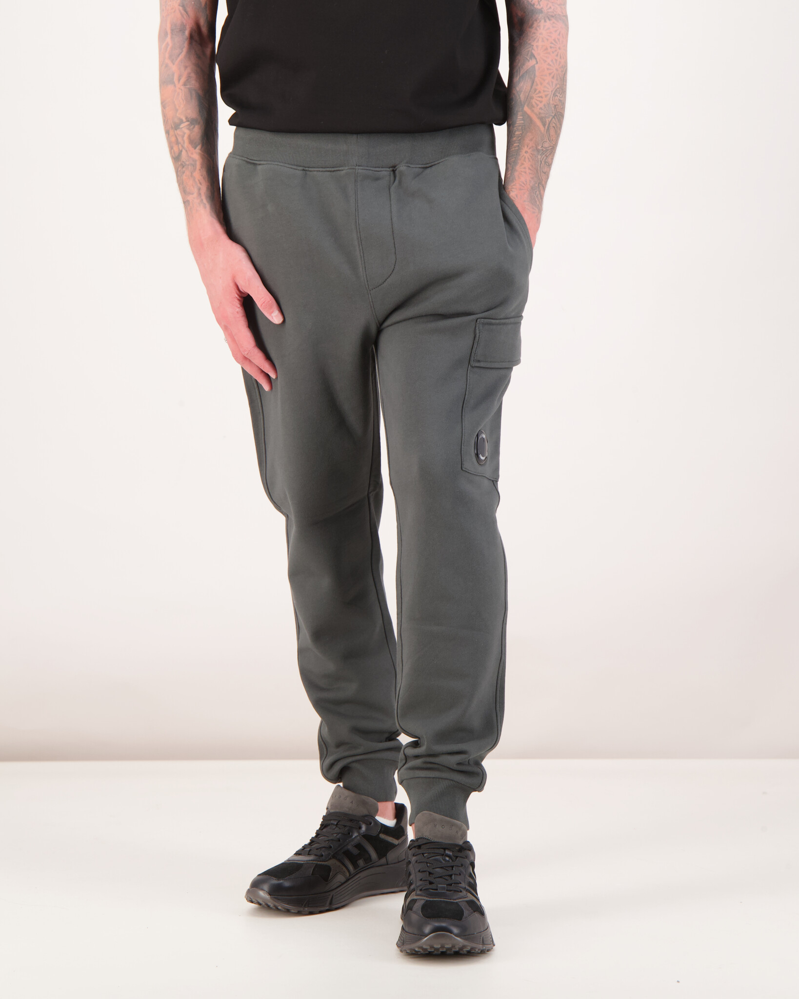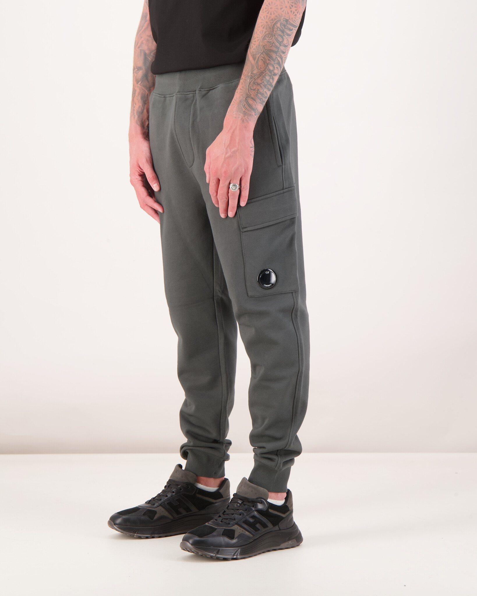 Donkergrijze Diagonal Raised Fleece Cargo van het merk C.P. Company. Cargo joggingbroek met elastische tailleband met trekkoord, taps toelopende pijpen met manchetten en Lens-details op de linkerbeenzak. Gemaakt van diagonaal opgestikt fleece, een middengewicht katoenen variant die absoluut comfort combineert met een stevig en slijtvast gevoel. Normale pasvorm.