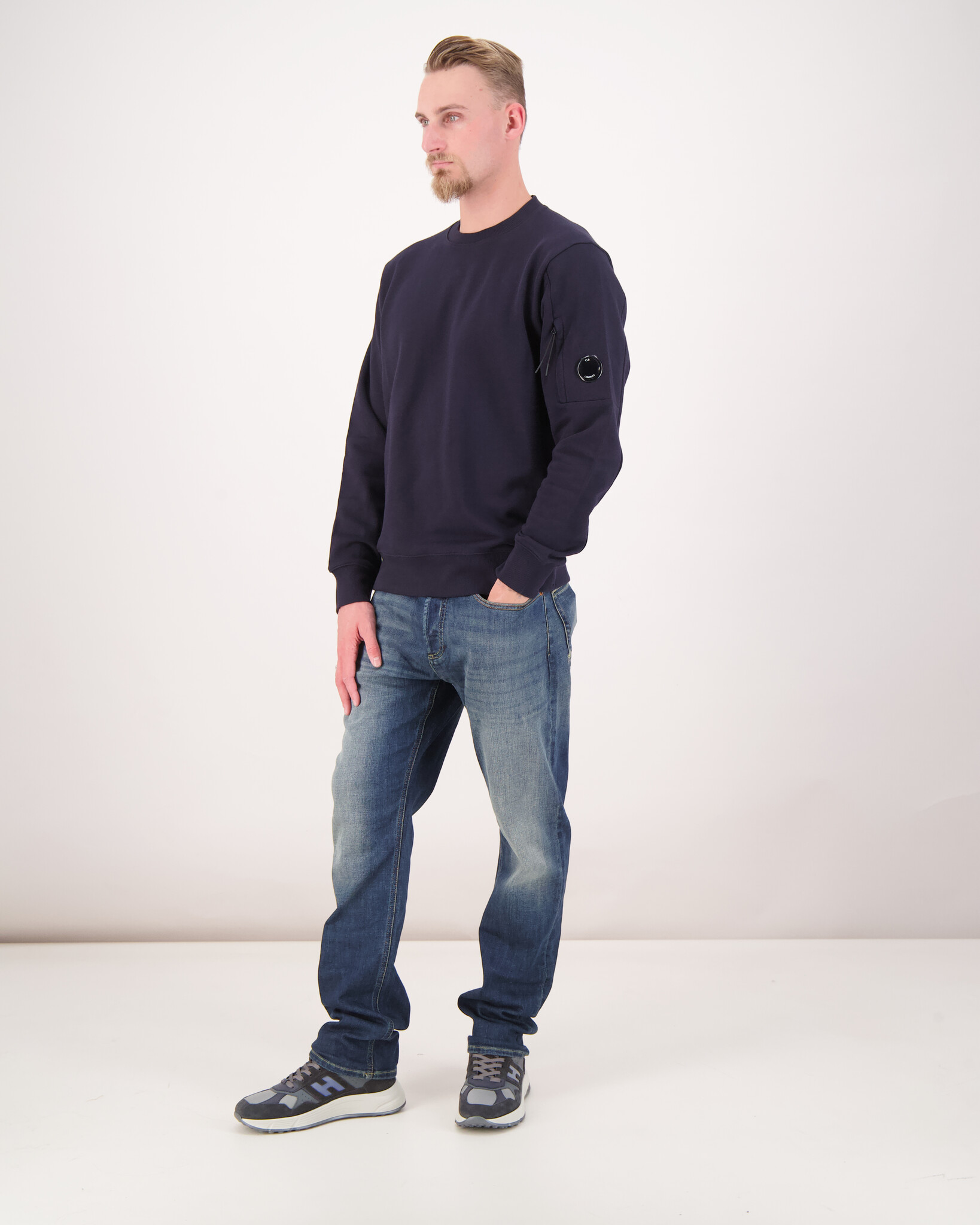 Marine Diagonal Raised Fleece Crew Neck Lens Sweatshirt van het merk C.P. Company. Sweater met ronde hals met het bekende lens logo op de linker arm.