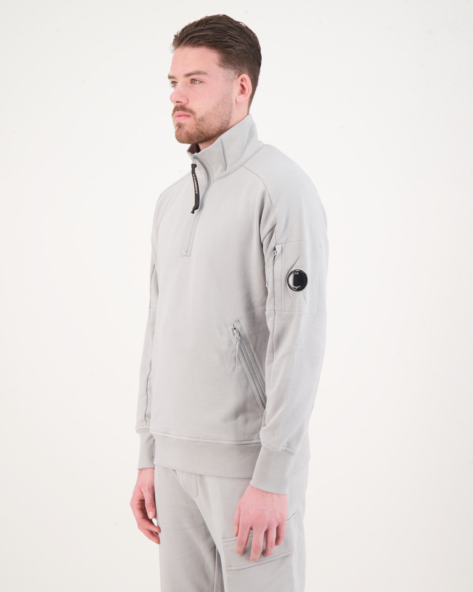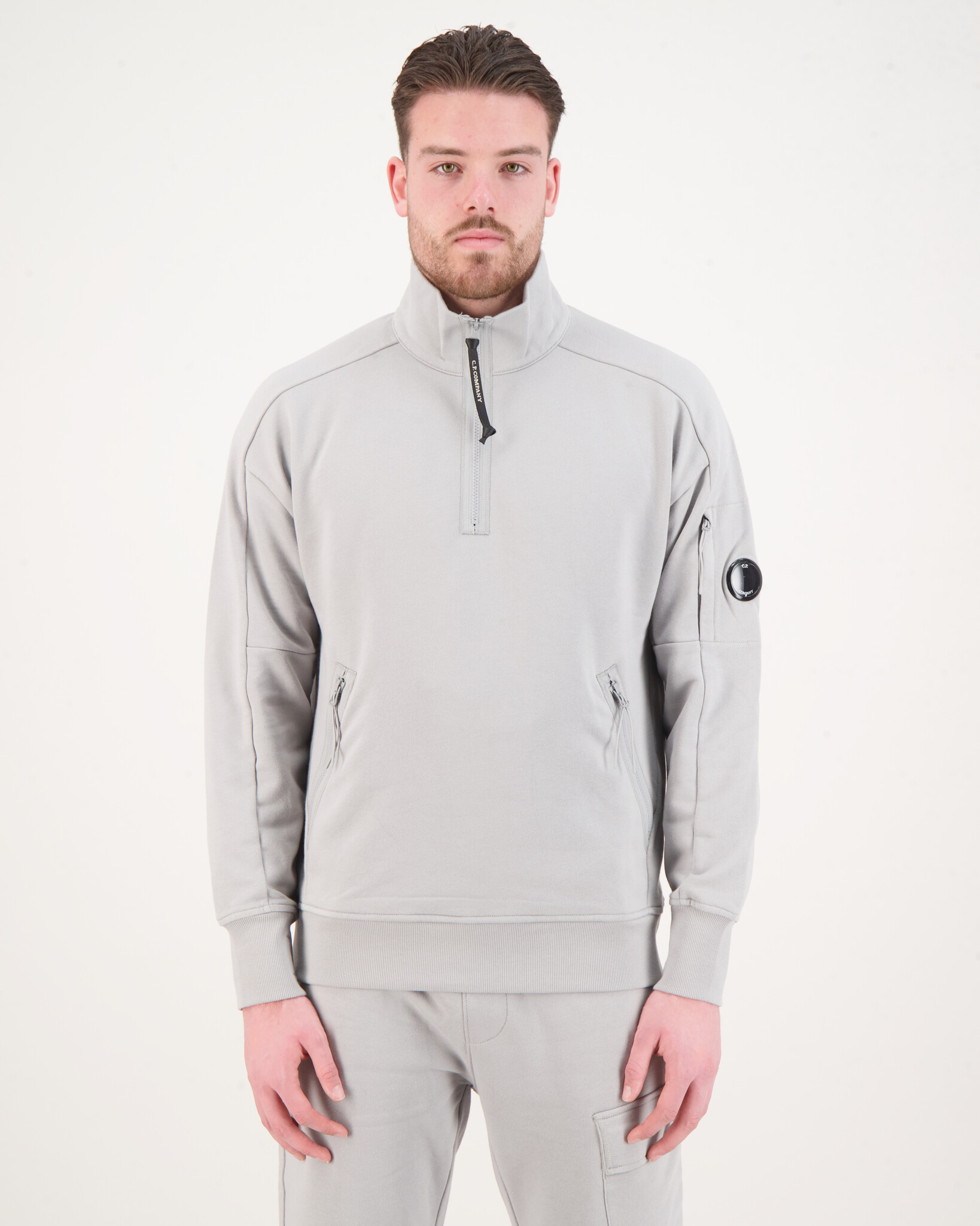 Grijs Diagonal Raised Half Zip van het merk C.P. Company. De sweater gaat dicht met een rits en heeft het bekende C.P. goggle logo op de mouw.