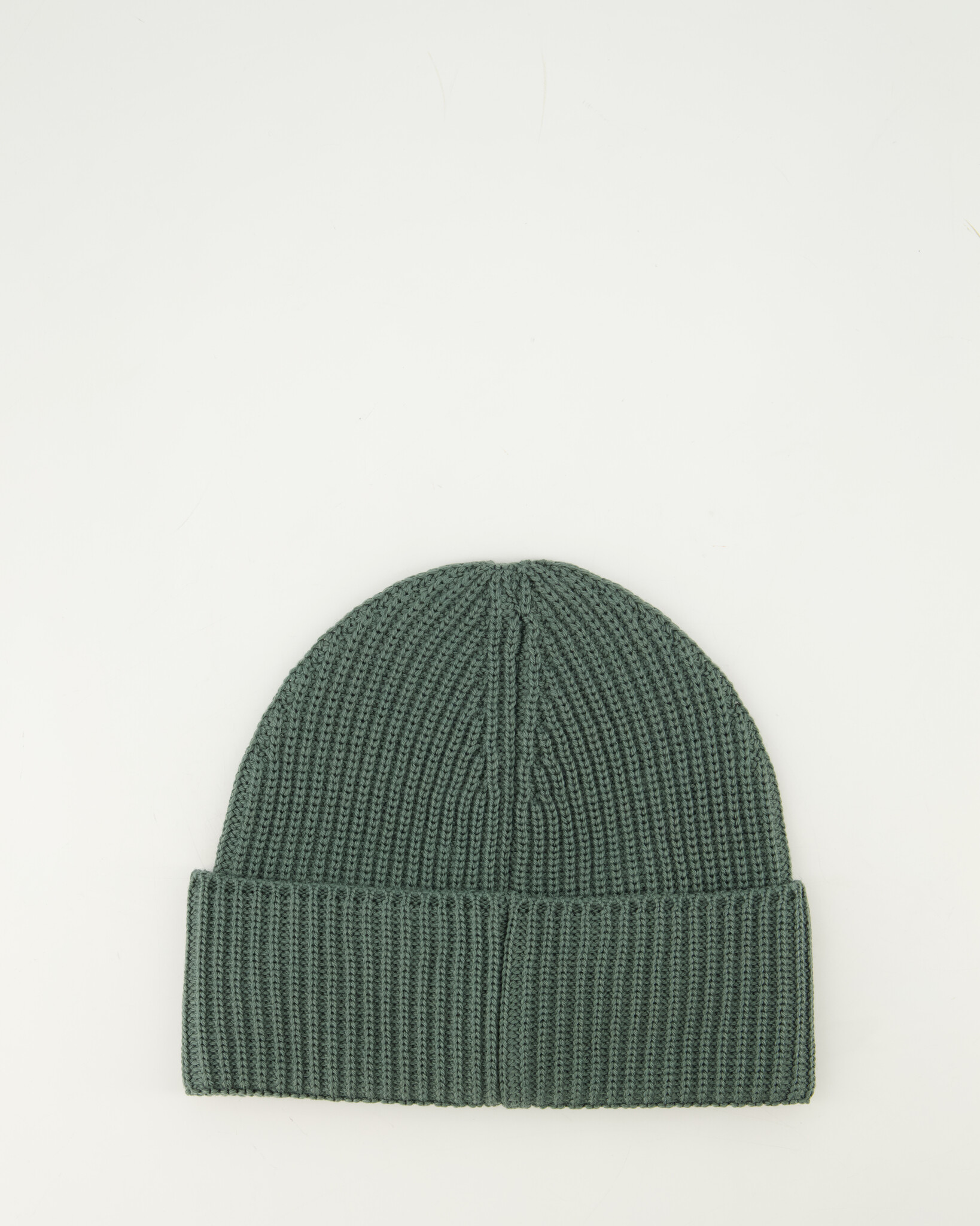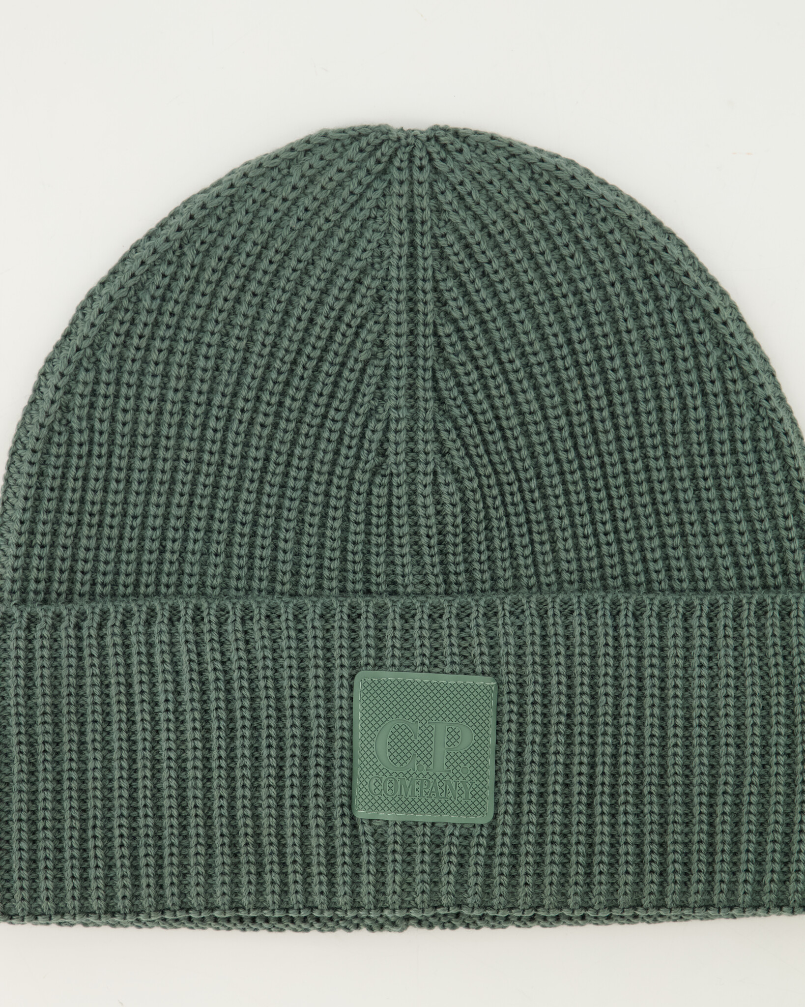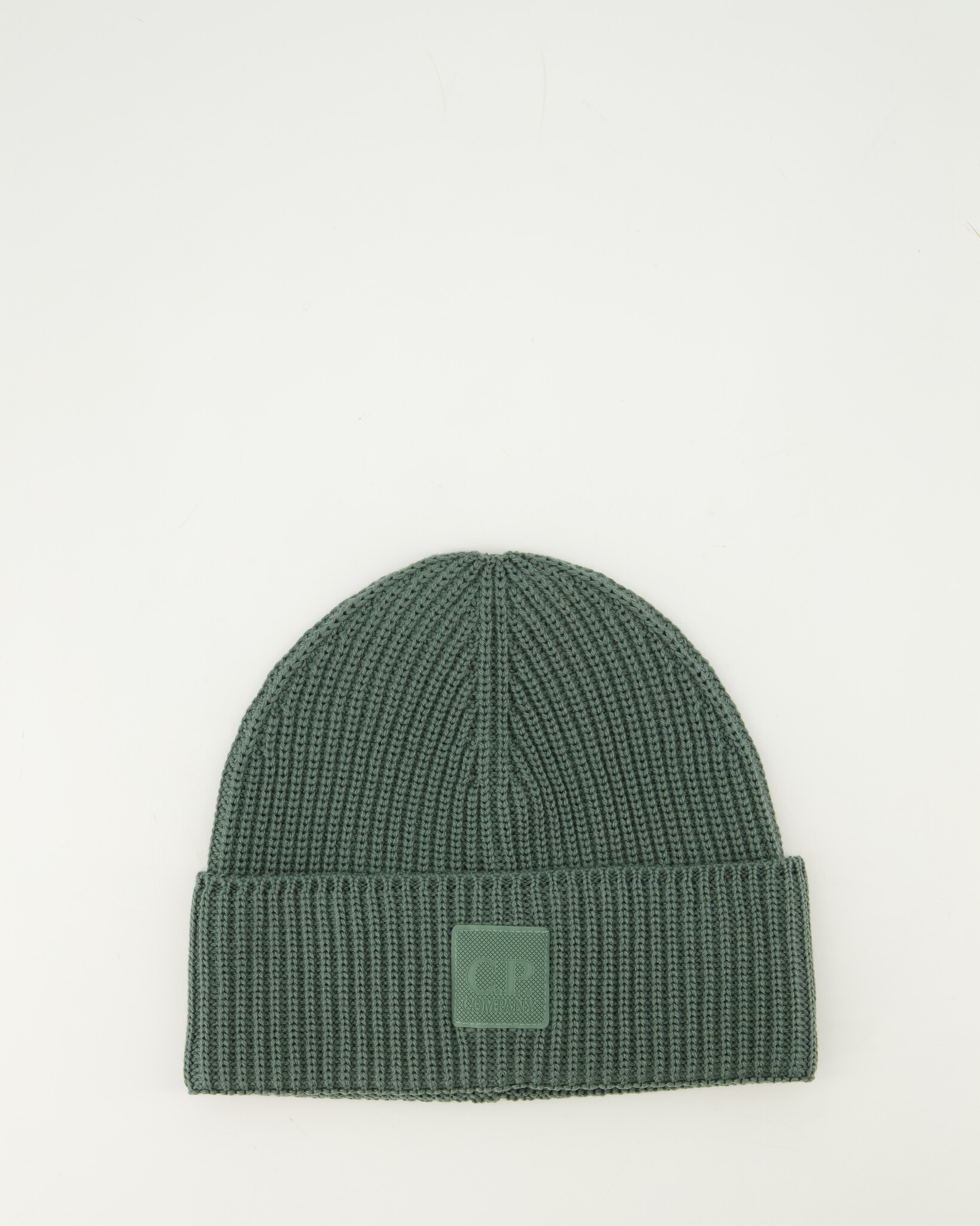 Groene Merino Wool Knit Beanie van het merk C.P. Company, ook bekend als de “Goggle Beanie” in een groene tint — een iconisch stuk uit de collectie van het merk