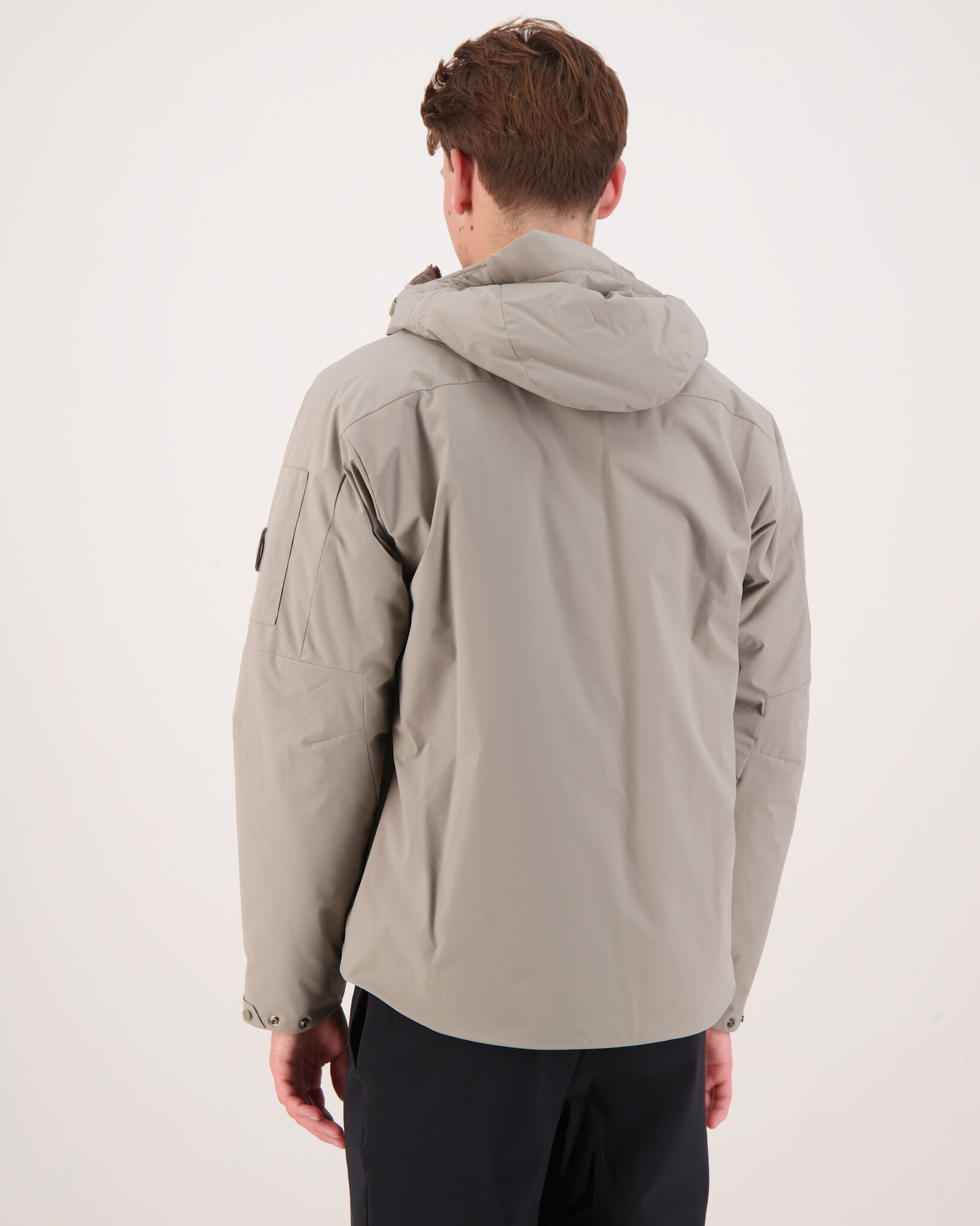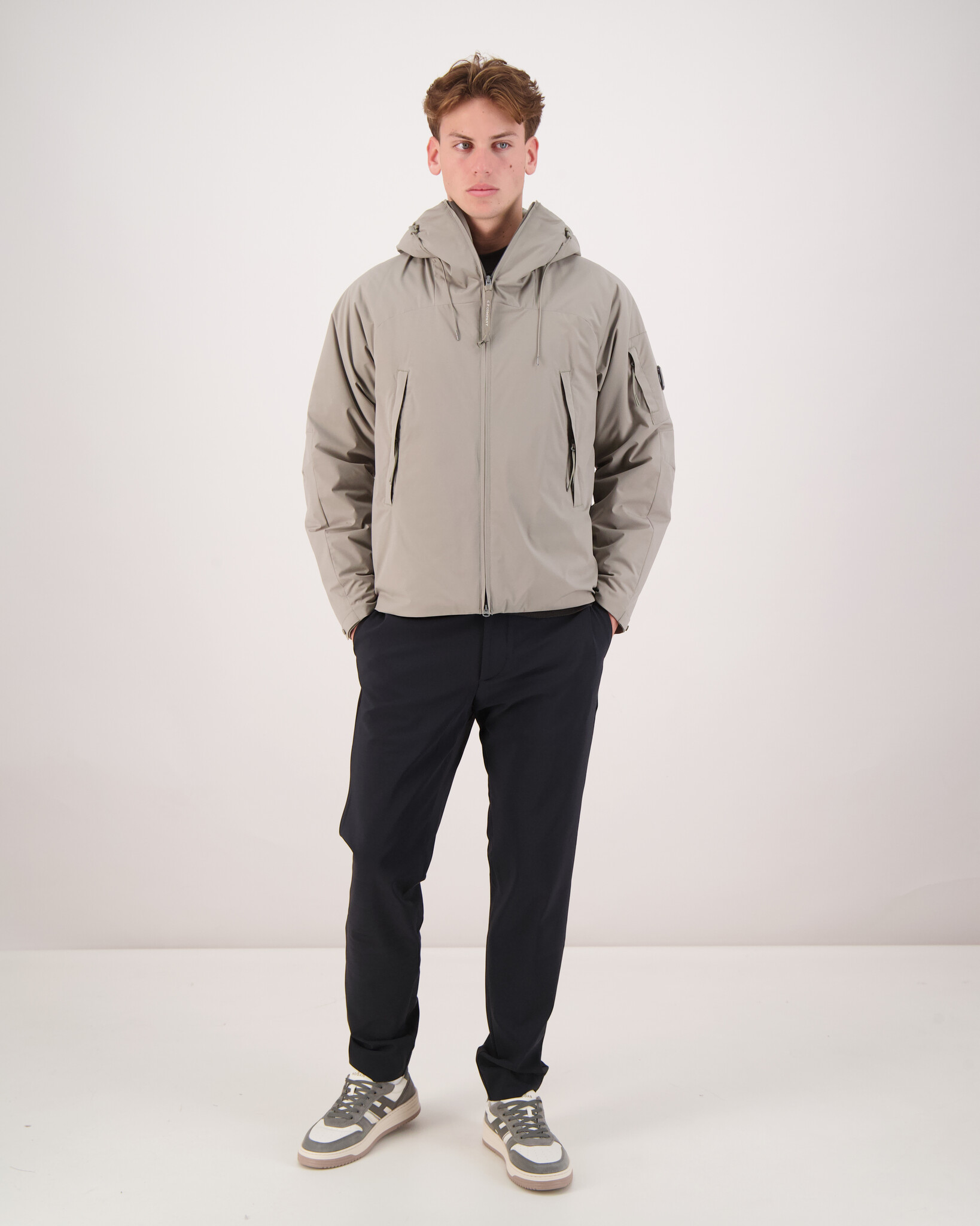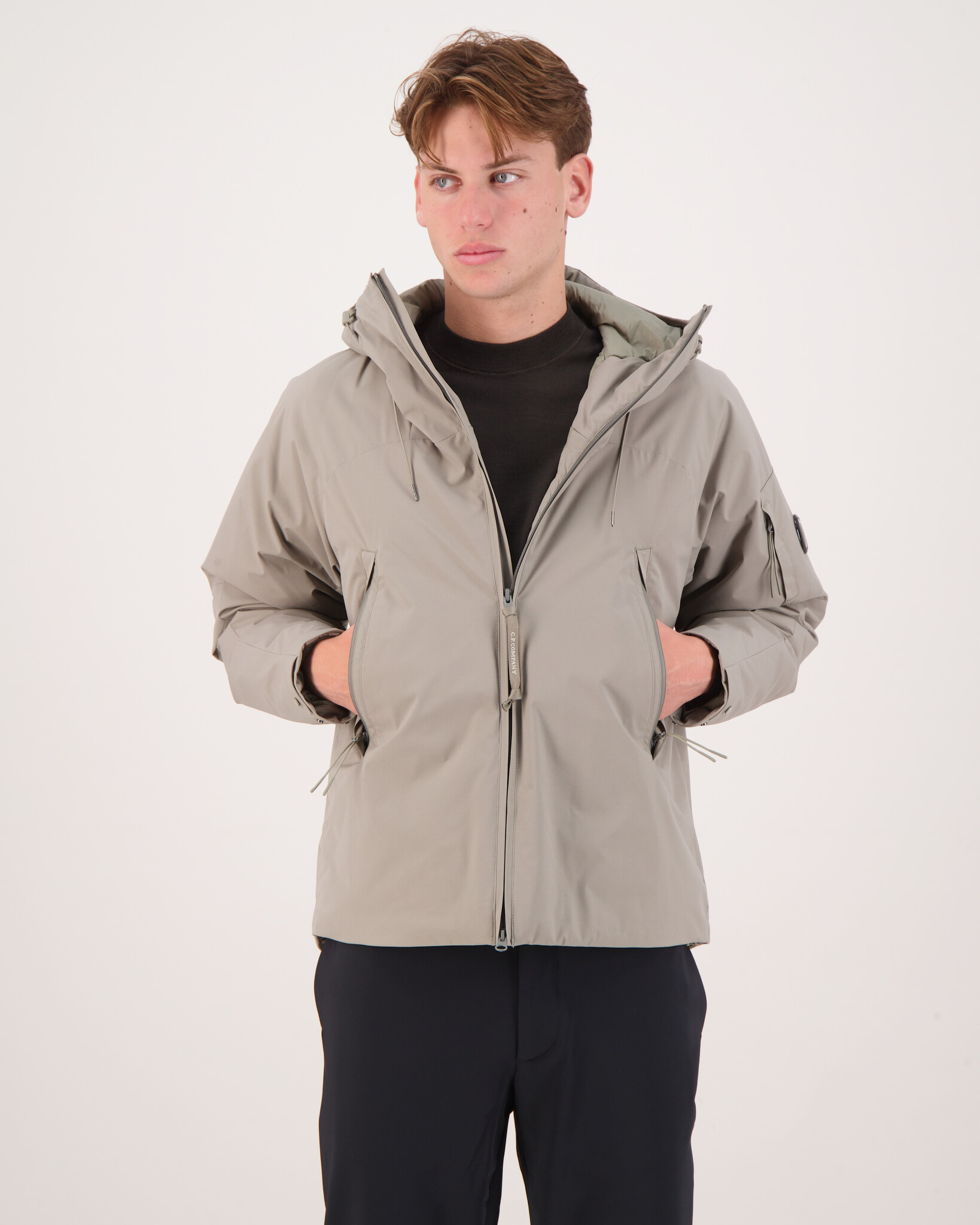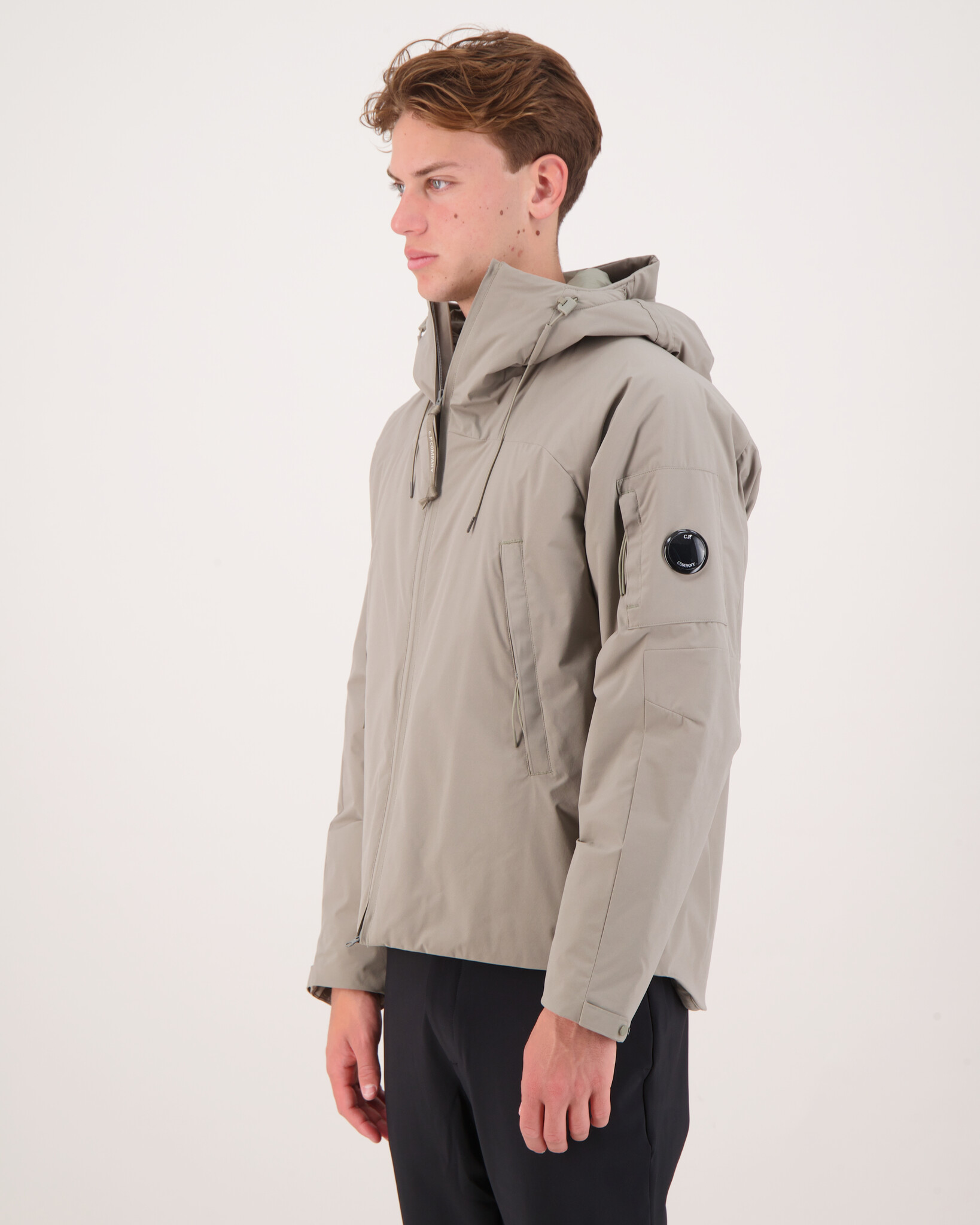Grijze PRO-TEK Jacket van het merk C.P Company. De jas is licht en warm met een vaste capuchon, twee zakken met rits aan de zijkanten