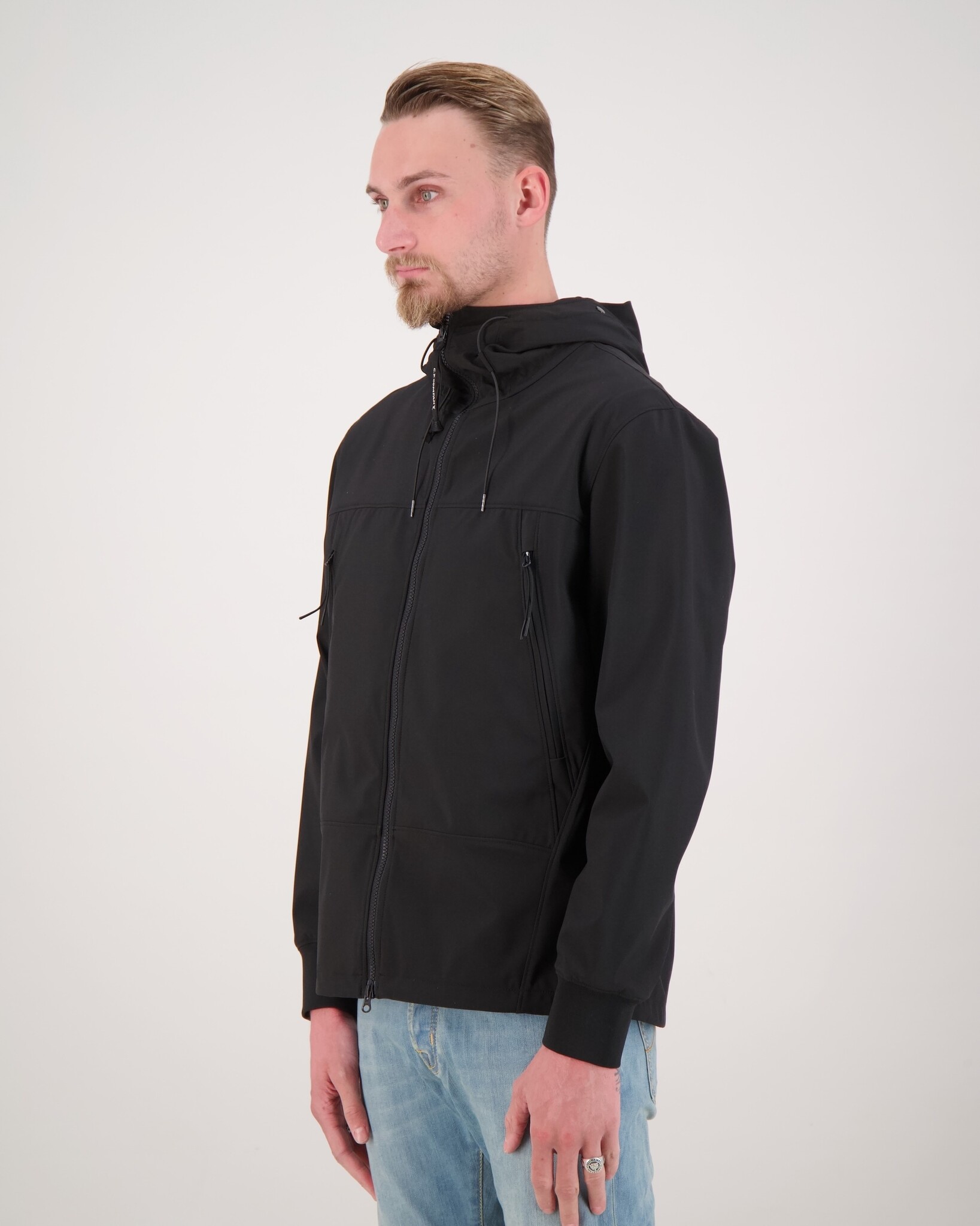 Zwarte Soft Shell Jacket van het merk C.P. Company. De jas heeft een vaste capuchon, twee steekzakken met een rits, een binnenzak en op de capuchon is de bekende Goggle te vinden.