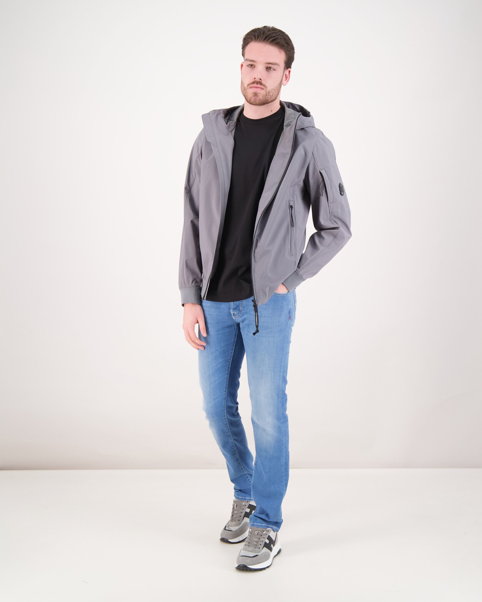 Grijze Soft Shell Jacket van het merk C.P. Company. De jas heeft een vaste capuchon, twee steekzakken met een rits, een binnenzak en op de arm is de bekende Goggle te vinden.