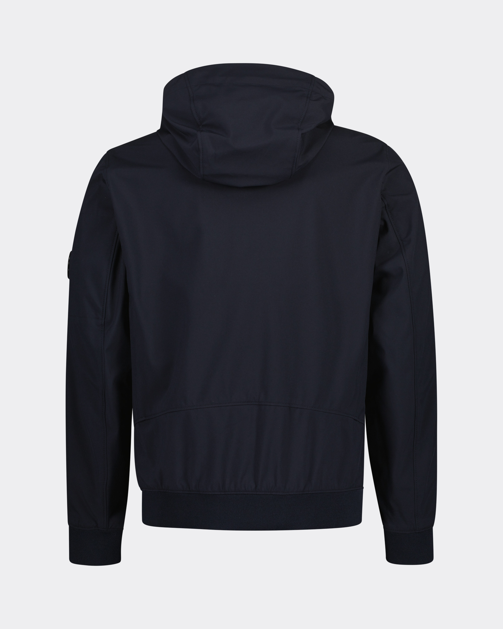 Marine Soft Shell Jacket van het merk C.P. Company. De jas heeft een vaste capuchon, twee steekzakken met een rits, een steekzak met knoop aan de binnenkant, een zakje met rits op de linkermouw en op de mouw het bekende Goggle logo.