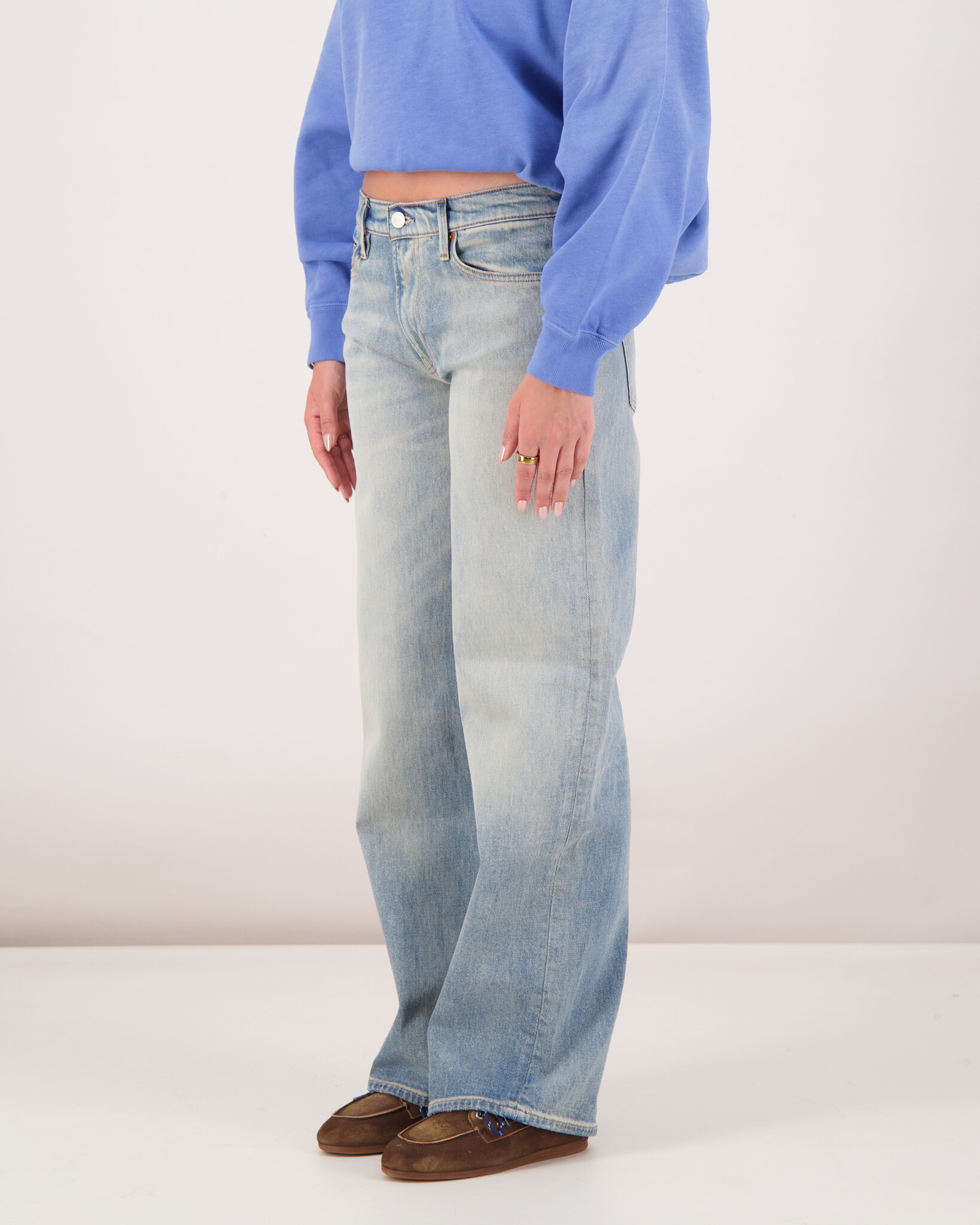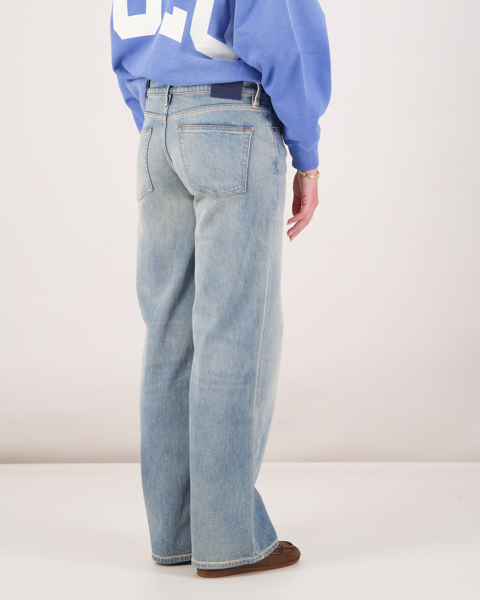Lichtblauwe Mio C Colombia Jeans van het merk Denham. Combineert eigentijdse stijl met klassieke denimwassing. Deze straight‑fit jeans heeft een mid‑rise taille en een ontspannen rechte pijp die zowel draagcomfort als een tijdloos silhouet biedt