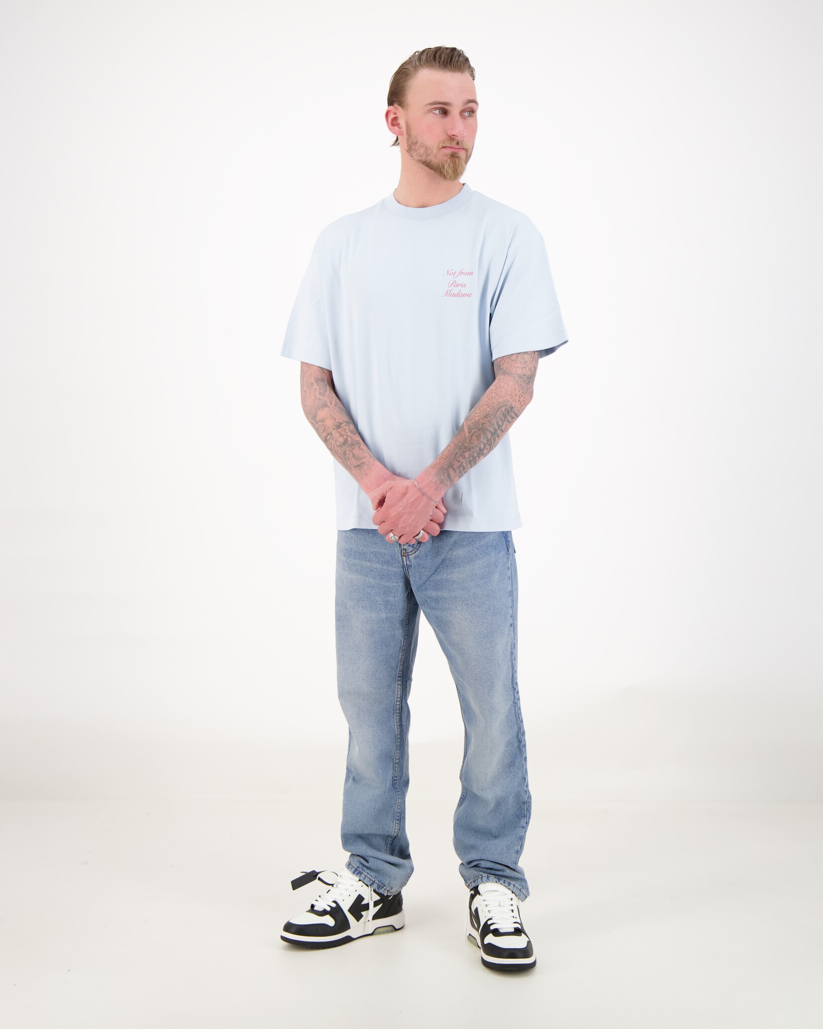 Lichtblauw Le T-Shirt Slogan Calligraphy van het merk Drôle de Monsieur. Interlock t-shirt met geribde hals heeft de ‘Not from Paris Madame’ slogan kalligrafisch gedrukt op de voor- en achterkant.