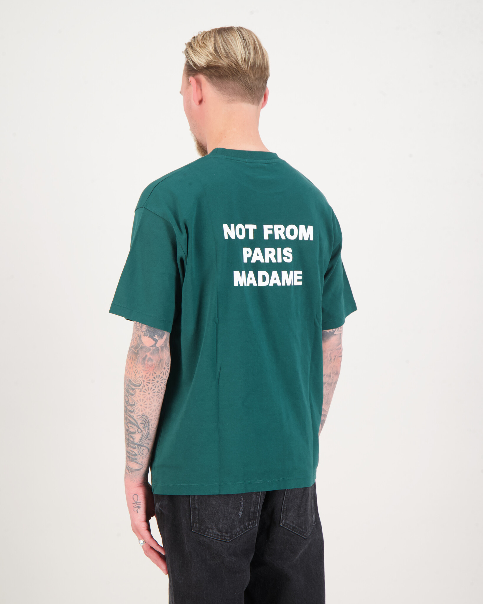 Donker Groene 'Le T-Shirt Slogan' van het merk Drôle de Monsieur. Het t-shirt met een geribde halslijn is bedrukt met de 'Not From Paris Madame' slogan.
